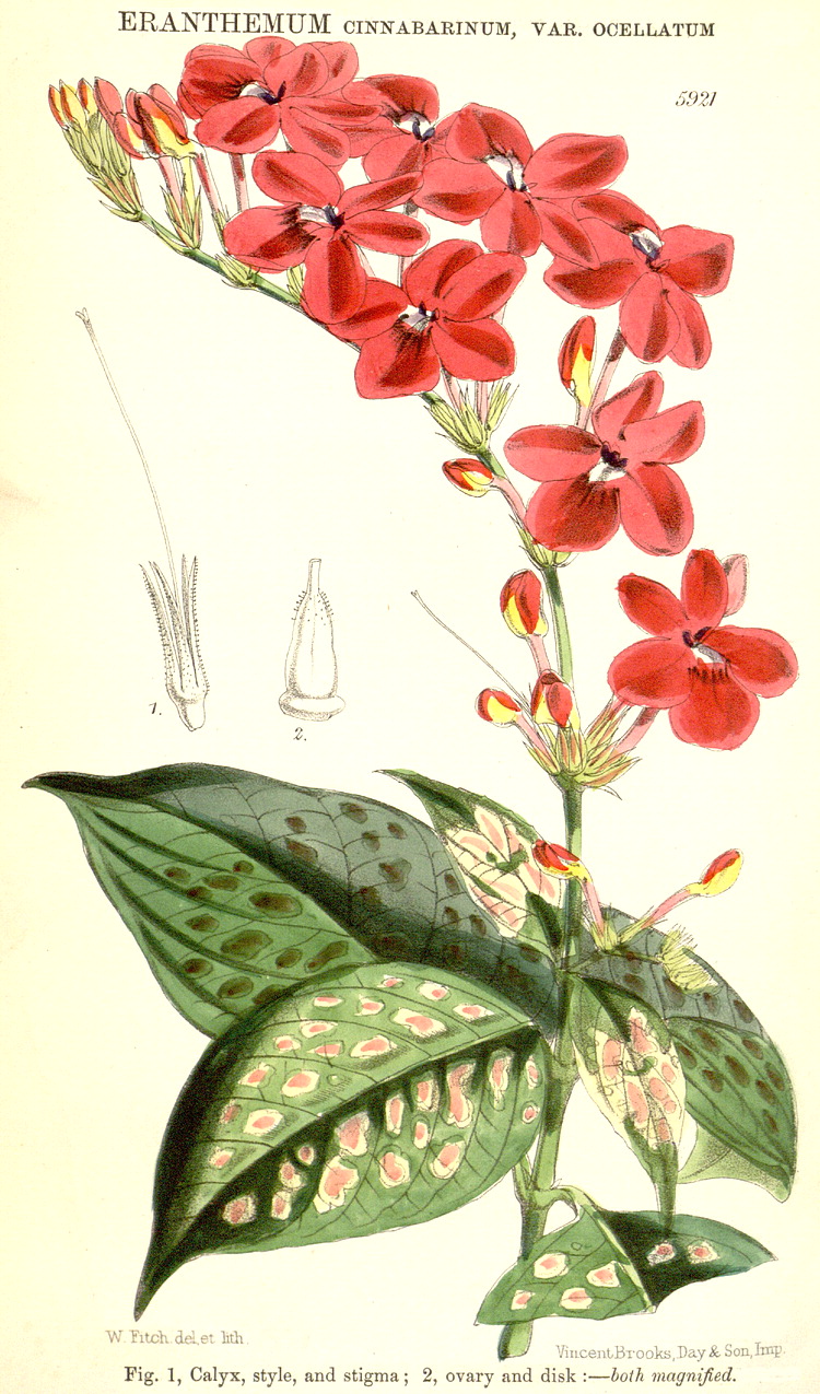 Illustrations. • Le Maout and Decaisne: Adhatoda (~Justicia), Ruellia. • Acanthus ilicifolius, as Dilivaria: Wight’s Figs. of Indian Plants 2 (1843). • Acanthus mollis (inflorescence, Le Maout and Decaisne). • Acanthus montanus: Bot. Mag. 91 (1865). • Ancylogyne longiflora: Bot. Mag. 92 (1866). • Anisotes parvifolius: Hook. Ic. Pl. 16 (1886). • Anisotes umbrosus: Hook. Ic. Pl. 33 (1935). • Aphelandra acanthifolia: Hook. Ic. Pl. 2 (1837). • Aphelandra aurantiaca var. nitens (as A. nitens): Bot. Mag. 94 (1868). • Aphelandra aurantiaca var. aurantiaca (as A. acutifolia): Bot. Mag. 95 (1869). • Aphelandra blanchetiana: Bot. Mag. 117 (1891). • Aphelandra chamissoniana: Bot. Mag. 108 (1882). • Aphelandra liboniana: Bot. Mag. 90 (1864). • Aphelandra pumila: Bot. Mag. 105 (1879). • Aphelandra sulphurea: Bot. Mag. 98 (1872). • Asystasia gangetica (as A. coromandeliana): Bot. Mag. 72 (1846). • Asystasia gangetica (as A. violacea): Bot. Mag. 97 (1871). • Asystasia macrophylla (as Dicentranthera): Bot. Mag. 94 (1868). • Asystasia scandens: Bot. Mag. 75 (1849). • cf. Barleria argentea, as Somalia diffusa: Hook. Ic. Pl. 16 (1886). • Barleria gibsonii: Bot. Mag. 93 (1867). • Barleria hochstetteri: Hook. Ic. Pl. 9 (1852). • Barleria mackenii: Bot. Mag. 96 (1870). • Barleria oenotheroides (as B. flava): Bot. Mag. 70 (1844). • Barleria repens: Bot. Mag. 113 (1887). • Barleria tetraglochin: Hook. Ic. Pl. 33 (1935). • Beloperone flaviflora: Hook. Ic. Pl. 32 (1927). • Blepharis chrysotricha (as B. hornbyae): Hook. Ic. Pl. 33 (1935). • Brachystephanus giganteus, as Oreacanthus mannii: Hook. Ic. Pl. 13 (1877–79). • Blepharis maderaspatensis, as B. boerhaviifolia: R. Wight, Ic. Pl. Indiae Orientalis 2 (1843). • Bravaisia tubiflora: Hook. Ic. Pl. 16 (1886). • Brillantaisia owariensis: Bot. Mag. 79 (1853). • Chamaeranthemum beyrichii var. beyrichii: Bot. Mag. 92 (1866). • Dicliptera lanceolaria (as Peristrophe): Bot. Mag. 92 (1866). • Eranthemum borneense: Bot. Mag. 109 (1883). • Eranthemum capense (as E. montanum): Bot. Mag. 69 (1843). • Eranthemum macrophyllum (as Daedalacanthus): Bot. Mag. 109 (1883). • Eranthemum pulchellum (as E.aspersum): Bot. Mag. 94 (1868). • Eranthemum pulchellum (as E. cinnabarinum var. ocellatum): Bot. Mag. 97 (1871). • Eranthemum strictum: Bot. Mag. 58 (1831). • Hydromestus maculatus: Bot. Mag. 77 (1851). • Hypoestes aristata: Bot. Mag. 102 (1876). • Hypoestes sanguinolenta: Bot. Mag. 91 (1865). • Isotheca alba: Hook. Ic. Pl. 32 (1927). • Justicia carthaginensis (as Beloperone violacea): Bot. Mag. 87 (1861). • Justicia chrysostephana (as Cyrtanthera): Bot. Mag. 97 (1871). • Justicia ciliata (as Beloperone): Bot. Mag. 97 (1871). • Justicia matammensis: Thonner. • Justicia cydoniifolia (as Adhatoda): Bot. Mag. 83 (1857). • Justicia peruviana: Bot. Mag. 430, 1799. • Justicia patentiflora: Hook. Ic. Pl. 28 (1905). • Justicia plumbaginifolia: Bot. Reg. 1657, 1835. • Justicia scheidweileri (as Porphyrocoma lanceolata): Bot. Mag. 71 (1845). • Justicia thunbergioides (as J. venusta): Bot. Reg. 1380, 1830. • Lankesteria barteri: Bot. Mag. 91 (1865). • Lepidagathis scariosa: R. Wight, Ic. Pl. Indiae Orientalis 2 (1843). • Megaskepasma erythrochlamys: Hook. Ic. Pl. 32 (1930). • Mackaya bella: Bot. Mag. 95 (1869). • Mackaya indica (as Thyrsacanthus indicus): Bot. Mag. 84 (1858). • Odontonema bracteolatum (as Thyrsacanthus): Bot. Mag. 75 (1849). • Odontonema schlomburgkiana (as Thysacanthus): Bot. Mag. 81 (1855). • Odontonema tubaeforme (as Thyrsacanthus strictus): Bot. Mag. 74 (1848). • Pachystachys coccinea: Bot. Mag. 432, 1799. • Pachystachys spicata (as Justicia carnea): Bot. Mag. 62 (1835). • Petalidium barlerioides: Bot. Mag. 70 (1844). • Phlogacanthus turgidus (as Meninia): Bot. Mag. 99 1873). • Phlogacanthus vitellinus: Bot. Reg. 1340, 1830. • Podorungia clandestina (as Warpuria): Hook. Ic. Pl. 30 (1911). • Pseuderanthemum albiflorum (as Eranthemum): Bot. Mag. 72 (1846). • Pseuderanthemum andersoni, as Eranthemum: Bot. Mag. 95 (1869). • Pseuderanthemum carruthersii (as Eranthemum reticulatum): Bot. Mag. 122 (1896). • Pseuderanthemum laxiflorum (as Eranthemum): Bot. Mag. 103 (1877). • Pseuderanthemum repandum subsp. tuberculatum (as Eranthemum tuberculatum): Bot. Mag. 89 (1863). • Pseuderanthemum seticalyx: Bot. Mag. 135 (1909). • Ruellia affinis (as Dipteracanthus): Bot. Mag. 89 (1863). • Ruellia baikiei (as Stephanophysum): Bot. Mag. 85 (1859). • Ruellia ciliatiflora: Bot. Mag. 66 (1839). • Ruellia calvescens, as Dipteracanthus: Bot. Mag. 85 (1859). • Ruellia elegans: Bot Mag. 62 (1835). • Ruellia haenkeana. var. haenkeana (as Stemonacanthus pearcei): Bot. Mag. 93 (1867). • Ruellia macrantha: Bot. Mag. 129 (1903). • Ruellia portellae: Bot. Mag. 106 (1880). • Ruellia spectabilis (as Dipteracanthus): Bot. Mag. 76 (1850). • Ruellia tubiflora (as R. purdieana): Bot. Mag. 73 (1847). • Ruspolia hypocrateriformis (as Eranthemum): Bot. Mag. 101 (1875). • Salpixantha coccinea: Bot. Mag. 71 (1845). • Sanchezia nobilis: Bot. Mag. 92 (1866). • Satanocrater paradoxa: Hook. Ic. Pl. 30 (1913). • Stenandrium guineense (as Crossandra): Bot. Mag. 104 (1878). • Strobilanthes anisophylla (as Goldfussia): Bot. Mag. 62 (1835). • Strobilanthes anisophylla (as Goldfussia isophylla): Bot. Mag. 74 (1848). • Strobilanthes callosus: Bot. Mag. 123 (1897). • Strobilanthes dyeriana: Bot. Mag. 124 (1898). • Strobilanthes glomerata (as Goldfussia): Bot. Mag. 68 (1841). • Strobilanthes gossypinus: Bot. Mag. 127 (1901). • Strobilanthes hamiltoniana (as S. coloratus): Bot. Mag. 113 (1887). • Strobilanthes lactatus: Bot. Mag. 74 (1848). • Strobilanthes oligocephala (as Goldfussia thomsonii): Bot. Mag. 85 (1859). • Strobilanthes sabiniana: Bot. Reg. 1238, 1829. • Strobilanthes scaber: as S. scabra, Bot. Reg. 32, 1841. Strobil