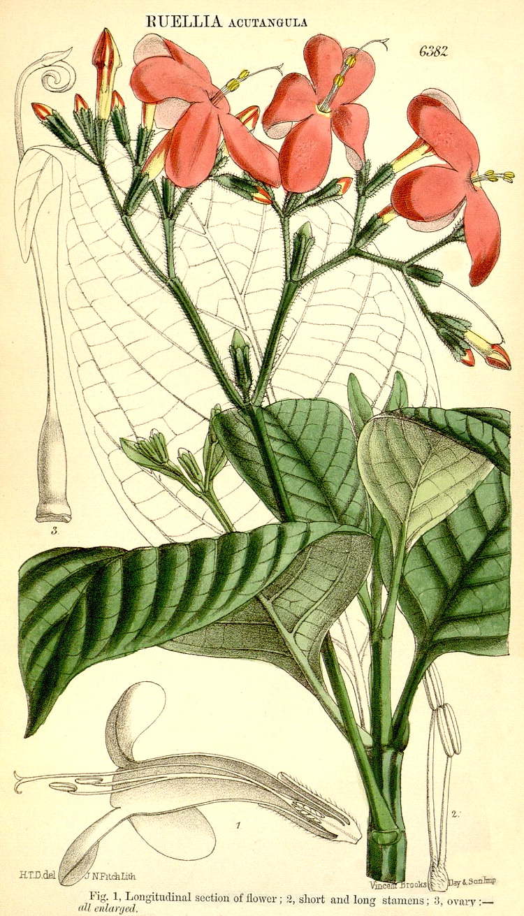 Illustrations. • Le Maout and Decaisne: Adhatoda (~Justicia), Ruellia. • Acanthus ilicifolius, as Dilivaria: Wight’s Figs. of Indian Plants 2 (1843). • Acanthus mollis (inflorescence, Le Maout and Decaisne). • Acanthus montanus: Bot. Mag. 91 (1865). • Ancylogyne longiflora: Bot. Mag. 92 (1866). • Anisotes parvifolius: Hook. Ic. Pl. 16 (1886). • Anisotes umbrosus: Hook. Ic. Pl. 33 (1935). • Aphelandra acanthifolia: Hook. Ic. Pl. 2 (1837). • Aphelandra aurantiaca var. nitens (as A. nitens): Bot. Mag. 94 (1868). • Aphelandra aurantiaca var. aurantiaca (as A. acutifolia): Bot. Mag. 95 (1869). • Aphelandra blanchetiana: Bot. Mag. 117 (1891). • Aphelandra chamissoniana: Bot. Mag. 108 (1882). • Aphelandra liboniana: Bot. Mag. 90 (1864). • Aphelandra pumila: Bot. Mag. 105 (1879). • Aphelandra sulphurea: Bot. Mag. 98 (1872). • Asystasia gangetica (as A. coromandeliana): Bot. Mag. 72 (1846). • Asystasia gangetica (as A. violacea): Bot. Mag. 97 (1871). • Asystasia macrophylla (as Dicentranthera): Bot. Mag. 94 (1868). • Asystasia scandens: Bot. Mag. 75 (1849). • cf. Barleria argentea, as Somalia diffusa: Hook. Ic. Pl. 16 (1886). • Barleria gibsonii: Bot. Mag. 93 (1867). • Barleria hochstetteri: Hook. Ic. Pl. 9 (1852). • Barleria mackenii: Bot. Mag. 96 (1870). • Barleria oenotheroides (as B. flava): Bot. Mag. 70 (1844). • Barleria repens: Bot. Mag. 113 (1887). • Barleria tetraglochin: Hook. Ic. Pl. 33 (1935). • Beloperone flaviflora: Hook. Ic. Pl. 32 (1927). • Blepharis chrysotricha (as B. hornbyae): Hook. Ic. Pl. 33 (1935). • Brachystephanus giganteus, as Oreacanthus mannii: Hook. Ic. Pl. 13 (1877–79). • Blepharis maderaspatensis, as B. boerhaviifolia: R. Wight, Ic. Pl. Indiae Orientalis 2 (1843). • Bravaisia tubiflora: Hook. Ic. Pl. 16 (1886). • Brillantaisia owariensis: Bot. Mag. 79 (1853). • Chamaeranthemum beyrichii var. beyrichii: Bot. Mag. 92 (1866). • Dicliptera lanceolaria (as Peristrophe): Bot. Mag. 92 (1866). • Eranthemum borneense: Bot. Mag. 109 (1883). • Eranthemum capense (as E. montanum): Bot. Mag. 69 (1843). • Eranthemum macrophyllum (as Daedalacanthus): Bot. Mag. 109 (1883). • Eranthemum pulchellum (as E.aspersum): Bot. Mag. 94 (1868). • Eranthemum pulchellum (as E. cinnabarinum var. ocellatum): Bot. Mag. 97 (1871). • Eranthemum strictum: Bot. Mag. 58 (1831). • Hydromestus maculatus: Bot. Mag. 77 (1851). • Hypoestes aristata: Bot. Mag. 102 (1876). • Hypoestes sanguinolenta: Bot. Mag. 91 (1865). • Isotheca alba: Hook. Ic. Pl. 32 (1927). • Justicia carthaginensis (as Beloperone violacea): Bot. Mag. 87 (1861). • Justicia chrysostephana (as Cyrtanthera): Bot. Mag. 97 (1871). • Justicia ciliata (as Beloperone): Bot. Mag. 97 (1871). • Justicia matammensis: Thonner. • Justicia cydoniifolia (as Adhatoda): Bot. Mag. 83 (1857). • Justicia peruviana: Bot. Mag. 430, 1799. • Justicia patentiflora: Hook. Ic. Pl. 28 (1905). • Justicia plumbaginifolia: Bot. Reg. 1657, 1835. • Justicia scheidweileri (as Porphyrocoma lanceolata): Bot. Mag. 71 (1845). • Justicia thunbergioides (as J. venusta): Bot. Reg. 1380, 1830. • Lankesteria barteri: Bot. Mag. 91 (1865). • Lepidagathis scariosa: R. Wight, Ic. Pl. Indiae Orientalis 2 (1843). • Megaskepasma erythrochlamys: Hook. Ic. Pl. 32 (1930). • Mackaya bella: Bot. Mag. 95 (1869). • Mackaya indica (as Thyrsacanthus indicus): Bot. Mag. 84 (1858). • Odontonema bracteolatum (as Thyrsacanthus): Bot. Mag. 75 (1849). • Odontonema schlomburgkiana (as Thysacanthus): Bot. Mag. 81 (1855). • Odontonema tubaeforme (as Thyrsacanthus strictus): Bot. Mag. 74 (1848). • Pachystachys coccinea: Bot. Mag. 432, 1799. • Pachystachys spicata (as Justicia carnea): Bot. Mag. 62 (1835). • Petalidium barlerioides: Bot. Mag. 70 (1844). • Phlogacanthus turgidus (as Meninia): Bot. Mag. 99 1873). • Phlogacanthus vitellinus: Bot. Reg. 1340, 1830. • Podorungia clandestina (as Warpuria): Hook. Ic. Pl. 30 (1911). • Pseuderanthemum albiflorum (as Eranthemum): Bot. Mag. 72 (1846). • Pseuderanthemum andersoni, as Eranthemum: Bot. Mag. 95 (1869). • Pseuderanthemum carruthersii (as Eranthemum reticulatum): Bot. Mag. 122 (1896). • Pseuderanthemum graciliflorum (as Eranthemum palatiferum): Bot. Mag. 98 (1872). • Pseuderanthemum laxiflorum (as Eranthemum): Bot. Mag. 103 (1877). • Pseuderanthemum repandum subsp. tuberculatum (as Eranthemum tuberculatum): Bot. Mag. 89 (1863). • Pseuderanthemum seticalyx: Bot. Mag. 135 (1909). • Ruellia acutangula: Bot. Mag. 104 (1878). • Ruellia affinis (as Dipteracanthus): Bot. Mag. 89 (1863). • Ruellia baikiei (as Stephanophysum): Bot. Mag. 85 (1859). • Ruellia ciliatiflora: Bot. Mag. 66 (1839). • Ruellia calvescens, as Dipteracanthus: Bot. Mag. 85 (1859). • Ruellia elegans: Bot Mag. 62 (1835). • Ruellia haenkeana. var. haenkeana (as Stemonacanthus pearcei): Bot. Mag. 93 (1867). • Ruellia macrantha: Bot. Mag. 129 (1903). • Ruellia portellae: Bot. Mag. 106 (1880). • Ruellia spectabilis (as Dipteracanthus): Bot. Mag. 76 (1850). • Ruellia tubiflora (as R. purdieana): Bot. Mag. 73 (1847). • Ruspolia hypocrateriformis (as Eranthemum): Bot. Mag. 101 (1875). • Salpixantha coccinea: Bot. Mag. 71 (1845). • Sanchezia nobilis: Bot. Mag. 92 (1866). • Satanocrater paradoxa: Hook. Ic. Pl. 30 (1913). • Stenandrium guineense (as Crossandra): Bot. Mag. 104 (1878). • Strobilanthes anisophylla (as Goldfussia): Bot. Mag. 62 (1835). • Strobilanthes anisophylla (as Goldfussia isophylla): Bot. Mag. 74 (1848). • Strobilanthes callosus: Bot. Mag. 123 (1897). • Strobilanthes dyeriana: Bot. Mag. 124 (1898). • Strobilanthes glomerata (as Goldfussia): Bot. Mag. 68 (1841). • Strobilanthes gossypinus: Bot. Mag. 127 (1901). • Strobilanthes hamiltoniana (as S. coloratus): Bot. Mag. 113 (1887). • Strobilanthes lactatus: Bot. Mag. 74 (1848). • Strobilanthes oligocephala (as Goldfussia thomsonii): Bot. Mag.