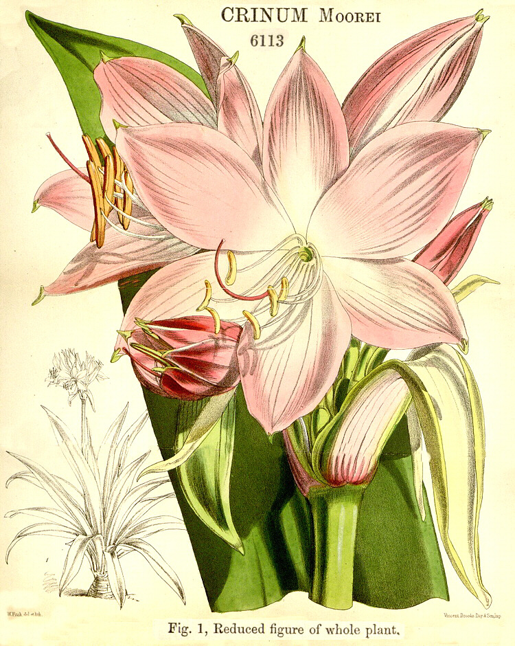 Illustrations. • Le Maout and Decaisne: Leucojum. • Le Maout and Decaisne: Narcissus, Galanthus, Oporanthus. • Narcissus, Galanthus, Leucojum (B. Ent. compilation, 1824–35). • Amaryllis belladonna (~ Brunsvigia rosea?): as A. banksiana, Bot. Reg. 11, 1842. Amaryllis banksiana Lindl., = A. belladonna or Brunsvigia rosea? The distinguishing character states, if they are real, are naccessible from the plate and Lindley’s description. 1, vertical section of one cell of the ovary. 2, transverse section of the ambiguously uni- or trilocular ovary. • Apodolirion buchananii: Hook. Ic. Pl. 14 (1882). • Caliphruria hartwegiana: Bot. Mag. 102 (1876). • Caliphruria subdentata (as Calliphruria): Bot. Mag. 103 (1877). • Calostemma luteum: Bot. Reg. xxvi, 19 (1840). • Calostemma purpureum: as C. carneum, Bot. Reg. xxvi, 26 (1840). • Clianthus croceus (as Stenomesson): Bot. Mag. 64 (1837). • Clinanthus coccineus (as Coburgia coccinea): Bot. Mag. 67 (1841). • Clinanthus incarnatus (as Coburgia trichroma): Bot. Mag. 94 (1868). • Clivia gardenii: Bot. Mag. 82 (1856). • Crinum abyssinicum, habit and LS flower: Thonner. • Crinum brachynema: Bot. Mag. 97 (1871). • Crinum jagus (as C. giganteum): Bot. Mag. 86 (1860). • Crinum moorei: Bot. Mag. 100 (1874). • Crinum natans: Bot. Mag. 128 (1902). • Crinum roseum: as C. variabile var. roseum, Bot. Reg. 1844, 9. • Crinum stuhlmannii subsp. delagoense (as C. forbesianum): Bot. Mag. 107 (1881). • Cyrtanthus brachyscyphus (as C. parviflorus): Bot. Mag. 125 (1899). • Cyrtanthus breviflorus (as Anoiganthus): Bot. Mag. 115 (1889). • Cyrtanthus ochroluceus (as C. lutescens): Bot. Mag. 89 (1863). • Cyrtanthus carneus: Bot. Reg. 1462, 1831. • Cyrtanthus huttonii: Bot. Mag. 122 (1896. • Galanthus nivalis: Eng. Bot. 1507 (1869). • Eucharis X-grandiflora (= moorei x sanderii), as E. mastersii: Bot. Mag. 111 (1885). • Eucharis sanderii: Bot. Mag. 109 (1883). • Eucrosia aurantiaca (as Callipsyche): Bot. Mag. 111 (1885). • Galanthis elwesii: Bot. Mag. 101 (1875). • Griffinia blumenavia: Bot. Mag. 93 (1867). • Griffinia hyacinthina (as G. dryades): Bot. Mag. 95 (1869). • Habranthus tubispathus (as H. andersoni): Bot. Reg. 1345, 1830. • Habranthus brachyandrus (as Hippeastrum): Bot. Mag. 120 (1894). • Habranthus gracilifolius var. boothianus: Bot. Reg. 1967, 1837. • Haemanthus deformis: Bot. Mag. 97 (1871). • Haemanthus deformis, as H. baurii: Bot. Mag. 112 (1886). • Haemanthus sanguineus (as H. incarnatus): Bot. Mag. 91 (1865). • Hippeastrum cybister: as Sprekelia, Bot. Reg. xxvi, 33 (1840). Hippeastrum cybister. 1, flower with perianth and stamens cut away, and the inferior ovary sectioned vertically. 3, transverse section of the ovary. 3, detail of the style. • Hippeastrum elegans (as H. solandriflorum): Bot. Mag. 66 (1840). • Hippeastrum harrisonii: Bot. Mag. 126 (1900). • Hippeastrum pardinum (as Amaryllis): Bot. Mag. 93 (1867). • Hippeastrum pratense: as Habranthus pratensis, Bot. Reg. 35, 1842. • Hymenocallis harrisiana: Bot. Mag. 107 (1881). • Hymenocallis schizostephana: Bot. Mag. 127 (1901). • Leucojum vernum: Bot. Mag. 2 (1788). • Lycoris squamigera: Bot. Mag. 123 (1897). • Narcissus broussonetii: Bot. Mag. 114 (1888). • Narcissus cantabricus subsp. monophyllus (as N. bulbocodium var. monophyllus): Bot. Mag. 96 (1870). • Narcissus cernuus (as N. pallidulus), N. graellsii (as N. bulbocodium), N. rupicola): Bot. Mag. 106 (1880). • Narcissus triandrus: Bot. Mag. 2 (1788). • Narcissus papyraceus subsp. pachybolus: Bot. Mag. 111 (1885). • Narcissus poeticus: Eng. Bot. 1504 (1869). • Narcissus pseudonarcissus: Eng. Bot. 1388 (1869). • Narcissus pseudonarcissus ssp. major: Bot. Mag. 2, 1788. • Assorted cultivated Narcissi: Bot. Reg. 29, 38 (1843). • Nerine angustifolia: Pole Evans, Fl. Pl. S. Africa 17 (1937). • Nerine bowdenii: Bot. Mag. 133 (1907). • Nerine filifolia: Bot. Mag. 107 (1881). • Nerine pudica: Bot. Mag. 97 (1871). • Pancratium maritimum: Lindley. • Phaedranassa carmiolii: Bot. Mag. 137 (1911). • Phaedranassa dubia (as P. obtusa): Bot. Mag. 89 (1863). • Phycella herbertiana: Bot. Reg. 1341, 1830. • Placea ornata: Bot. Reg. 50, 1841. • Pyrolirion arvense (as P. aureum): Bot. Reg. 1724, 1835. • Rhodophiala fulgens (as Habranthus): Bot. Mag. 92 (1866). • Rhodophiala pratensis (as Habranthus pratensis var. quadriflora): Bot. Mag. 68 (1842). • Scadoxus cinnabarinus (as Haemanthus): Bot. Mag. 88 (1862). • Scadoxus multiflorus (as Haemanthus tenuiflorus var. coccineus): Bot. Mag. 97 (1871). • Scadoxus multiflorus subsp. katherinae (as Haemanthus katherinae): Bot. Mag. 110 (1884). • Scadoxus puniceus (as Haemanthus insignis): Bot. Mag. 79 (1853). • Scadoxus puniceus (as Haemanthus natalensis): Bot. Mag. 89 (1863). • Sprekelia formosissima, as Amaryllis: Bot. Mag. 2 (1788). • Sprekelia formosissima: as S. glauca, Bot. Reg. 16, 1841. • Stenomesson aurantiacum: as S. hartwegii, Bot. Reg. 1844, 42. • Stenomesson flavum (as S. latifolium): Bot. Mag. 67 (1840). • Stenomesson flavum: Bot. Reg 29 (2), 1843. • Stenomesson luteoviride: Bot. Mag. 106 (1880). • Stenomesson miniatum (as Urceolina peruviana): Bot. Reg. 1839, 68. • Sternbergia clusiana, as S. macrantha: Bot. Mag. 122 (1896). • Sternbergia vernalis (as S. fischeriana): Bot. Mag. 121 (1895). • Urceocharis edentata: Bot. Mag. 137 (1911). • Urceolina bakeriana: Bot. Mag. 116 (1890). • Urceolina grandiflora (as Eucharis): Bot. Mag. 83 (1857). • Urceolina latifolia (as Leperiza): Bot. Mag. 82 (1856). • Urceolina urceolata (as U. pendula): Bot. Mag. 90 (1864). • Worsleya procera (as Amaryllis rayneri): Bot. Mag. 97 (1871). • Zephyranthes citrina: Bot. Mag. 108 (1882). • Zephyranthes drummondii (as Cooperia pedunculata): Bot. Mag. 66 (1839). • Zephyranthes americana (as Haylockia pusilla): Bot. Mag. 126 (1900). • Zephyranthes chlorosolen (as C