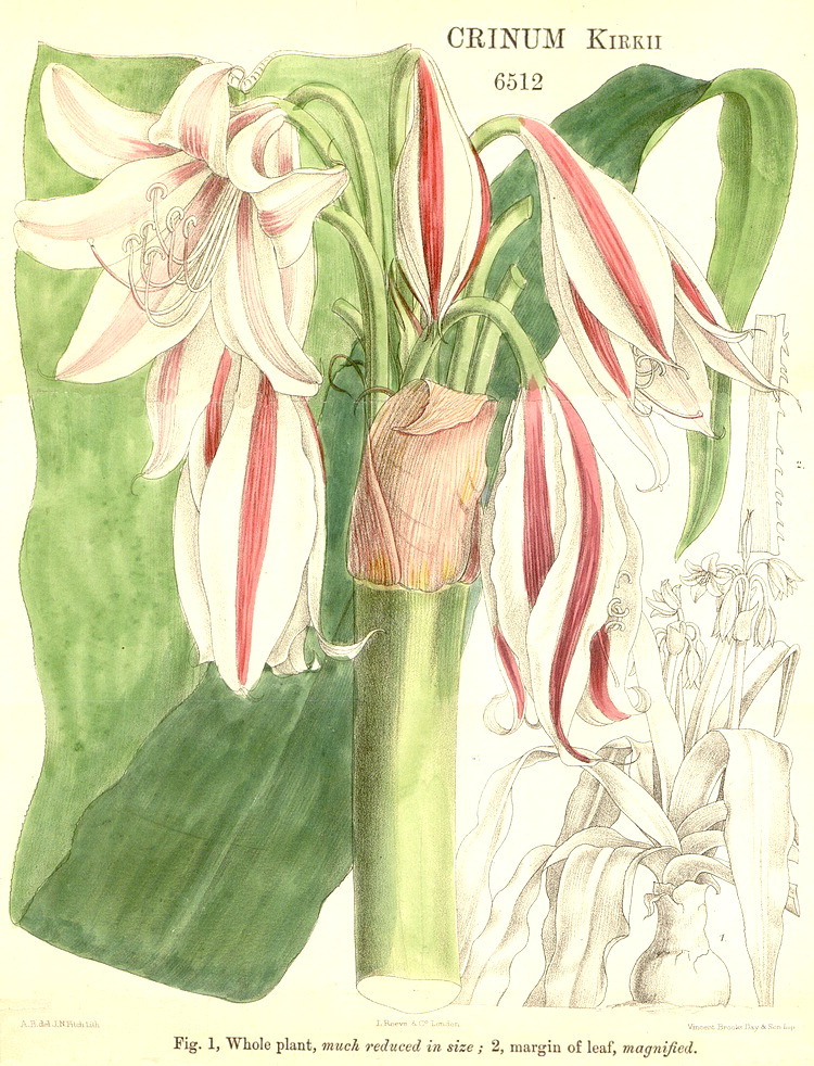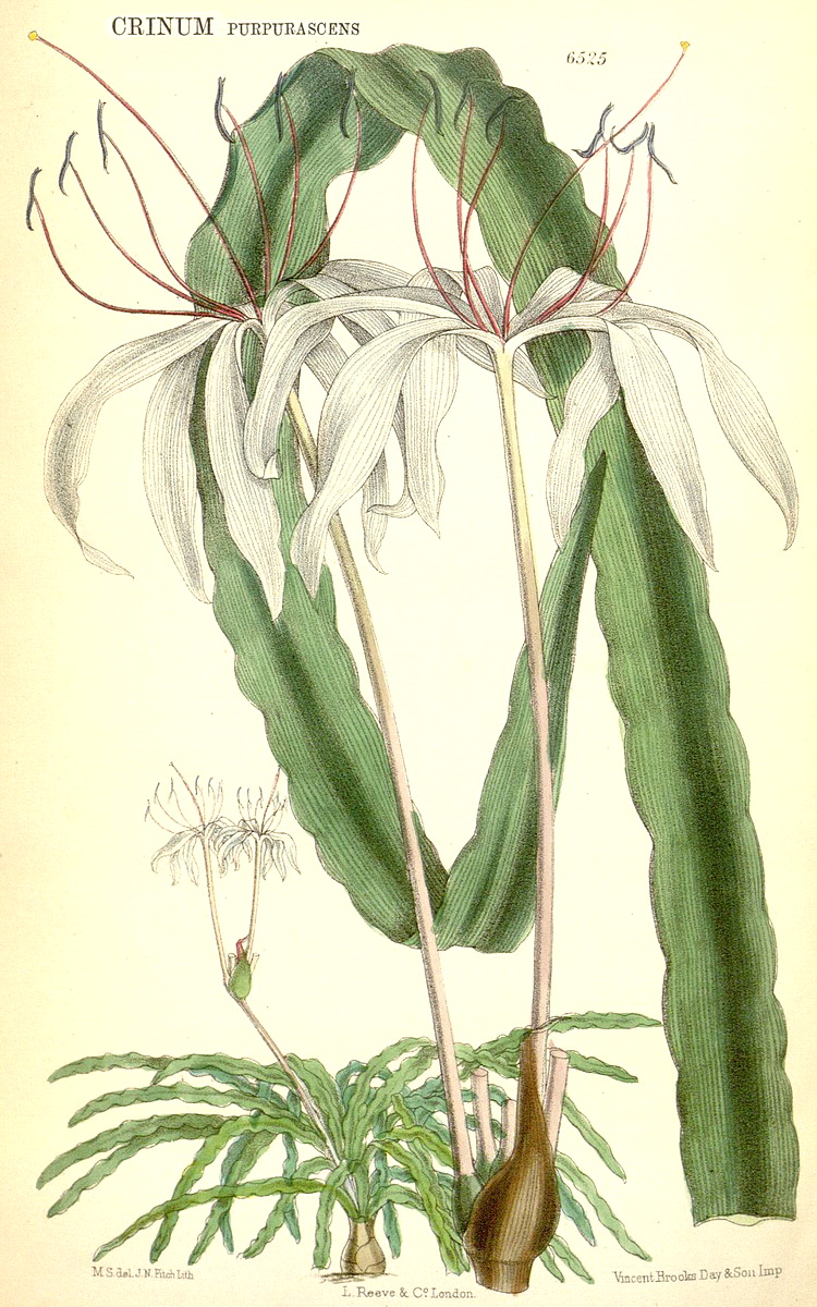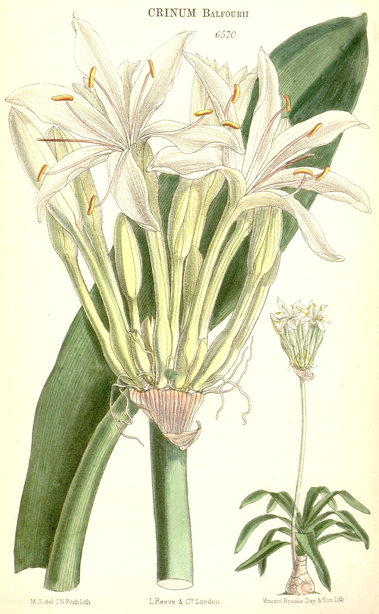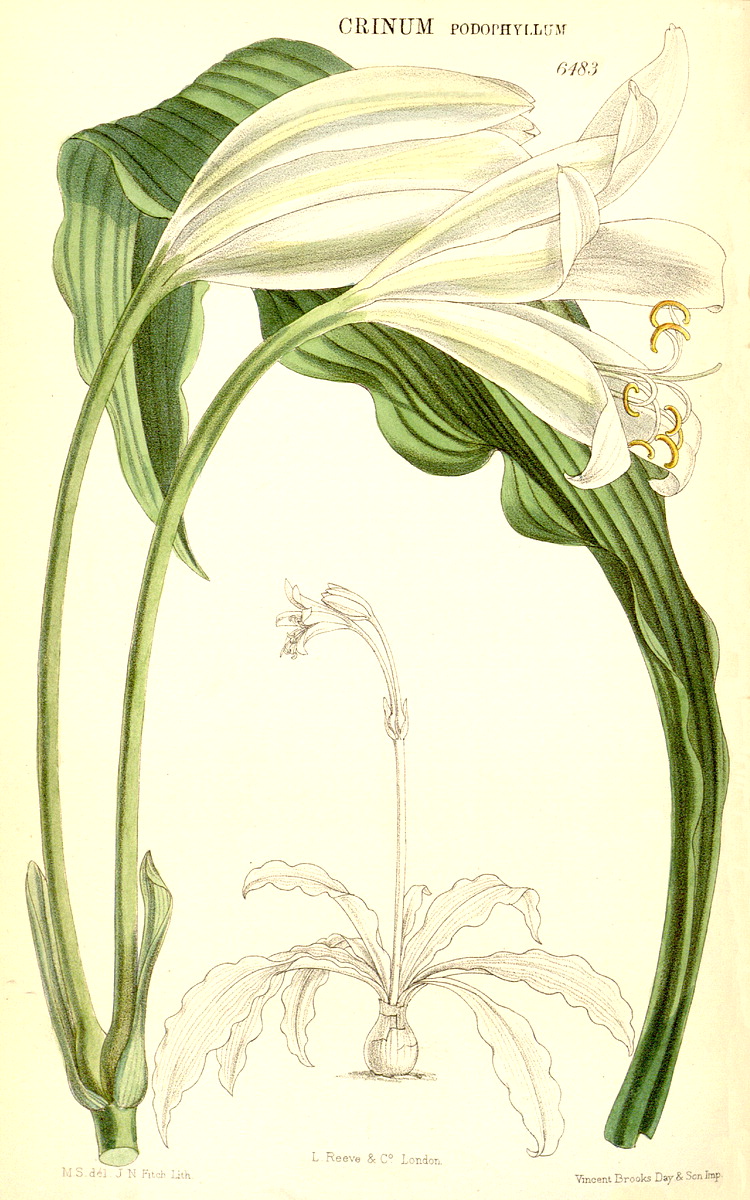Illustrations. • Le Maout and Decaisne: Leucojum. • Le Maout and Decaisne: Narcissus, Galanthus, Oporanthus. • Narcissus, Galanthus, Leucojum (B. Ent. compilation, 1824–35). • Amaryllis belladonna (~ Brunsvigia rosea?): as A. banksiana, Bot. Reg. 11, 1842. Amaryllis banksiana Lindl., = A. belladonna or Brunsvigia rosea? The distinguishing character states, if they are real, are naccessible from the plate and Lindley’s description. 1, vertical section of one cell of the ovary. 2, transverse section of the ambiguously uni- or trilocular ovary. • Apodolirion buchananii: Hook. Ic. Pl. 14 (1882). • Caliphruria hartwegiana: Bot. Mag. 102 (1876). • Caliphruria subdentata (as Calliphruria): Bot. Mag. 103 (1877). • Calostemma luteum: Bot. Reg. xxvi, 19 (1840). • Calostemma purpureum: as C. carneum, Bot. Reg. xxvi, 26 (1840). • Clianthus croceus (as Stenomesson): Bot. Mag. 64 (1837). • Clinanthus coccineus (as Coburgia coccinea): Bot. Mag. 67 (1841). • Clinanthus incarnatus (as Coburgia trichroma): Bot. Mag. 94 (1868). • Clivia gardenii: Bot. Mag. 82 (1856). • Crinum abyssinicum, habit and LS flower: Thonner. • Crinum balfourii: Bot. Mag. 107 (1891). • Crinum brachynema: Bot. Mag. 97 (1871). • Crinum jagus (as C. giganteum): Bot. Mag. 86 (1860). • Crinum jagus (as C. podophyllum): Bot. Mag. 106 1880). • Crinum kirkii: Bot. Mag. 106 (1880). • Crinum macowanii: Bot. Mag. 104 (1878). • Crinum moorei: Bot. Mag. 100 (1874). • Crinum natans: Bot. Mag. 128 (1902). • Crinum purpurascens: Bot. Mag. 106 (1880). • Crinum roseum: as C. variabile var. roseum, Bot. Reg. 1844, 9. • Crinum stuhlmannii subsp. delagoense (as C. forbesianum): Bot. Mag. 107 (1881). • Cyrtanthus brachyscyphus (as C. parviflorus): Bot. Mag. 125 (1899). • Cyrtanthus breviflorus (as Anoiganthus): Bot. Mag. 115 (1889). • Cyrtanthus ochroluceus (as C. lutescens): Bot. Mag. 89 (1863). • Cyrtanthus carneus: Bot. Reg. 1462, 1831. • Cyrtanthus huttonii: Bot. Mag. 122 (1896. • Galanthus nivalis: Eng. Bot. 1507 (1869). • Eucharis X-grandiflora (= moorei x sanderii), as E. mastersii: Bot. Mag. 111 (1885). • Eucharis sanderii: Bot. Mag. 109 (1883). • Eucrosia aurantiaca (as Callipsyche): Bot. Mag. 111 (1885). • Galanthis elwesii: Bot. Mag. 101 (1875). • Griffinia blumenavia: Bot. Mag. 93 (1867). • Griffinia hyacinthina (as G. dryades): Bot. Mag. 95 (1869). • Griffinia ornata: Bot. Mag. 104 (1878). • Habranthus tubispathus (as H. andersoni): Bot. Reg. 1345, 1830. • Habranthus brachyandrus (as Hippeastrum): Bot. Mag. 120 (1894). • Habranthus gracilifolius var. boothianus: Bot. Reg. 1967, 1837. • Haemanthus deformis: Bot. Mag. 97 (1871). • Haemanthus deformis, as H. baurii: Bot. Mag. 112 (1886). • Haemanthus sanguineus (as H. incarnatus): Bot. Mag. 91 (1865). • Hippeastrum cybister: as Sprekelia, Bot. Reg. xxvi, 33 (1840). Hippeastrum cybister. 1, flower with perianth and stamens cut away, and the inferior ovary sectioned vertically. 3, transverse section of the ovary. 3, detail of the style. • Hippeastrum elegans (as H. solandriflorum): Bot. Mag. 66 (1840). • Hippeastrum harrisonii: Bot. Mag. 126 (1900). • Hippeastrum pardinum (as Amaryllis): Bot. Mag. 93 (1867). • Hippeastrum pratense: as Habranthus pratensis, Bot. Reg. 35, 1842. • Hymenocallis harrisiana: Bot. Mag. 107 (1881). • Hymenocallis schizostephana: Bot. Mag. 127 (1901). • Leptochiton quitoensis (as Ismene tenuifolia): Bot. Mag. 104 (1878). • Leucojum vernum: Bot. Mag. 2 (1788). • Lycoris squamigera: Bot. Mag. 123 (1897). • Narcissus broussonetii: Bot. Mag. 114 (1888). • Narcissus cantabricus subsp. monophyllus (as N. bulbocodium var. monophyllus): Bot. Mag. 96 (1870). • Narcissus cernuus (as N. pallidulus), N. graellsii (as N. bulbocodium), N. rupicola): Bot. Mag. 106 (1880). • Narcissus triandrus: Bot. Mag. 2 (1788). • Narcissus papyraceus subsp. pachybolus: Bot. Mag. 111 (1885). • Narcissus poeticus: Eng. Bot. 1504 (1869). • Narcissus pseudonarcissus: Eng. Bot. 1388 (1869). • Narcissus pseudonarcissus ssp. major: Bot. Mag. 2, 1788. • Assorted cultivated Narcissi: Bot. Reg. 29, 38 (1843). • Nerine angustifolia: Pole Evans, Fl. Pl. S. Africa 17 (1937). • Nerine bowdenii: Bot. Mag. 133 (1907). • Nerine filifolia: Bot. Mag. 107 (1881). • Nerine pudica: Bot. Mag. 97 (1871). • Pancratium maritimum: Lindley. • Phaedranassa carmiolii: Bot. Mag. 137 (1911). • Phaedranassa dubia (as P. obtusa): Bot. Mag. 89 (1863). • Phycella herbertiana: Bot. Reg. 1341, 1830. • Placea ornata: Bot. Reg. 50, 1841. • Pyrolirion arvense (as P. aureum): Bot. Reg. 1724, 1835. • Rhodophiala fulgens (as Habranthus): Bot. Mag. 92 (1866). • Rhodophiala pratensis (as Habranthus pratensis var. quadriflora): Bot. Mag. 68 (1842). • Scadoxus cinnabarinus (as Haemanthus): Bot. Mag. 88 (1862). • Scadoxus multiflorus (as Haemanthus tenuiflorus var. coccineus): Bot. Mag. 97 (1871). • Scadoxus multiflorus subsp. katherinae (as Haemanthus katherinae): Bot. Mag. 110 (1884). • Scadoxus multiflorus subsp. longitubus (as Haemanthus mannii): Bot. Mag. 104 (1878). • Scadoxus puniceus (as Haemanthus insignis): Bot. Mag. 79 (1853). • Scadoxus puniceus (as Haemanthus natalensis): Bot. Mag. 89 (1863). • Sprekelia formosissima, as Amaryllis: Bot. Mag. 2 (1788). • Sprekelia formosissima: as S. glauca, Bot. Reg. 16, 1841. • Stenomesson aurantiacum: as S. hartwegii, Bot. Reg. 1844, 42. • Stenomesson flavum (as S. latifolium): Bot. Mag. 67 (1840). • Stenomesson flavum: Bot. Reg 29 (2), 1843. • Stenomesson luteoviride: Bot. Mag. 106 (1880). • Stenomesson miniatum (as Urceolina peruviana): Bot. Reg. 1839, 68. • Sternbergia clusiana, as S. macrantha: Bot. Mag. 122 (1896). • Sternbergia vernalis (as S. fischeriana): Bot. Mag. 121 (1895). • Urceocharis edentata: Bot. Mag. 137 (1911). • Urceolina bakeriana: Bot. Mag. 116 (1890). • Urceolina grandiflora (as Eucharis):