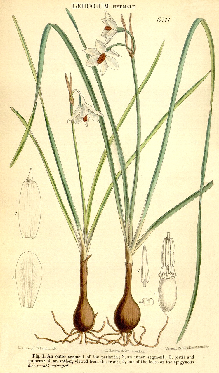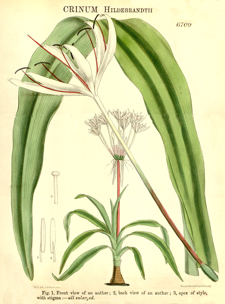 Illustrations. • Le Maout and Decaisne: Leucojum. • Le Maout and Decaisne: Narcissus, Galanthus, Oporanthus. • Narcissus, Galanthus, Leucojum (B. Ent. compilation, 1824–35). • Amaryllis belladonna (~ Brunsvigia rosea?): as A. banksiana, Bot. Reg. 11, 1842. Amaryllis banksiana Lindl., = A. belladonna or Brunsvigia rosea? The distinguishing character states, if they are real, are naccessible from the plate and Lindley’s description. 1, vertical section of one cell of the ovary. 2, transverse section of the ambiguously uni- or trilocular ovary. • Apodolirion buchananii: Hook. Ic. Pl. 14 (1882). • Caliphruria hartwegiana: Bot. Mag. 102 (1876). • Caliphruria subdentata (as Calliphruria): Bot. Mag. 103 (1877). • Calostemma luteum: Bot. Reg. xxvi, 19 (1840). • Calostemma purpureum: as C. carneum, Bot. Reg. xxvi, 26 (1840). • Clianthus croceus (as Stenomesson): Bot. Mag. 64 (1837). • Clinanthus coccineus (as Coburgia coccinea): Bot. Mag. 67 (1841). • Clinanthus incarnatus (as Coburgia trichroma): Bot. Mag. 94 (1868). • Clivia gardenii: Bot. Mag. 82 (1856). • Crinum abyssinicum, habit and LS flower: Thonner. • Crinum balfourii: Bot. Mag. 107 (1891). • Crinum brachynema: Bot. Mag. 97 (1871). • Crinum hildebrandtii: Bot. Mag. 109 (1883). • Crinum jagus (as C. giganteum): Bot. Mag. 86 (1860). • Crinum jagus (as C. podophyllum): Bot. Mag. 106 1880). • Crinum kirkii: Bot. Mag. 106 (1880). • Crinum macowanii: Bot. Mag. 104 (1878). • Crinum moorei: Bot. Mag. 100 (1874). • Crinum natans: Bot. Mag. 128 (1902). • Crinum purpurascens: Bot. Mag. 106 (1880). • Crinum roseum: as C. variabile var. roseum, Bot. Reg. 1844, 9. • Crinum stuhlmannii subsp. delagoense (as C. forbesianum): Bot. Mag. 107 (1881). • Cyrtanthus brachyscyphus (as C. parviflorus): Bot. Mag. 125 (1899). • Cyrtanthus breviflorus (as Anoiganthus): Bot. Mag. 115 (1889). • Cyrtanthus ochroluceus (as C. lutescens): Bot. Mag. 89 (1863). • Cyrtanthus carneus: Bot. Reg. 1462, 1831. • Cyrtanthus huttonii: Bot. Mag. 122 (1896. • Galanthus nivalis: Eng. Bot. 1507 (1869). • Eucharis X-grandiflora (= moorei x sanderii), as E. mastersii: Bot. Mag. 111 (1885). • Eucharis sanderii: Bot. Mag. 109 (1883). • Eucrosia aurantiaca (as Callipsyche): Bot. Mag. 111 (1885). • Galanthis elwesii: Bot. Mag. 101 (1875). • Griffinia blumenavia: Bot. Mag. 93 (1867). • Griffinia hyacinthina (as G. dryades): Bot. Mag. 95 (1869). • Griffinia ornata: Bot. Mag. 104 (1878). • Habranthus tubispathus (as H. andersoni): Bot. Reg. 1345, 1830. • Habranthus brachyandrus (as Hippeastrum): Bot. Mag. 120 (1894). • Habranthus gracilifolius var. boothianus: Bot. Reg. 1967, 1837. • Haemanthus deformis: Bot. Mag. 97 (1871). • Haemanthus deformis, as H. baurii: Bot. Mag. 112 (1886). • Haemanthus sanguineus (as H. incarnatus): Bot. Mag. 91 (1865). • Hippeastrum cybister: as Sprekelia, Bot. Reg. xxvi, 33 (1840). Hippeastrum cybister. 1, flower with perianth and stamens cut away, and the inferior ovary sectioned vertically. 3, transverse section of the ovary. 3, detail of the style. • Hippeastrum elegans (as H. solandriflorum): Bot. Mag. 66 (1840). • Hippeastrum harrisonii: Bot. Mag. 126 (1900). • Hippeastrum pardinum (as Amaryllis): Bot. Mag. 93 (1867). • Hippeastrum pratense: as Habranthus pratensis, Bot. Reg. 35, 1842. • Hymenocallis harrisiana: Bot. Mag. 107 (1881). • Hymenocallis schizostephana: Bot. Mag. 127 (1901). • Leptochiton quitoensis (as Ismene tenuifolia): Bot. Mag. 104 (1878). • Leucoium hyemale: Bot. Mag. 109 (1883). • Leucoium vernum: Bot. Mag. 2 (1788). • Lycoris squamigera: Bot. Mag. 123 (1897). • Narcissus broussonetii: Bot. Mag. 114 (1888). • Narcissus cantabricus subsp. monophyllus (as N. bulbocodium var. monophyllus): Bot. Mag. 96 (1870). • Narcissus cernuus (as N. pallidulus), N. graellsii (as N. bulbocodium), N. rupicola): Bot. Mag. 106 (1880). • Narcissus triandrus: Bot. Mag. 2 (1788). • Narcissus papyraceus subsp. pachybolus: Bot. Mag. 111 (1885). • Narcissus poeticus: Eng. Bot. 1504 (1869). • Narcissus pseudonarcissus: Eng. Bot. 1388 (1869). • Narcissus pseudonarcissus ssp. major: Bot. Mag. 2, 1788. • Assorted cultivated Narcissi: Bot. Reg. 29, 38 (1843). • Nerine angustifolia: Pole Evans, Fl. Pl. S. Africa 17 (1937). • Nerine bowdenii: Bot. Mag. 133 (1907). • Nerine filifolia: Bot. Mag. 107 (1881). • Nerine pudica: Bot. Mag. 97 (1871). • Pancratium maritimum: Lindley. • Phaedranassa carmiolii: Bot. Mag. 137 (1911). • Phaedranassa dubia (as P. obtusa): Bot. Mag. 89 (1863). • Phycella herbertiana: Bot. Reg. 1341, 1830. • Placea ornata: Bot. Reg. 50, 1841. • Pyrolirion arvense (as P. aureum): Bot. Reg. 1724, 1835. • Rhodophiala fulgens (as Habranthus): Bot. Mag. 92 (1866). • Rhodophiala pratensis (as Habranthus pratensis var. quadriflora): Bot. Mag. 68 (1842). • Scadoxus cinnabarinus (as Haemanthus): Bot. Mag. 88 (1862). • Scadoxus multiflorus (as Haemanthus tenuiflorus var. coccineus): Bot. Mag. 97 (1871). • Scadoxus multiflorus subsp. katherinae (as Haemanthus katherinae): Bot. Mag. 110 (1884). • Scadoxus multiflorus subsp. longitubus (as Haemanthus mannii): Bot. Mag. 104 (1878). • Scadoxus puniceus (as Haemanthus insignis): Bot. Mag. 79 (1853). • Scadoxus puniceus (as Haemanthus natalensis): Bot. Mag. 89 (1863). • Sprekelia formosissima, as Amaryllis: Bot. Mag. 2 (1788). • Sprekelia formosissima: as S. glauca, Bot. Reg. 16, 1841. • Stenomesson aurantiacum: as S. hartwegii, Bot. Reg. 1844, 42. • Stenomesson flavum (as S. latifolium): Bot. Mag. 67 (1840). • Stenomesson flavum: Bot. Reg 29 (2), 1843. • Stenomesson luteoviride: Bot. Mag. 106 (1880). • Stenomesson miniatum (as Urceolina peruviana): Bot. Reg. 1839, 68. • Sternbergia clusiana, as S. macrantha: Bot. Mag. 122 (1896). • Sternbergia vernalis (as S. fischeriana): Bot. Mag. 121 (1895). • Urceocharis edentata: Bot. Mag. 137 (19