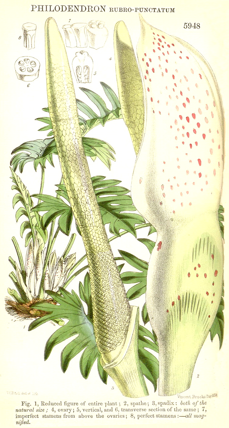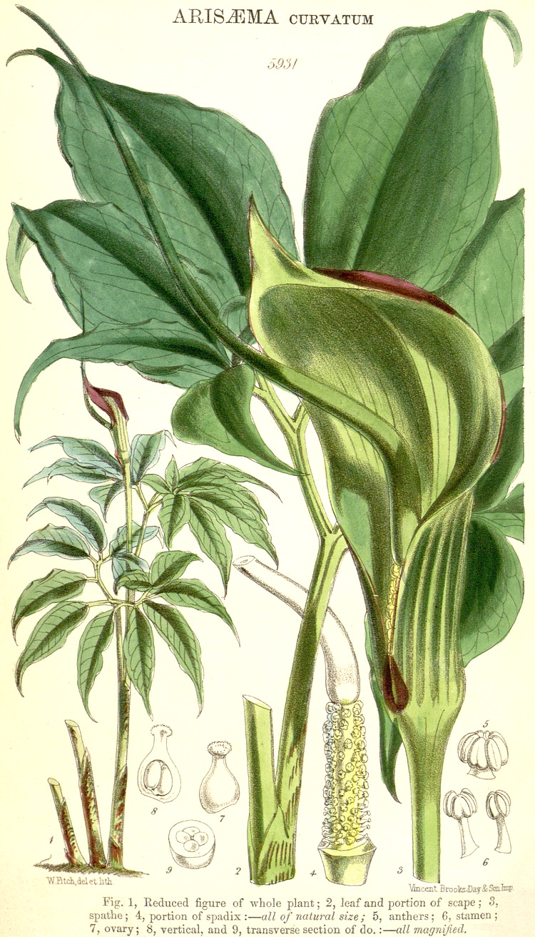 Illustrations. • Le Maout and Decaisne: Arum maculatum. • Arum maculatum (J.E. Sowerby, 1861). • Le Maout and Decaisne: Colocasia, Calla, Tornelia (= Monstera). • Le Maout and Decaisne: Ambrosina, Cyrtosperma, Gymnostachys, Symplocarpus. • Aglaonema marantaefolium var. foliis maculatis: Bot. Mag. 91 (1865). • Alocasia cuprea (as A. metallica): Bot. Mag. 86 (1860). • Alocasia longiloba (as A. lowii): Bot. Mag. 89 (1863). • Alocasia micholitziana: Bot. Mag. 139 (1913). • Alocasia reversa: Bot. Mag. 122 (1896). • Amorphophallus abyssinicus, as Hydrosme grata: Thonner. • Amorphophallus aphyllus (as A. leonensis): Bot. Mag. 127 (1901). • Amorphophallus eichleri: Bot. Mag. 115 (1889). • Amorphophallus konjac (as Proteinophallus rivieri): Bot. Mag. 101 (1875). • Amorphophallus nepalensis (as Thomsonia): Bot. Mag. 120 (1894). • Amorphophallus paeoniifolius (as A. dubius): Bot. Mag. 86 (1860). • Amorphophallus sylvaticus (as Synantherias): Bot. Mag.117 (1891). • Amorphophallus yunnanensis (as A. kerrii): Bot. Mag. 143 (1917). • Anchomanes difformis (as Caladium petiolatum): Bot. Mag. 66 (1839). • Anchomanes difformis (as A. hookeri var. pallida): Bot. Mag. 89 (1863). • Anthurium crassinervium: Standley & Steyermarck, Fl. of Guatemala 24 (1958). • Anthurium nymphaeifolium (as A. ornatum): Bot. Mag. 96 (1870). • Anthurium scherzerianum: Bot. Mag. 88 (1862). • Anthurium splendidum: Bot. Mag. 112 (1886). • Anthurium trifidum: Bot. Mag. 104 (1878). • Ariopsis peltata: Bot. Mag. 72 (1846). • Arisaema concinnum: Bot. Mag. 97 (1871). • Arisaema anomalum and A. harmandii: Engler, Das Pflanzenreich 23 (1920). • Arisaema fargesii: Bot. Mag. 146 (1920). • Arisaema flavum: Bot. Mag. 126 (1900). • Arisaema leschenaultii (as A. papillosum): Bot. Mag. 91 (1865). • Arisaema murrayi: Bot. Mag. 74 (1848). • Arisaema nepenthoides: Bot. Mag. 105 (1879). • Arisaema ringens (as A. praecox): Bot. Mag. 87 (1861). • Arisaema tortuosum subsp. tortuosum (as A. wightii): Bot. Mag. 91 (1865). • Arisaema tortuosum (as A. curvatum): Bot. Mag. 97 (1871). • Arisarum proboscideum: Bot. Mag. 108 (1882). • Arum palaestinum: Bot. Mag. 91 (1865). • Asterostigma luschnathianum: Bot. Mag. 98 (1872). • Le Maout and Decaisne: Pistia, Orontium, Richardia (= Zantedeschia). • Biarum pyrami (as Ischaemum): Bot. Mag. 88 (1862). • Caladium bicolor, var. chantini: Bot. Mag. 87 (1861). • Cryptocoryne griffithii: Bot. Mag. 126 (1900). • Culcasia mannii (as Aglaonema): Bot. Mag. 95 (1869). • Dracontium asperum (as D. foecundum): Bot. Mag. 111 (1885). • Dracontium spruceanum (as D. carderi): Bot. Mag. 106 (1880). • Eminium albertii (as Helicophyllum): Bot. Mag. 113 (1887). • Gonatopus boivinii (as Zamioculcas): Bot. Mag. 99 (1873). • Gymnostachys anceps: Schott, Genera Aroidearum (1858). • Gymnostachys anceps: Engler, Das Pflanzenreich 23 (1905). • Hapaline brownii: Bot. Mag. 119 (1893). • Homalomena rubescens: Schott, Genera Aroidearum (1858). • Homalomena wallisii (as Homalonema): Bot. Mag. 107 (1881). • Lysichiton camptschatcensis: Bot. Mag. 130 1904). • Monstera adansonii: Bot. Mag. 84 (1858). • Philodendron bipinnatifidum (as P. selloum): Bot. Mag. 110 (1884). • Philodendron crassinervum: Bot. Reg. 1958, 1837. Philodendron crassinervum. 1, anther viewed from within the flower. 2, the same from the outside. 3, transverse section of anther, showing the 4 cells. 4, ovary. 5, longitudinal section of ovary, showing location of ovules and the form of the stigma. • Philodendron erubescens: Bot. Mag. 84 (1858). • Philodendron pinnatifidum (as P. rubro-punctatum): Bot. Mag. 98 (1872). • Philodendron williamsii: Bot. Mag. 97 (1871). • Pinellia integrifolia: Hook. Ic. Pl. 19 (1889). • Piptospatha elongata (as Gamogyne pulchra): Bot. Mag. 136 (1910). • Piptospatha ridleyi: Bot. Mag. 121 (1895). • Pistia stratiotes: Bot. Mag. 77 (1851). • Pothos repens (as P. loureroi): Bot. Mag. 126 (1900). • Pothos scandens: Bot. Reg. 1337, 1830. • Protarum sechellarum: Hook. Ic. Pl. 28 (1902). • Pseudodracontium lacourii: Bot. Mag. 109 (1883). • Pseudoeranthemum longifolium (as Eranthemum cooperi): Bot. Mag 90 (1864). • Raphidophora decursiva: Bot. Mag. 119 (1893). • Remusatia pumila (as Gonatanthus sarmentosus): Bot. Mag. 87 (1861). • Sauromatum brevipes: Bot. Mag. 130 (1904). • Sauromatum venosum (as S. guttatum): Bot. Mag. 75 (1849). • Schismatoglottis asperata (as S. crispata): Bot. Mag. 107 (1881). • Steudnera colocasiaefolia: Bot. Mag. 110 (1884). • Symplocarpus foetidus: Schott, Genera Aroidearum (1858). • Synandrospadix vermitoxicus: Bot. Mag. 118 (1892). • Typhonium brownii: Bot. Mag. 101 (1875). • Zantedeschia albomaculata(as Richardia melanoleuca): Bot. Mag. 95 (1869). • Zantedeschia albomaculata subsp. albomaculata (as Richardia hastata): Bot. Mag. 86 (1860). • cf. Zantedeschia odorata (as Colocasia): Bot. Mag. 68 (1842).