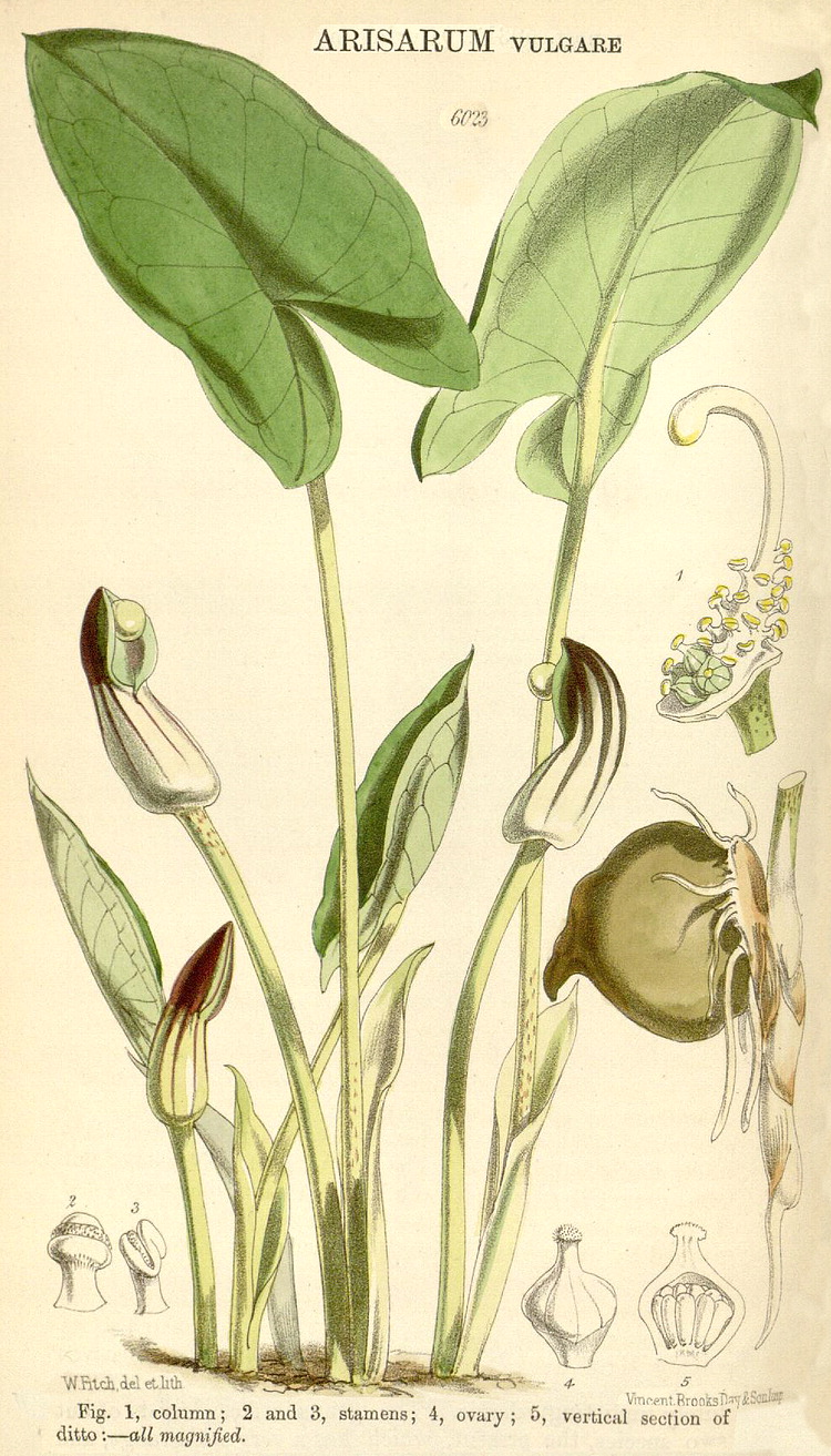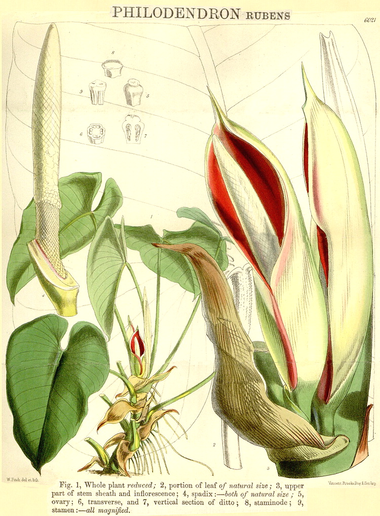 Illustrations. • Le Maout and Decaisne: Arum maculatum. • Arum maculatum (J.E. Sowerby, 1861). • Le Maout and Decaisne: Colocasia, Calla, Tornelia (= Monstera). • Le Maout and Decaisne: Ambrosina, Cyrtosperma, Gymnostachys, Symplocarpus. • Aglaonema marantaefolium var. foliis maculatis: Bot. Mag. 91 (1865). • Alocasia cuprea (as A. metallica): Bot. Mag. 86 (1860). • Alocasia longiloba (as A. lowii): Bot. Mag. 89 (1863). • Alocasia micholitziana: Bot. Mag. 139 (1913). • Alocasia reversa: Bot. Mag. 122 (1896). • Amorphophallus abyssinicus, as Hydrosme grata: Thonner. • Amorphophallus aphyllus (as A. leonensis): Bot. Mag. 127 (1901). • Amorphophallus eichleri: Bot. Mag. 115 (1889). • Amorphophallus konjac (as Proteinophallus rivieri): Bot. Mag. 101 (1875). • Amorphophallus nepalensis (as Thomsonia): Bot. Mag. 120 (1894). • Amorphophallus paeoniifolius (as A. dubius): Bot. Mag. 86 (1860). • Amorphophallus sylvaticus (as Synantherias): Bot. Mag.117 (1891). • Amorphophallus yunnanensis (as A. kerrii): Bot. Mag. 143 (1917). • Anchomanes difformis (as Caladium petiolatum): Bot. Mag. 66 (1839). • Anchomanes difformis (as A. hookeri var. pallida): Bot. Mag. 89 (1863). • Anthurium crassinervium: Standley & Steyermarck, Fl. of Guatemala 24 (1958). • Anthurium nymphaeifolium (as A. ornatum): Bot. Mag. 96 (1870). • Anthurium scherzerianum: Bot. Mag. 88 (1862). • Anthurium splendidum: Bot. Mag. 112 (1886). • Anthurium trifidum: Bot. Mag. 104 (1878). • Ariopsis peltata: Bot. Mag. 72 (1846). • Arisaema concinnum: Bot. Mag. 97 (1871). • Arisaema anomalum and A. harmandii: Engler, Das Pflanzenreich 23 (1920). • Arisaema fargesii: Bot. Mag. 146 (1920). • Arisaema flavum: Bot. Mag. 126 (1900). • Arisaema leschenaultii (as A. papillosum): Bot. Mag. 91 (1865). • Arisaema murrayi: Bot. Mag. 74 (1848). • Arisaema nepenthoides: Bot. Mag. 105 (1879). • Arisaema ringens (as A. praecox): Bot. Mag. 87 (1861). • Arisaema speciosum: Bot. Mag. 98 (1872). • Arisaema tortuosum subsp. tortuosum (as A. wightii): Bot. Mag. 91 (1865). • Arisaema tortuosum (as A. curvatum): Bot. Mag. 97 (1871). • Arisarum proboscideum: Bot. Mag. 108 (1882). • Arisarum vulgare: Bot. Mag. 99 (1873). • Arum palaestinum: Bot. Mag. 91 (1865). • Asterostigma luschnathianum: Bot. Mag. 98 (1872). • Le Maout and Decaisne: Pistia, Orontium, Richardia (= Zantedeschia). • Biarum pyrami (as Ischaemum): Bot. Mag. 88 (1862). • Caladium bicolor, var. chantini: Bot. Mag. 87 (1861). • Cryptocoryne griffithii: Bot. Mag. 126 (1900). • Culcasia mannii (as Aglaonema): Bot. Mag. 95 (1869). • Dracontium asperum (as D. foecundum): Bot. Mag. 111 (1885). • Dracontium spruceanum (as D. carderi): Bot. Mag. 106 (1880). • Eminium albertii (as Helicophyllum): Bot. Mag. 113 (1887). • Gonatopus boivinii (as Zamioculcas): Bot. Mag. 99 (1873). • Gymnostachys anceps: Schott, Genera Aroidearum (1858). • Gymnostachys anceps: Engler, Das Pflanzenreich 23 (1905). • Hapaline brownii: Bot. Mag. 119 (1893). • Homalomena rubescens: Schott, Genera Aroidearum (1858). • Homalomena wallisii (as Homalonema): Bot. Mag. 107 (1881). • Lysichiton camptschatcensis: Bot. Mag. 130 1904). • Monstera adansonii: Bot. Mag. 84 (1858). • Philodendron bipinnatifidum (as P. selloum): Bot. Mag. 110 (1884). • Philodendron crassinervum: Bot. Reg. 1958, 1837. Philodendron crassinervum. 1, anther viewed from within the flower. 2, the same from the outside. 3, transverse section of anther, showing the 4 cells. 4, ovary. 5, longitudinal section of ovary, showing location of ovules and the form of the stigma. • Philodendron erubescens: Bot. Mag. 84 (1858). • Philodendron ornatum (as P. rubescens): Bot. Mag. 99 (1873). • Philodendron pinnatifidum (as P. rubro-punctatum): Bot. Mag. 98 (1872). • Philodendron williamsii: Bot. Mag. 97 (1871). • Pinellia integrifolia: Hook. Ic. Pl. 19 (1889). • Piptospatha elongata (as Gamogyne pulchra): Bot. Mag. 136 (1910). • Piptospatha ridleyi: Bot. Mag. 121 (1895). • Pistia stratiotes: Bot. Mag. 77 (1851). • Pothos repens (as P. loureroi): Bot. Mag. 126 (1900). • Pothos scandens: Bot. Reg. 1337, 1830. • Protarum sechellarum: Hook. Ic. Pl. 28 (1902). • Pseudodracontium lacourii: Bot. Mag. 109 (1883). • Pseudoeranthemum longifolium (as Eranthemum cooperi): Bot. Mag 90 (1864). • Raphidophora decursiva: Bot. Mag. 119 (1893). • Remusatia pumila (as Gonatanthus sarmentosus): Bot. Mag. 87 (1861). • Sauromatum brevipes: Bot. Mag. 130 (1904). • Sauromatum venosum (as S. guttatum): Bot. Mag. 75 (1849). • Schismatoglottis asperata (as S. crispata): Bot. Mag. 107 (1881). • Steudnera colocasiaefolia: Bot. Mag. 110 (1884). • Symplocarpus foetidus: Schott, Genera Aroidearum (1858). • Synandrospadix vermitoxicus: Bot. Mag. 118 (1892). • Typhonium brownii: Bot. Mag. 101 (1875). • Zamioculcas zamiifolia (as Z. loddigesii): Bot. Mag. 98 (1872). • Zantedeschia albomaculata(as Richardia melanoleuca): Bot. Mag. 95 (1869). • Zantedeschia albomaculata subsp. albomaculata (as Richardia hastata): Bot. Mag. 86 (1860). • cf. Zantedeschia odorata (as Colocasia): Bot. Mag. 68 (1842).