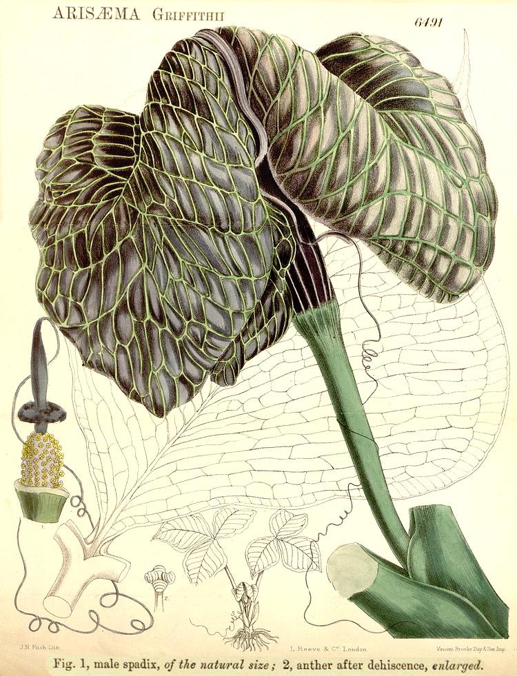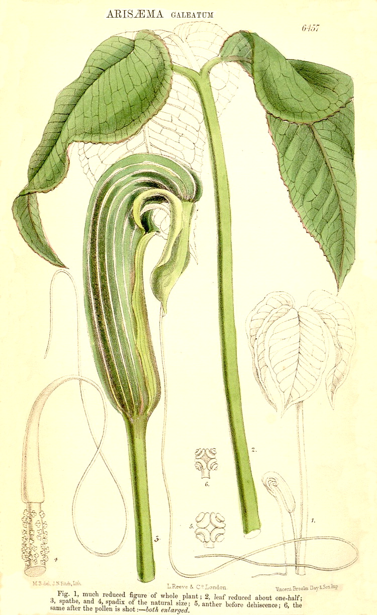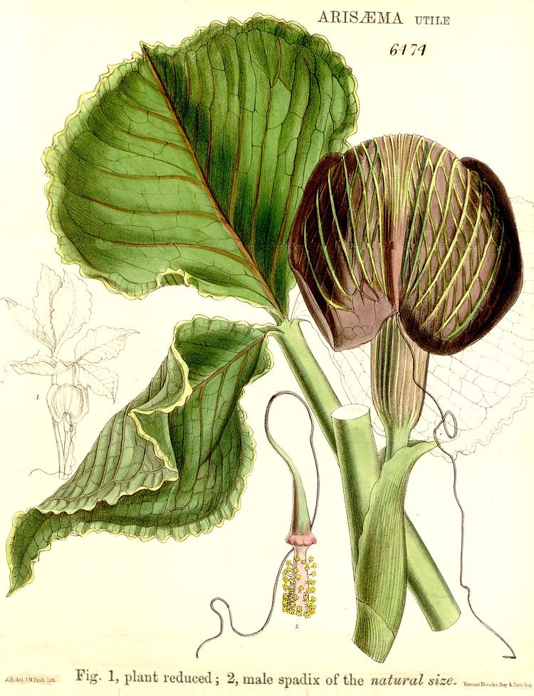 Illustrations. • Le Maout and Decaisne: Arum maculatum. • Arum maculatum (J.E. Sowerby, 1861). • Le Maout and Decaisne: Colocasia, Calla, Tornelia (= Monstera). • Le Maout and Decaisne: Ambrosina, Cyrtosperma, Gymnostachys, Symplocarpus. • Aglaonema marantaefolium var. foliis maculatis: Bot. Mag. 91 (1865). • Alocasia cuprea (as A. metallica): Bot. Mag. 86 (1860). • Alocasia longiloba (as A. lowii): Bot. Mag. 89 (1863). • Alocasia micholitziana: Bot. Mag. 139 (1913). • Alocasia reversa: Bot. Mag. 122 (1896). • Ambrosina bassii (as Ambrosinia): Bot. Mag. 104 (1878). • Amorphophallus abyssinicus, as Hydrosme grata: Thonner. • Amorphophallus aphyllus (as A. leonensis): Bot. Mag. 127 (1901). • Amorphophallus eichleri: Bot. Mag. 115 (1889). • Amorphophallus konjac (as Proteinophallus rivieri): Bot. Mag. 101 (1875). • Amorphophallus nepalensis (as Thomsonia): Bot. Mag. 120 (1894). • Amorphophallus paeoniifolius (as A. dubius): Bot. Mag. 86 (1860). • Amorphophallus sylvaticus (as Synantherias): Bot. Mag.117 (1891). • Amorphophallus yunnanensis (as A. kerrii): Bot. Mag. 143 (1917). • Anchomanes difformis (as Caladium petiolatum): Bot. Mag. 66 (1839). • Anchomanes difformis (as A. hookeri var. pallida): Bot. Mag. 89 (1863). • Anthurium crassinervium: Standley & Steyermarck, Fl. of Guatemala 24 (1958). • Anthurium nymphaeifolium (as A. ornatum): Bot. Mag. 96 (1870). • Anthurium pentaphyllum var. pentaphyllum (as A. saundersii): Bot. Mag. 102 (1876). • Anthurium scherzerianum: Bot. Mag. 88 (1862). • Anthurium splendidum: Bot. Mag. 112 (1886). • Anthurium trifidum: Bot. Mag. 104 (1878). • Ariopsis peltata: Bot. Mag. 72 (1846). • Arisaema concinnum: Bot. Mag. 97 (1871). • Arisaema anomalum and A. harmandii: Engler, Das Pflanzenreich 23 (1920). • Arisaema fargesii: Bot. Mag. 146 (1920). • Arisaema flavum: Bot. Mag. 126 (1900). • Arisaema galeatum: Bot. Mag. 105 (1879). • Arisaema griffithii: Bot. Mag. 106 (1880). • Arisaema leschenaultii (as A. papillosum): Bot. Mag. 91 (1865). • Arisaema murrayi: Bot. Mag. 74 (1848). • Arisaema nepenthoides: Bot. Mag. 105 (1879). • Arisaema ringens (as A. praecox): Bot. Mag. 87 (1861). • Arisaema speciosum: Bot. Mag. 98 (1872). • Arisaema tortuosum subsp. tortuosum (as A. wightii): Bot. Mag. 91 (1865). • Arisaema tortuosum (as A. curvatum): Bot. Mag. 97 (1871). • Arisaema utile: Bot. Mag. 106 (1880). • Arisarum proboscideum: Bot. Mag. 108 (1882). • Arisarum vulgare: Bot. Mag. 99 (1873). • Arum palaestinum: Bot. Mag. 91 (1865). • Asterostigma luschnathianum: Bot. Mag. 98 (1872). • Le Maout and Decaisne: Pistia, Orontium, Richardia (= Zantedeschia). • Biarum angustatum (as Ischarum): Bot. Mag. 104 (1878). • Biarum pyrami (as Ischaemum): Bot. Mag. 88 (1862). • Caladium bicolor, var. chantini: Bot. Mag. 87 (1861). • Cryptocoryne griffithii: Bot. Mag. 126 (1900). • Culcasia mannii (as Aglaonema): Bot. Mag. 95 (1869). • Dracontium asperum (as D. foecundum): Bot. Mag. 111 (1885). • Dracontium gigas (as Godwinia): Bot. Mag. 99 (1873). • Dracontium spruceanum (as D. carderi): Bot. Mag. 106 (1880). • Eminium albertii (as Helicophyllum): Bot. Mag. 113 (1887). • Gonatopus boivinii (as Zamioculcas): Bot. Mag. 99 (1873). • Gymnostachys anceps: Schott, Genera Aroidearum (1858). • Gymnostachys anceps: Engler, Das Pflanzenreich 23 (1905). • Hapaline brownii: Bot. Mag. 119 (1893). • Homalomena rubescens: Schott, Genera Aroidearum (1858). • Homalomena wallisii (as Homalonema): Bot. Mag. 107 (1881). • Lysichiton camptschatcensis: Bot. Mag. 130 1904). • Monstera adansonii: Bot. Mag. 84 (1858). • Philodendron bipinnatifidum (as P. selloum): Bot. Mag. 110 (1884). • Philodendron crassinervum: Bot. Reg. 1958, 1837. Philodendron crassinervum. 1, anther viewed from within the flower. 2, the same from the outside. 3, transverse section of anther, showing the 4 cells. 4, ovary. 5, longitudinal section of ovary, showing location of ovules and the form of the stigma. • Philodendron erubescens: Bot. Mag. 84 (1858). • Philodendron ornatum (as P. rubescens): Bot. Mag. 99 (1873). • Philodendron pinnatifidum (as P. rubro-punctatum): Bot. Mag. 98 (1872). • Philodendron serpens: Bot. Mag. 104 (1878). • Philodendron williamsii: Bot. Mag. 97 (1871). • Pinellia integrifolia: Hook. Ic. Pl. 19 (1889). • Piptospatha elongata (as Gamogyne pulchra): Bot. Mag. 136 (1910). • Piptospatha ridleyi: Bot. Mag. 121 (1895). • Pistia stratiotes: Bot. Mag. 77 (1851). • Pothos repens (as P. loureroi): Bot. Mag. 126 (1900). • Pothos scandens: Bot. Reg. 1337, 1830. • Protarum sechellarum: Hook. Ic. Pl. 28 (1902). • Pseudodracontium lacourii: Bot. Mag. 109 (1883). • Pseudoeranthemum longifolium (as Eranthemum cooperi): Bot. Mag 90 (1864). • Raphidophora decursiva: Bot. Mag. 119 (1893). • Remusatia pumila (as Gonatanthus sarmentosus): Bot. Mag. 87 (1861). • Sauromatum brevipes: Bot. Mag. 130 (1904). • Sauromatum venosum (as S. guttatum): Bot. Mag. 75 (1849). • Schismatoglottis asperata (as S. crispata): Bot. Mag. 107 (1881). • Stenospermation wallisii: Bot. Mag. 103 (1877). • Steudnera colocasiaefolia: Bot. Mag. 110 (1884). • Symplocarpus foetidus: Schott, Genera Aroidearum (1858). • Synandrospadix vermitoxicus: Bot. Mag. 118 (1892). • Typhonium brownii: Bot. Mag. 101 (1875). • Zamioculcas zamiifolia (as Z. loddigesii): Bot. Mag. 98 (1872). • Zantedeschia albomaculata(as Richardia melanoleuca): Bot. Mag. 95 (1869). • Zantedeschia albomaculata subsp. albomaculata (as Richardia hastata): Bot. Mag. 86 (1860). • cf. Zantedeschia odorata (as Colocasia): Bot. Mag. 68 (1842).