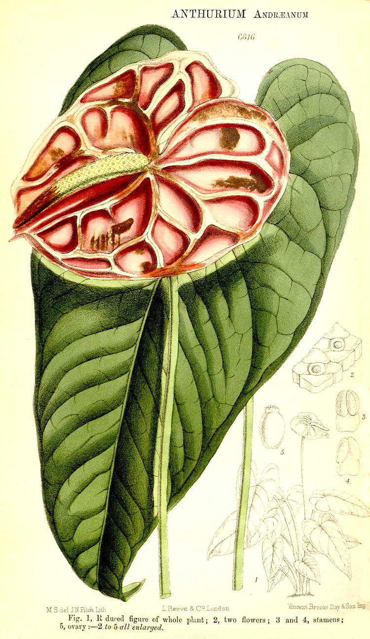Illustrations. • Le Maout and Decaisne: Arum maculatum. • Arum maculatum (J.E. Sowerby, 1861). • Le Maout and Decaisne: Colocasia, Calla, Tornelia (= Monstera). • Le Maout and Decaisne: Ambrosina, Cyrtosperma, Gymnostachys, Symplocarpus. • Aglaonema marantaefolium var. foliis maculatis: Bot. Mag. 91 (1865). • Alocasia cuprea (as A. metallica): Bot. Mag. 86 (1860). • Alocasia longiloba (as A. lowii): Bot. Mag. 89 (1863). • Alocasia micholitziana: Bot. Mag. 139 (1913). • Alocasia reversa: Bot. Mag. 122 (1896). • Ambrosina bassii (as Ambrosinia): Bot. Mag. 104 (1878). • Amorphophallus abyssinicus, as Hydrosme grata: Thonner. • Amorphophallus aphyllus (as A. leonensis): Bot. Mag. 127 (1901). • Amorphophallus eichleri: Bot. Mag. 115 (1889). • Amorphophallus konjac (as Proteinophallus rivieri): Bot. Mag. 101 (1875). • Amorphophallus nepalensis (as Thomsonia): Bot. Mag. 120 (1894). • Amorphophallus paeoniifolius (as A. dubius): Bot. Mag. 86 (1860). • Amorphophallus sylvaticus (as Synantherias): Bot. Mag.117 (1891). • Amorphophallus yunnanensis (as A. kerrii): Bot. Mag. 143 (1917). • Anchomanes difformis (as Caladium petiolatum): Bot. Mag. 66 (1839). • Anchomanes difformis (as A. hookeri var. pallida): Bot. Mag. 89 (1863). • Anthurium andraeanum: Bot. Mag. 108 (1882). • Anthurium crassinervium: Standley & Steyermarck, Fl. of Guatemala 24 (1958). • Anthurium nymphaeifolium (as A. ornatum): Bot. Mag. 96 (1870). • Anthurium pentaphyllum var. pentaphyllum (as A. saundersii): Bot. Mag. 102 (1876). • Anthurium scherzerianum: Bot. Mag. 88 (1862). • Anthurium splendidum: Bot. Mag. 112 (1886). • Anthurium trifidum: Bot. Mag. 104 (1878). • Ariopsis peltata: Bot. Mag. 72 (1846). • Arisaema concinnum: Bot. Mag. 97 (1871). • Arisaema anomalum and A. harmandii: Engler, Das Pflanzenreich 23 (1920). • Arisaema fargesii: Bot. Mag. 146 (1920). • Arisaema flavum: Bot. Mag. 126 (1900). • Arisaema galeatum: Bot. Mag. 105 (1879). • Arisaema griffithii: Bot. Mag. 106 (1880). • Arisaema leschenaultii (as A. papillosum): Bot. Mag. 91 (1865). • Arisaema murrayi: Bot. Mag. 74 (1848). • Arisaema nepenthoides: Bot. Mag. 105 (1879). • Arisaema ringens (as A. praecox): Bot. Mag. 87 (1861). • Arisaema speciosum: Bot. Mag. 98 (1872). • Arisaema tortuosum subsp. tortuosum (as A. wightii): Bot. Mag. 91 (1865). • Arisaema tortuosum (as A. curvatum): Bot. Mag. 97 (1871). • Arisaema utile: Bot. Mag. 106 (1880). • Arisarum proboscideum: Bot. Mag. 108 (1882). • Arisarum vulgare: Bot. Mag. 99 (1873). • Arum palaestinum: Bot. Mag. 91 (1865). • Asterostigma luschnathianum: Bot. Mag. 98 (1872). • Le Maout and Decaisne: Pistia, Orontium, Richardia (= Zantedeschia). • Biarum angustatum (as Ischarum): Bot. Mag. 104 (1878). • Biarum pyrami (as Ischaemum): Bot. Mag. 88 (1862). • Caladium bicolor, var. chantini: Bot. Mag. 87 (1861). • Cryptocoryne griffithii: Bot. Mag. 126 (1900). • Culcasia mannii (as Aglaonema): Bot. Mag. 95 (1869). • Dracontium asperum (as D. foecundum): Bot. Mag. 111 (1885). • Dracontium gigas (as Godwinia): Bot. Mag. 99 (1873). • Dracontium spruceanum (as D. carderi): Bot. Mag. 106 (1880). • Eminium albertii (as Helicophyllum): Bot. Mag. 113 (1887). • Gonatopus boivinii (as Zamioculcas): Bot. Mag. 99 (1873). • Gymnostachys anceps: Schott, Genera Aroidearum (1858). • Gymnostachys anceps: Engler, Das Pflanzenreich 23 (1905). • Hapaline brownii: Bot. Mag. 119 (1893). • Homalomena rubescens: Schott, Genera Aroidearum (1858). • Homalomena wallisii (as Homalonema): Bot. Mag. 107 (1881). • Lysichiton camptschatcensis: Bot. Mag. 130 1904). • Monstera adansonii: Bot. Mag. 84 (1858). • Philodendron bipinnatifidum (as P. selloum): Bot. Mag. 110 (1884). • Philodendron crassinervum: Bot. Reg. 1958, 1837. Philodendron crassinervum. 1, anther viewed from within the flower. 2, the same from the outside. 3, transverse section of anther, showing the 4 cells. 4, ovary. 5, longitudinal section of ovary, showing location of ovules and the form of the stigma. • Philodendron erubescens: Bot. Mag. 84 (1858). • Philodendron ornatum (as P. rubescens): Bot. Mag. 99 (1873). • Philodendron pinnatifidum (as P. rubro-punctatum): Bot. Mag. 98 (1872). • Philodendron serpens: Bot. Mag. 104 (1878). • Philodendron williamsii: Bot. Mag. 97 (1871). • Pinellia integrifolia: Hook. Ic. Pl. 19 (1889). • Piptospatha elongata (as Gamogyne pulchra): Bot. Mag. 136 (1910). • Piptospatha insignis: Bot. Mag. 107 (1881). • Piptospatha ridleyi: Bot. Mag. 121 (1895). • Pistia stratiotes: Bot. Mag. 77 (1851). • Pothos repens (as P. loureroi): Bot. Mag. 126 (1900). • Pothos scandens: Bot. Reg. 1337, 1830. • Protarum sechellarum: Hook. Ic. Pl. 28 (1902). • Pseudodracontium lacourii: Bot. Mag. 109 (1883). • Pseudoeranthemum longifolium (as Eranthemum cooperi): Bot. Mag 90 (1864). • Raphidophora decursiva: Bot. Mag. 119 (1893). • Remusatia pumila (as Gonatanthus sarmentosus): Bot. Mag. 87 (1861). • Sauromatum brevipes: Bot. Mag. 130 (1904). • Sauromatum venosum (as S. guttatum): Bot. Mag. 75 (1849). • Schismatoglottis asperata (as S. crispata): Bot. Mag. 107 (1881). • Stenospermation wallisii: Bot. Mag. 103 (1877). • Steudnera colocasiaefolia: Bot. Mag. 110 (1884). • Symplocarpus foetidus: Schott, Genera Aroidearum (1858). • Synandrospadix vermitoxicus: Bot. Mag. 118 (1892). • Typhonium brownii: Bot. Mag. 101 (1875). • Zamioculcas zamiifolia (as Z. loddigesii): Bot. Mag. 98 (1872). • Zantedeschia albomaculata(as Richardia melanoleuca): Bot. Mag. 95 (1869). • Zantedeschia albomaculata subsp. albomaculata (as Richardia hastata): Bot. Mag. 86 (1860). • cf. Zantedeschia odorata (as Colocasia): Bot. Mag. 68 (1842).