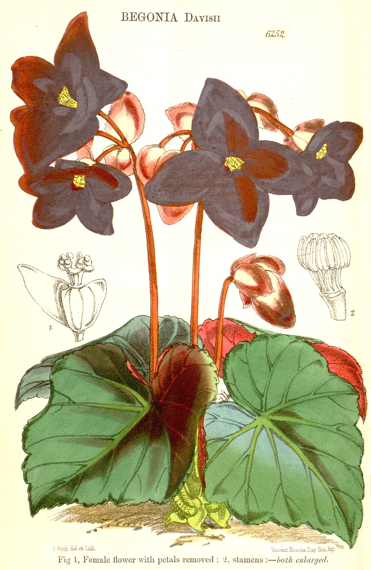 Illustrations. • Le Maout and Decaisne: Begonia. • Le Maout and Decaisne: Begonia. • Begonia adenopoda, as verticillata: Hook. Ic. Pl. 9 (1852). • Begonia annulata (as B. griffithii): Bot. Mag. 83 (1857). • Begonia baccata: Bot. Mag. 92 (1866). • Begonia baumanni: Bot. Mag. 123 (1897). • Begonia boliviensis: Bot. Mag. 93 (1867). • Begonia carhcartii: Hooker’s Illustrations of Himalayan plants (1855). • Begonia foliosa (as B. fuchsioides): Bot. Mag. 73 (1847). • Begonia frigida: Bot. Mag. 86 (1860). • Begonia geranioides: Bot. Mag. 92 (1866). • Begonia glandulifera: Bot. Mag. 94 (1868). • Begonia glandulosa: Bot. Mag. 87 (1861). • Begonia hemsleyana: Bot. Mag. 125 (1899). • Begonia heracleifolia: Bot. Reg. 1668, 1835. • Begonia herbacea: Bot. Mag. 99 (1873). • Begonia hirtella: Bot. Reg. 1252, 1829. • Begonia homonyma, as B. favargeri: Thonner. • Begonia irmscheri (as Begoniella angustifolia): Hook. Ic. Pl. 15 (1885). • Begonia johnstonii: Bot. Mag. 112 (1886). • Begonia kalbreyeri (as Begoniella): Hook. Ic. Pl. 14 (1881). • Begonia micranthera subsp. micranthera (as B. crinita): Bot. Mag. 97 (1871). • Begonia phyllomaniaca (= B. incarnata x B. manicata): Bot. Mag. 87 (1861). • Begonia radicans (as B. glaucophylla): Bot. Mag. 118 (1892). • Begonia scharffii: Bot. Mag. 114 (1888). • Begonia socotrana: Bot. Mag. 107 (1881). • Begonia umbraculifera: Bot. Mag. 122 (1896). • Begonia veitchii: Bot. Mag. 93 (1867). • Begonia veitchii var. veitchii (as B. clarkei): Bot. Mag. 93 (1867). • Begonia weddelliana (as B. davisii) Bot. Mag. 102 (1876). • Leaf hairs (Solereder, 1908).