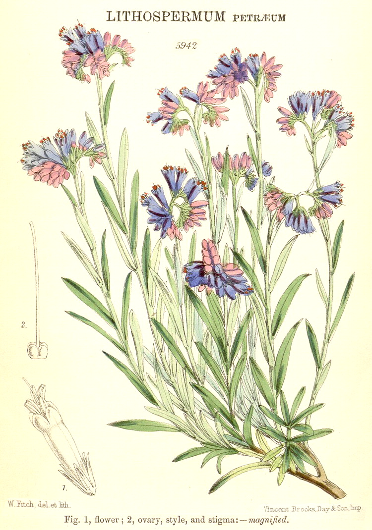 Illustrations. • Le Maout and Decaisne: Lycopsis, Pulmonaria. Myosotis. • Le Maout and Decaisne: Symphytum, Cerinthe. • Le Maout and Decaisne: Cynoglossum, Heliotrope, Tournefortia. • Boragineae (Symphytum, Borago, Anchusa, Pentaglossis: B. Ent. compilation, 1824–35). • Lithospermeae (Myosotis, Lithospermum: B. Ent. compilation, 1824–35). • Lithospermeae (Mertensia), Cynoglosseae, Echieae: B. Ent. compilation, 1824–35. • Adelocaryum anchusoides: as Cynoglossum, Bot. Reg. 14, 1842. • Anchusa arvensis and A. officinalis: Eng. Bot. 1111 and 1112, 1867. • Arnebia benthamii (as Macrotomia): Bot. Mag. 114 (1888). • Arnebia guttata subsp. griffithii (as A. griffithii): Bot. Mag. 87 (1861). • Borago officinalis: Eng. Bot. 11141, 1867. • Brachybotrys paridiformis: Hook. Ic. Pl. 13 (1877–79). • Buglossoides gastonii (as Lithospermum): Bot. Mag. 97 (1871). • Caccinia macrantha var. glauca: Bot. Mag. 112 (1886). • Cerinthe major (as C. gymnandra): Bot. Mag. 100 (1874). • Cerinthe minor: Bot. Mag. 112 (1886). • Cerinthe retorta: Bot. Mag. 87 (1861). • Cryptantha aprica, C. gnaphalioides, C. linearis, C. phacelioides, C. volckmannii: Engler, Das Pflanzenreich 97 (1931). • Cynoglossum microglochin (as C. nervosum): Bot. Mag. 123 (1897). • Cynoglossum officinale and C. germanicum (as montanum): Eng. Bot. 1118 and 1119, 1867. • Echiochilon longiflorum: Hook. Ic. Pl. 13 (1877–79). • Echium candicans: Bot. Mag. 112 (1886). • Echium perezii: Bot. Mag. 141 (1915). • Echium wildpretii: Bot. Mag. 128 (1902). • Echium vulgare and E. plantagineum: Eng. Bot. 1095 and 1096, 1867. • Eritrichium nanum: Bot. Mag. 96 (1870). • Euploca convolvulacea: Hook. Ic. Pl. 7–8 (1844). • Euploca convolvulacea (as Heliotropium): Bot. Mag. 92 (1866). • Euploca glabella (as Notonerium gossei): Hook. Ic. Pl. 12 (1876). • Exarrhena macrantha: Bot. Mag. 119 (1893). • Heliotropium amplexicaule (as H. anchusaefolium): Bot. Mag. 139 (1913). • Heliotropium dasycarpum var. gymnostomum (as H. gymnostomum): Hook. Ic. Pl. 18 (1888). • Heliotropium gossei: Hook. Ic. Pl. 31 (1915). • Heliotropium nicotianifolium (as Tournefortia heliotropioides): Bot. Mag. 58 (1831). • Lindelofia anchusoides (as Paracaryum heliocarpum): Bot. Mag. 123 (1897). • Lindelofia longiflora: as Cynoglossum longiflorum, Bot. Reg. xxvi, 50 (1840). • Lithospermum canescens: Bot. Mag. 74 (1848). • Lithospermum purpureocaeruleum, L. officinale and L. arvense: Eng. Bot. 1100, 1101 and 1102, 1867. • Lithospermum rosmarinifolium (? - cf. Glandora, Moltkia): Bot. Reg. 1736, 1835. • Macrotomia densiflora (as M. cephalotes): Köhler’s Medizinal-Pflanzen 3 (1898). • Mertensia alpina: Bot. Mag. 101 (1875). • Mertensia maritima: Eng. Bot. 1099, 1867. • Microula tibetica: Hook. Ic. Pl. 26 (1898). • Moltkia petraea: Bot. Reg. 29 (26), 1843. • Moltkia petraea (as Lithospermum): Bot. Mag. 97 (1871). • Myosotidium hortensium (a M. nobile): Bot. Mag. 85 (1859). • Myosotis azorica: Bot. Mag. 70 (1844). • Myosotis laxa (as caespitosa), M. scorpioides (as palustris), M. secunda (as repens) and M. sylvatica: Eng. Bot. 1103–1105 and 1107, 1867. • Myosotis alpestris, M. arvensis, M. ramosissima (as collina) and M. discolor (as versicolor): Eng. Bot. 1106 and 1108–1110, 1867. • Myosotis dissitiflora var. dyerae: Bot. Mag. 124 (1898). • Nonea echioides (as Arnebia): Bot. Mag. 74 (1848). • Nonea versicolor (as Anchusa): Bot. Mag. 63 (1836). • Omphalodes luciliae: Bot. Mag. 99 (1873). • Onosma exsertum: Hook. Ic. Pl. 27 (1900). • Onosma pyramidalis: Bot. Mag. 114 (1888). • Pentaglottis sempervirens: as Anchusa sempervirens, Eng. Bot. 1097, 1867. • Pulmonaria angustifolia and P. officinalis: Eng. Bot. 1097 and 1098, 1867. • Rotula aquatica, as Rhabdia viminea: Hook. Ic. Pl. 9 (1852). • Sericostoma pauciflorum: Hook. Ic. Pl. 9 (1852). • Solenanthus scardicus: Hook. Ic. Pl. 33 (1935). • Symphytum officinale: Köhler's Medizinal Pflanzen 1 (1887). • Symphytum officinale (as S. peregrinum): Bot. Mag. 105 (1879). • Symphytum officinale (3 varieties): Eng. Bot. 1115 and 1116, 1867. • Symphytum tuberosum: Eng. Bot. 1117, 1867. • Tournefortia elongata: Flora of Guatemala 9 (1970). • Trichodesma zeylanicum: Bot. Mag. 80 (1854). • Tysonia africana: Hook. Ic. Pl. 20 (1890). • Leaf hairs and epidermal cystoliths of Lithospermum officinale (Solereder, 1908).