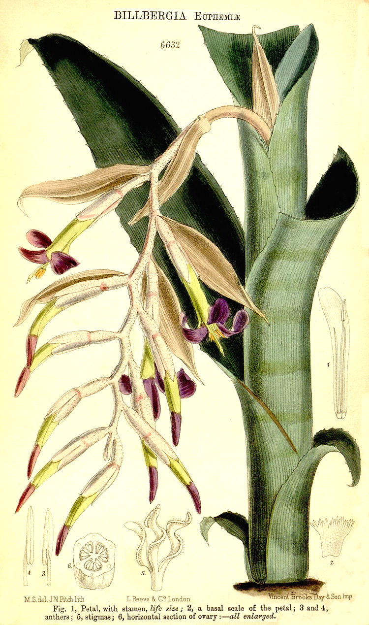 Illustrations. • Le Maout and Decaisne: Ananas, Dyckia. • Le Maout and Decaisne: Bromelia, Billbergia, Tillandsia. • Aechmea distichantha: Bot. Mag. 90 (1864). • Aechmea fasciata (as Billbergia rhodocyanea): Bot. Mag. 81 (1855). • Aechmea fulgens (as A. discolor): Bot. Mag. 73 (1847). • Aechmea lindeni: Bot. Mag. 107 (1881). • Aechmea mariae-reginae: Bot. Mag. 105 (1879). • Aechmea mariae-reginae (as A. gigas): Bot. Mag. 132 (1906). • Aechmea melinonii: Bot. Mag. 87 (1861). • Aechmea mertensii (as A. mucroniflora): Bot. Mag. 81 (1855). • Aechmea myriophylla: Bot. Mag. 113 (1887). • Aechmea pineliana (as Echinostachys): Bot. Mag. 88 (1862). • Aechmea weilbachii (as Lamprococcus): Bot. Mag. 105 (1879). • Aechmea purpureorosea (as Billbergia): Bot. Mag. 61 (1834). • Ananas comosus var. bracteatus: Bot. Mag. 84 (1858). • Billbergia distachya (as B. pallescens): Bot. Mag. 104 (1878). • Billbergia euphemiae: Bot. Mag. 108 (1882). • Billbergia macrocalyx: Bot. Mag. 85 (1859). • Billbergia nutans: Bot. Mag. 105 (1879). • Billbergia porteana: Bot. Mag. 109 (1883). • Cryptanthus bivittatus (as Billbergia): Bot. Mag. 87 (1861). • Dyckia frigida: Bot. Mag. 103 (1877). • Dyckia rariflora: Bot. Mag. 62 (1835). • Dyckia remotiflora: as D. rariflora, Bot. Reg. 1782, 1836. • Goudaea chrysostachys (as Tillandsia): Bot. Mag. 112 (1886). • Greigia sphacelata (as Billbergia): Bot. Mag. 93 (1867). • Guzmania andreana (as Caraguata): Bot. Mag. 114 (1888). • Guzmania monostachya, as G. tricolor: Bot. Mag. 86 (1860). • Guzmania musaica (as Caraguata): Bot. Mag. 109 (1883). • Guzmania sanguinea (as Caraguata): Bot. Mag. 110 (1884). • Guzmania zahnii (as Caraguata): Bot. Mag. 99 (1873). • Hechtia argentea: Bot. Mag. 122 (1896). • Hechtia glomerata (as H. ? ghiesbreghtii): Bot. Mag. 96 (1870). • Hechtia rosea (as Dyckia desmetiana): Bot. Mag. 120 (1894). • Hechtia stenopetala (as H. cordylinoides): Bot. Mag. 107 (1881). • Hohenbergia augusta (as Aechmea glomerata): Bot. Mag. 93 (1867). • Lutheria splendens (as Vriesea speciosa): Bot. Mag. 74 (1848). • Neoregelia concentrica (as Karatas acanthocrater): Bot. Mag. 112 (1886). • Neoregelia olens (as Billbergia): Bot. Mag. 91 (1865). • Neoregelia spectabilis (as Nidularium spectabile): Bot. Mag. 99 (1873). • Ochagavia andina (as Rhodostachys): Bot. Mag. 116 (1890). • Pitcairnia altensteinii (as P. undulatifolia): Bot. Mag. 72 (1846). • cf. Pitcairnia atrorubens (as Puya warszeuiczii): Bot. Mag. 87 (1861). • Pitcairnia andreana: Bot. Mag. 106 (1880). • Pitcairnia corallina: Bot. Mag. 107 (1881). • Pitcairnia devansayana (as P. roezlii): Bot. Mag. 117 (1891). • Pitcairnia flammea var. floccosa (as P. muscosa): Bot. Mag. 80 (1854). • Pitcairnia heterophylla: as Puya, Bot. Reg. xxvi, 71 (1840). • Pitcairnia integrifolia (as P. alta): Bot. Mag. 108 (1882). • Pitcairnia maidifolia (as P. zeifolia): Bot. Mag. 107 (1881). • Pitcairnia pungens: Bot. Mag. 89 (1863). • Pitcairnia wendlandii (as Puya sulphurea): Bot. Mag. 79 (1853). • Pitcairnia xanthocalyx (as P. flavescens): Bot. Mag. 103 (1877). • Puya alpestris (as P. whytei): Bot. Mag. 94 (1868). • Puya caerulea: Bot. Reg. xxvi, 11 (1840). • Puya caerulea var. violacea: Bot. Mag. 134 (1908). • Puya ferruginea (as P. grandiflora): Bot. Mag. 87 (1861). • Puya spathacea (as Pitcairnia): Bot. Mag. 130 1904). • Puya virescens: Bot. Mag. 83 (1857). • Quesnelia marmorata, as Billbergia: Lemaire, Illustr. Horticole (1854). • Ronnbergia veitchii (as Aechmea): Bot. Mag. 103 (1877). • Tillandsia aeranthos (as T. microxiphion): Bot. Mag. 119 (1893). • Tillandsia dianthoidea: as T. stricta, Bot. Reg. 1338 (1830). • Tillandsia geminiflora: as T. rubida, Bot. Reg. 63 (1842). • Tillandsia ionantha: Bot. Mag. 97 (1871). • Tillandsia malzinei: Bot. Mag. 106 (1880). • Tillandsia recurvifolia: Bot. Mag. 87 (1861). • Tillandsia tenuifolia var. tenuifolia (as T. pulchella): Bot. Mag. 87 (1861). • Tillandsia tricolor (as Vriesia xyphostachys): Bot. Mag. 87 (1861). • Tillandsia usneoides: Bot. Mag. 103 (1877). • Tillandsia xiphioides: Bot. Mag 92 (1867). • Vriesea amethystina: Bot. Mag. 116 (1890). • Vriesea carinata (as V. brachystachys): Bot. Mag. 99 (1873). • Vriesea inflata: Bot. Mag. 112 (1886). • Vriesea psittacina: Bot. Reg. 29 (10), 1843. • Vriesea regina (as Tillandsia): Bot. Mag. 141 (1915). • Wallisia lindeniana (as Tillandsia): Bot. Mag. 96 (1870).