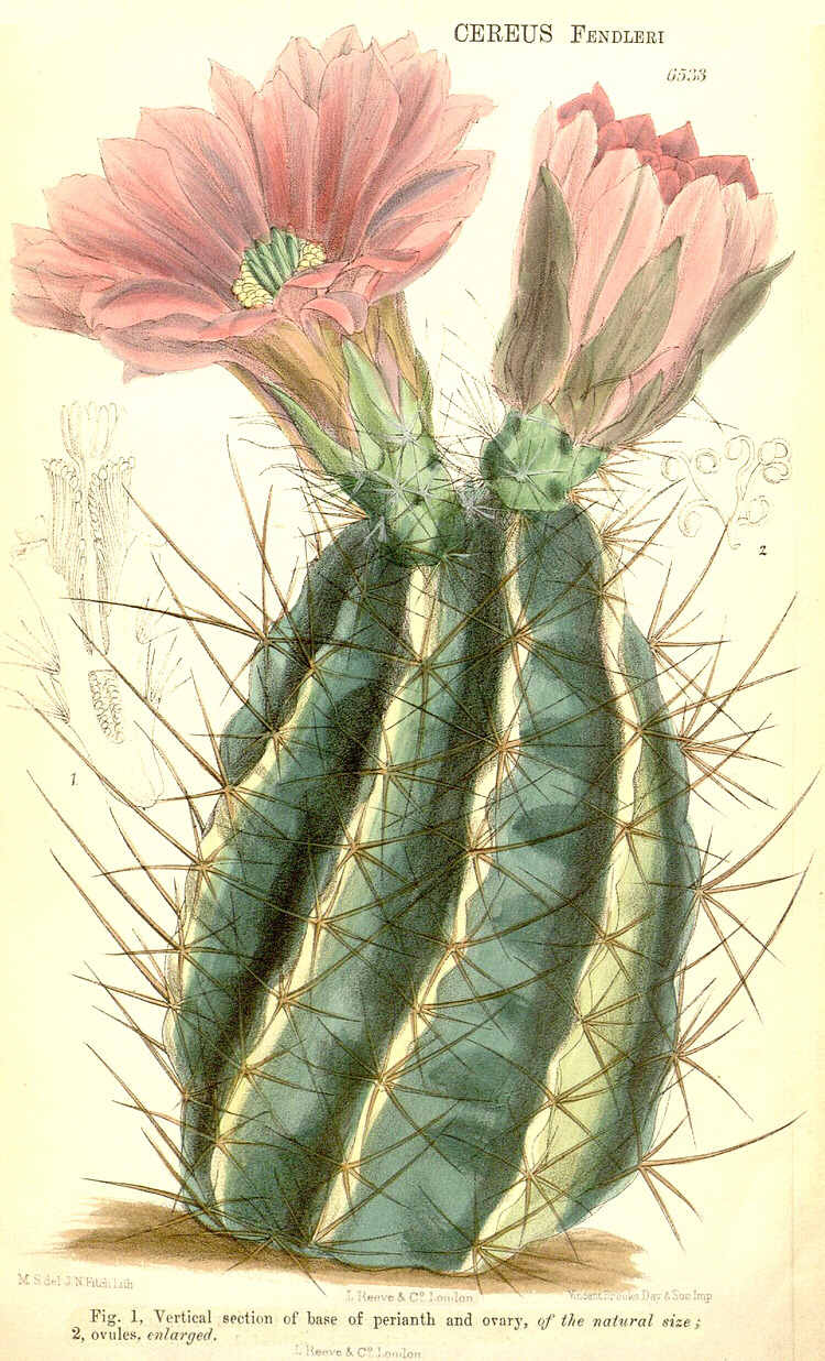 Illustrations. • Le Maout and Decaisne: Opuntia, Cactus. • Le Maout and Decaisne: Habit and technical details of Rhipsalis, Epiphyllum, Pereskia. • Aporocactus flagelliformis: Bot. Mag. 17 (1786). • Ariocarpus retusus (as Mamillaria prismatica): Bot. Mag. 119 (1893). • Carnegiea gigantea (as Cereus): Bot. Mag. 118 (1892). • Cleistocactus baumannii, as Cereus tweediei: Bot. Mag. 76 (1850). • Copiapoa marginata (as Echinocactus streptocaulon): Bot. Mag. 77 (1851). • Cylindropuntia imbricata (as Opuntia): Bot. Mag. 135 (1909). • Disocactus biformis, as Phyllocactus: Bot. Mag. 101 (1875). • Echinocereus fendleri (as Cereus): Bot. Mag. 106 (1880). • cf. Echinocereus leucanthus: as Cereus leucanthus, Bot. Reg. xxvi, 13 (1840). • Echinocereus viridiflorus (as Cereus): Bot. Mag. 125 (1899). • Echinocereus triglochidiatus var. mojavensis (as Cereus mojavensis): Bot. Mag. 126 (1900). • Echinopsis chamaecereus: L.W., photo. • Echinopsis chamaecereus (as Cereus silvestrii): Bot. Mag. 138 (1912). • Echinopsis eyriesii: as Echinocactus, Bot. Reg. 1707, 1835. • Escobaria vivipara (as Mammillaria): Bot. Mag. 126 (1900). • cf. Heleocereus speciosus: as Cereus speciosissimus, Bot. Reg. 49, 1842. • Lepismium houlletianum (as Rhipsalis houlletii): Bot. Mag. 100 (1874). • Lepismium lumbricoides (as Rhipsalis sarmentacea): Bot. Mag. 85 (1859). • Malacocarpus ottonis: as Echinocactus, Bot. Reg. XXIV, 42 (1838). • Malacocarpus scopa: Bot. Reg. 1839, 24. • Mammillaria rhodantha (as M. pulchra): Bot. Reg. 1329, 1830. • Opuntia humifusa (as O. rafinesquii): Bot. Mag. 115 (1889). • Opuntia polyacantha: Bot. Mag. 115 (1889). • Opuntia vulgaris: as O. monacantha, Bot. Reg. 1726, 1835. • Parodia scopa (as Echinocactus): Bot. Mag. 90 (1864). • Pelecyphora aselliformis: Bot. Mag. 99 (1873). • Pereskia aculeata: Bot. Reg. 1928, 1837. • Pereskia aculeata: Bot. Mag. 116 (1890). • Pereskia grandifolia: as Pereskia bleo, Bot. Reg. 1473 (1831). • Phyllocactus anguliger: Bot. Mag. 85 (1859). • Pseudorhipsalis amazonica (as Wittia panamensis): Bot. Mag. 145 (1919). • Rhipsalidopsis gaertneri (as Epiphyllum): Bot. Mag.117 (1891). • Weingartia neocumingii (as Echinocactus): Bot. Mag. 100 (1874). • Habit: Echinocactus, Rhipsalis.
