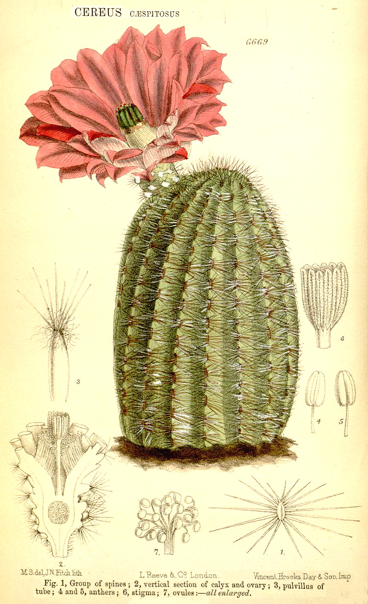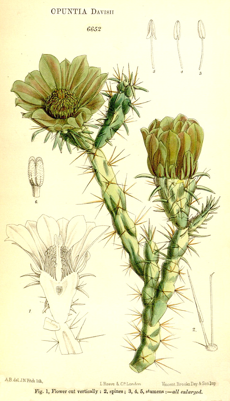 Illustrations. • Le Maout and Decaisne: Opuntia, Cactus. • Le Maout and Decaisne: Habit and technical details of Rhipsalis, Epiphyllum, Pereskia. • Aporocactus flagelliformis: Bot. Mag. 17 (1786). • Ariocarpus retusus (as Mamillaria prismatica): Bot. Mag. 119 (1893). • Carnegiea gigantea (as Cereus): Bot. Mag. 118 (1892). • Cleistocactus baumannii, as Cereus tweediei: Bot. Mag. 76 (1850). • Copiapoa marginata (as Echinocactus streptocaulon): Bot. Mag. 77 (1851). • Cylindropuntia davisii (as Opuntia): Bot. Mag. 108 (1882). • Cylindropuntia imbricata (as Opuntia): Bot. Mag. 135 (1909). • Disocactus biformis, as Phyllocactus: Bot. Mag. 101 (1875). • Echinocereus fendleri (as Cereus): Bot. Mag. 106 (1880). • cf. Echinocereus leucanthus: as Cereus leucanthus, Bot. Reg. xxvi, 13 (1840). • Echinocereus reichenbachii (as Cereus caespitosus): Bot. Mag. 109 (1883). • Echinocereus viridiflorus (as Cereus): Bot. Mag. 125 (1899). • Echinocereus triglochidiatus var. mojavensis (as Cereus mojavensis): Bot. Mag. 126 (1900). • Echinopsis chamaecereus: L.W., photo. • Echinopsis chamaecereus (as Cereus silvestrii): Bot. Mag. 138 (1912). • Echinopsis eyriesii: as Echinocactus, Bot. Reg. 1707, 1835. • Escobaria vivipara (as Mammillaria): Bot. Mag. 126 (1900). • cf. Heleocereus speciosus: as Cereus speciosissimus, Bot. Reg. 49, 1842. • Lepismium houlletianum (as Rhipsalis houlletii): Bot. Mag. 100 (1874). • Lepismium lumbricoides (as Rhipsalis sarmentacea): Bot. Mag. 85 (1859). • Malacocarpus ottonis: as Echinocactus, Bot. Reg. XXIV, 42 (1838). • Malacocarpus scopa: Bot. Reg. 1839, 24. • Mammillaria rhodantha (as M. pulchra): Bot. Reg. 1329, 1830. • Opuntia humifusa (as O. rafinesquii): Bot. Mag. 115 (1889). • Opuntia polyacantha: Bot. Mag. 115 (1889). • Opuntia vulgaris: as O. monacantha, Bot. Reg. 1726, 1835. • Parodia scopa (as Echinocactus): Bot. Mag. 90 (1864). • Pelecyphora aselliformis: Bot. Mag. 99 (1873). • Pereskia aculeata: Bot. Reg. 1928, 1837. • Pereskia aculeata: Bot. Mag. 116 (1890). • Pereskia grandifolia: as Pereskia bleo, Bot. Reg. 1473 (1831). • Phyllocactus anguliger: Bot. Mag. 85 (1859). • Pseudorhipsalis amazonica (as Wittia panamensis): Bot. Mag. 145 (1919). • Rhipsalidopsis gaertneri (as Epiphyllum): Bot. Mag.117 (1891). • Weingartia neocumingii (as Echinocactus): Bot. Mag. 100 (1874). • Habit: Echinocactus, Rhipsalis.
