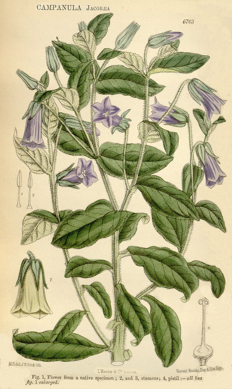 Illustrations. • Le Maout and Decaisne: Campanula. • Le Maout and Decaisne: Lobelia, Centropogon. • cf. Wahlenbergia subulata, as Lightfootia: Thonner. • Azorina vidalii, as Campanula: Hook. Ic. Pl. 7–8 (1844). • Burmeistera virescens: Standley and Steyermark, Fl. of Guatemala 11 (1963). • Campanula alpestris (as C. allionii): Bot. Mag. 107 (1881). • Campanula fragilis: Bot. Reg. 1738, 1835. • Campanula fragilis: Bot. Mag. 106 (1880). • Campanula glomerata: B. Ent., 1825). • Campanula isophylla: Bot. Mag. 94 (1868). • Campanula jacobaea: Bot. Mag. 109 (1883). • Campanula lusitanica (as C. loeflingii): Bot. Reg. 29 (19), 1843. • Campanula macrostyla: Bot. Mag. 104 (1878). • Campanula rotundifolia: Eng. Bot. 870 (1866). • Campanula stevenii subsp. beauverdiana: Bot. Mag. 136 (1910). • Campanula strigosa: Bot. Mag. 84 (1858). • Campanula sulphurea: Bot. Mag. 145 (1919). • Campanula tommasiniana: Bot. Mag. 107 (1881). • Campanula trachelium: B. Ent. 627. • Campanula trachelium: Eng. Bot. 867 (1866). • Centropogon coccineus (as Siphocampylus): Bot. Mag. 71 (1845). • Centropogon cordifolius: Standley and Steyermark, Fl. of Guatemala 11 (1963). • Codonopsis convolvulacea: Bot. Mag. 134 (1908). • Codonopsis gracilis, C. inflata and C. javanica: Hooker’s Illustrations of Himalayan plants (1855). • Codonopsis javanica subsp. javanica (as C. cordata): Bot. Mag. 89 (1863). • Codonopsis ovata: as Glossocomia ovata, Bot. Reg. 3, 1842. Codonopsis ovata. 1, vertical section of the trilocular ovary, showing placentas. • Codonopsis pilosula subsp. tangshen: Bot. Mag. 132 (1906). • Codonopsis rotundifolia: Bot Mag. 82 (1856). • Cyananthus lobatus: Bot. Mag. 106 (1880). • Cyananthus wardii: Hook. Ic. Pl. 33 (1935). • Dialypetalum floribundum: Hook. Ic. Pl. 12 (1876). • Downingia pulchella: as Clintonia, Bot. Reg. 1909 (1836). • Downingia pulchella: Bot. Mag. 102 (1876). • Edraianthus graminifolius (as Wahlenbergia kitaibelii): Bot. Mag. 101 (1875). • Edraianthus tenuifolius (as Wahlenbergia): Bot. Mag. 106 (1880). • Heterotoma lobelioides: Bot. Mag. 128 (1902). • Heterotoma macrocentron: Hook. Ic. Pl. 12 (1876). • Isotoma anethifolia: Hook. Ic. Pl. 32 (1933). • Isotoma fluviatilis (as Lobelia): Hooker, Fl. Tasmaniae (1860). • Jasione bulgarica: Hook. Ic. Pl. 32 (1930). • Lobelia pedunculata and Lobelia surrepens: Hooker, Fl. Tasmaniae (1860). • Lithotoma axillaris (as Isotoma senecioides var. subpinnatifida): Bot. Mag. 84 (1858). • Lobelia alsinoides, as trigona: Hook. Ic. Pl. 4 (1841). • Lobelia borneensis (as Pratia): Hook. Ic. Pl. 16 (1886). • Lobelia cardinalis (as L. splendens var. ignea): Bot. Mag. 83 (1857). • Lobelia decurrens: Bot. Reg 1842 (1836). • Lobelia erinus (as L. erinoides): Bot. Mag. 64 (1837). • Lobelia inflata: Köhler’s Medizinal-Pflanzen 2 (1890). • Lobelia kraussii: Bot. Mag. 57 (1830). • Lobelia nicotianifolia: Bot. Mag. 92 (1866). • Lobelia nummularia (as Pratia begonifolia): Bot. Reg. 1373, 1830. • Lobelia physaloides (as Colensoa): Bot. Mag. 112 (1886). • Lobelia polyphylla (a L. purpurea): Bot. Reg. 1325 (1830). • Lobelia texensis: Bot. Mag. 83 (1857). • Lobelia trigonocaulis: Bot. Mag. 84 (1858). • Lobelia urens: Eng. Bot. 862 (1866). • Michauxia tchihatchefii: Bot. Mag. 126 (1900). • Michauxia laevigata: Bot. Reg. 1451, 1831. • Michauxia laevigata: Bot. Mag. 59 (1832). • Musschia aurea: Bot. Mag. 107 (1881). • Musschia wollastonii: Bot. Mag. 92 (1866). • Nemacladus ramosissimus: Emory, Rep. of U.S. and Mexican Boundary Survey, 2 (1859). • Ostrowskia magnifica: Bot. Mag. 122 (1896). • Physoplexis comosa, as Phyteuma: Bot. Mag. 106 (1880). • Prismatocarpus tenellus: Hook. Ic. Pl. 15 (1884). • Rhigiophyllum squarrosum: Hook. Ic. Pl. 26 (1898). • Siphocampylus giganteus: Hook. Ic. Pl. 8 (1844). • Siphocampylus longepedunculatus: Bot. Mag. 69 (1843). • Siphocampylus manettiaeflorus: Bot. Mag. 74 (1848). • Siphocampylus microstoma: Bot. Mag. 73 (1847). • Siphocampylus reticulatus (as S. lantanifolius): Bot. Mag. 70 (1844). • Wahlenbergia collomioides (as Lightfootia leptophylla): Hook. Ic. Pl. 27 (1900). • Wahlenbergia saxicola: Hooker, Fl. Tasmaniae (1860). • Wahlenbergia saxicola: Bot. Mag. 108 (1882). • Wahlenbergia undulata: Bot. Mag. 117 (1891). • Wahlenbergia tuberosa: Bot. Mag. 101 (1875). • Campanula, Wahlenbergia, Legousia (B. Ent. compilation, 1824–1835). • Lobelia dortmannia, Lobelia urens (Lobelioideae: B. Ent. compilation, 1824–35).