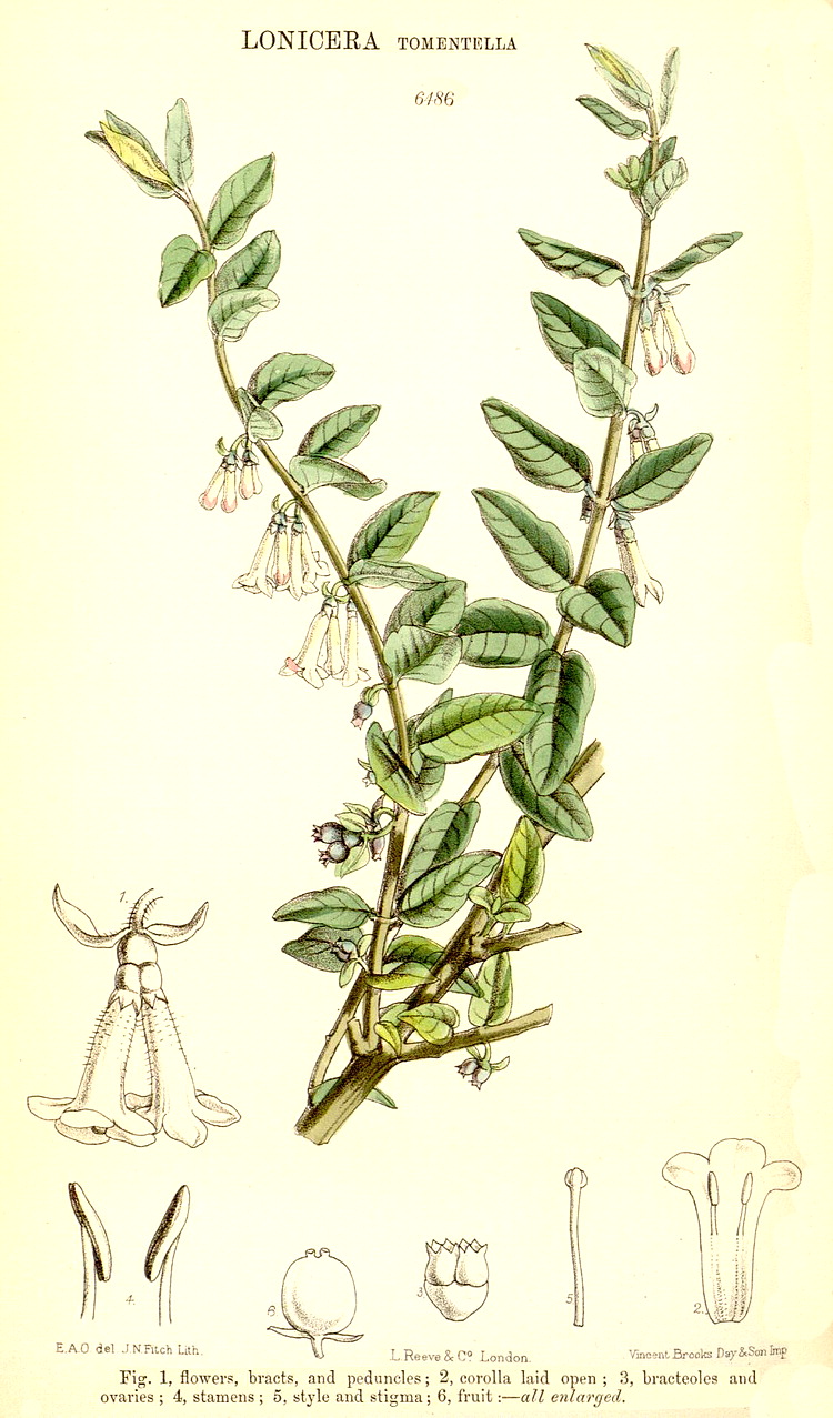 Illustrations. • Le Maout and Decaisne: Lonicera, Symphoricarpos. • Linnaea borealis, Lonicera tatarica: Lindley. • Diabelia spathulata (as Abelia): Bot. Mag. 108 (1882). • Kolkwitzia amabilis: Hook. Ic. Pl. 30 (1911). • Kolkwitzia amabilis: Bot. Mag. 140 (1914). • Leycesteria crocothyrsos: Hook. Ic. Pl. 32 (1932). • Leycesteria formosa: Bot. Mag. 65 (1839). • Leycesteria formosa: Bot. Reg. 1839, 2. • Leycesteria sinensis: Hook. Ic. Pl. 27 (1900). • Linnaea borealis: B. Ent. 762, 1839. • Linnaea floribunda (as Abelia): Bot. Mag. 73 (1847). • Linnaea parvifolia (as Abelia. longituba): Bot. Mag. 145 (1919). • Linnaea uniflora (as Abelia): Bot. Mag. 79 (1853). • Lonicera calcarata: Hook. Ic. Pl. 27 (1900). • Lonicera caprifolium: B. Ent. 124, 1826. • Lonicera ciliosa var. occidentalis: as Caprifolium occidentale, Bot. Reg. 1457 (1831). • Lonicera hildebrandiana: Bot. Mag. 125 (1899). • Lonicera hirsuta: Bot. Mag. 58 (1831). • Lonicera hirsuta: as Caprifolium, Bot. Reg. 1761, 1836. • Lonicera ligustrina var. pileata (as L. pileata): Bot. Mag. 132 (1906). • Lonicera pyrenaica: Bot. Mag. 127 (1901). • Lonicera periclymenum: Eng. Bot. 642 (1865). • Lonicera quinquelocularis: as L. diversifolia, Bot. Reg. 1844, 33. • Lonicera similis (var. delavayi): Bot. Mag. 145 (1919). • Lonicera standishii: Bot. Mag. 94 (1868). • Lonicera tomentella: Bot. Mag. 106 (1880). • Lonicera xylosteum: Eng. Bot. 643 (1865). • Symphoricarpos microphyllus: Bot. Mag. 83 (1857). • Weigela amabilis: Bot. Mag. 82 (1856). • Weigela florida (as W. rosea): Bot. Mag. 74 (1848). • Weigela middendorffiana (as Diervilla): Bot. Mag. 29 (1903).
