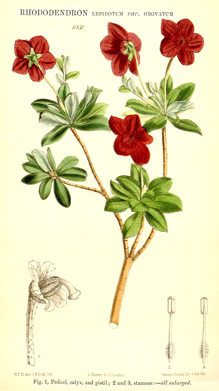 Illustrations. • Le Maout and Decaisne: Erica cinerea. • Le Maout and Decaisne: Rhododendron. • Le Maout and Decaisne: Vaccinium. • ‘Vaccinium serpens’ Wight (cf. Agapetes) and Agapetes salignum (as Vaccinium): Hooker’s Illustrations of Himalayan plants (1855). • Agapetes acuminata (as Epigynium): Bot. Mag. 83 (1857). • Agapetes brachypoda: Hook. Ic. Pl. 33 (1935). • Agapetes buxifolia: Bot. Mag. 83 (1857). • Agapetes flava (as Pentapterygium): Bot. Mag. 82 (1856). • Agapetes incurvata, as Pentapterygium rugosum: Bot. Mag. 86 (1860). • Agapetes linearifolia: Hook. Ic. Pl. 33 (1935). • Agapetes macrantha (as Thibaudia): Bot. Mag. 77 (1851). • Agapetes pensilis: Hook. Ic. Pl. 33 (1935). • Agapetes serpens (as Pentapterygium): Bot. Mag. 110 (1884). • Agapetes spissa: Hook. Ic. Pl. 33 (1935). • Agarista coriifolia (as Leucothoe neriifolia): Bot. Mag. 77 (1851). • Agarista salicifolia (as Andromeda): Bot. Mag. 60 (1833). • Andromeda polifolia: Eng. Bot. 883 (1866). • Aniserica gracilis: Hook. Ic. Pl. 30 (1911). • Arbutus menziesii: as A. procera, Bot. Reg. 1753, 1836. • Arbutus unedo (B. Ent., 1836). • Arbutus unedo: Eng. Bot. 882 (1866). • Arbutus xalapensis: Bot. Reg. 1839, 67. • Arbutus xalapensis (as A. mollis): Bot. Mag. 77 (1851). • Arctostaphylos alpinus (as A. alpina): Eng. Bot. 880 (1866). • Arctostaphylos manzanita: Bot. Mag. 133 (1907). • Arctostaphylos pungens: Bot. Reg. 1844, 17. • Arctostaphylos tomentosa: Bot. Reg. 1791, 1836. • Arctostaphylos uva-ursi: Köhler’s Medizinal-Pflanzen 2 (1890). • Arctostaphylos uva-ursae (B. Ent., 1835). • Artostaphylos uva-ursi: Eng. Bot. 881 (1866). • Bejaria aestuans (as B. coarctata): Bot. Mag. 75 (1849). • Bejaria aestuans (as Befaria): Bot. Mag. 80 (1854). • Bejaria aestuans (as B. glauca): Bot. Mag. 112 (1886). • Bejaria mathewsii (as Befaria): Bot. Mag. 83 (1857). • Bruckenthalia spiculifolia (= Erica): Bot. Mag. 133 (1907). • Cassiope fastigiata: Bot. Mag. 80 (1854). • Cassiope tetragona (as Andromeda): Bot. Mag. 59 (1832). • Cavendishia bracteata (as Thibaudia): Hook. Ic. Pl. 2 (1837). • Cavendishia bracteata (as Thiboudia cordifolia): Bot. Mag. 92 (1866). • Cavendishia bracteata, as Thibaudia acuminata: Bot. Mag. 95 (1869). • Calluna vulgaris (B. Ent., 1826). • Ceratostema longiflorum: Lemaire, Ilustr. Horticole (1854). • Ceratostema longiflorum: Bot. Mag. 80 (1854). • Comarostaphylis discolor: Hook. Ic. Pl. 1 (1837). • Comarostaphylis arbutoides: Bot. Reg. 29 (30), 1843. • Costera cyclophylla: Hook. Ic. Pl 33 (1935). • Daboecia cantabrica (B. Ent.). • Daboecia cantabrica (as Menziesia polifolia): Eng. Bot. 885 (1866). • Diplycosia ciliata: Hook. Ic. Pl. 9 (1852). • Elliottia pyroliflora (as Cladothamnus): Bot. Mag. 137 (1911). • Elliottia racemosa: Bot. Mag. 138 (1912). • Enkianthus campanulatus: Bot. Mag. 115 (1889). • Enkianthus deflexus (as E. himalaicus): Bot. Mag. 105 (1879). • Enkianthus parulatus (as Enkyanthus japonicus): Bot. Mag. 96 (1870). • Eremia curvistyla (as Eremiopsis): Hook. Ic. Pl. 30 (1911). • Erica australis: Bot. Mag. 131 (1905). • Erica chamissonis: Bot. Mag. 100 (1874). • Erica chloroloma: Bot. Reg. XXIV, 17 (1838). • Erica cinerea (B. Ent., 1824). • Erica eugenea (as E. haroldiana): Bot. Mag. 146 (1920). • Erica irbyana: Bot. Mag. 69 (1843). • Erica mannii (as Ericinella): Bot. Mag. 92 (1866). • Erica miniscula (as Lepterica): Hook. Ic. Pl. 30 (1911). • Erica platycalyx (as Platycalyx pumila): Hook. Ic. Pl. 30 (1911). • Erica recurvata: Bot. Mag. 62 (1835). • Erica shannonii (as E. shannoniana): Bot. Mag. 70 (1844). • Erica sicula (as Pentapera): Bot. Mag. 114 (1888). • Erica tetralix (B. Ent., 1824). • Eurygania ovata: Bot. Mag. 104 (1878). • Gaultheria antarctica: Hooker, Fl. Antarctica (1844). • Gaultheria bracteata: Bot. Mag. 75 (1849). • Gaultheria codonantha: Hook. Ic. Pl. 33 (1935). • Gaultheria cuneata: Bot. Mag. 145 (1919). • Gaultheria discolor: Bot. Mag. 84 (1858). • Gaultheria dumicola var. petanoneuron: Hook. Ic. Pl. 33 (1933). • Gaultheria eriophylla (as G. ferruginea): Bot. Mag. 79 (1853). • Gaultheria fragrantissima: Bot. Mag. 98 (1872). • Gaultheria insana (as Pernettya furiens): Bot. Mag. 82 (1856). • Gaultheria insipida: Bot. Mag. 99 (1873). • Gaultheria lanceolata: Hooker, Fl. Tasmaniae (1860). • Gaultheria mucronata (as Pernettya): Bot. Reg. 1675, 1835. • Gaultheria mucronata (as Pernettya mucronata var. angustifolia): Bot. Reg. xxvi, 63 (1840). Gaultheria mucronata. 1, flower with corolla shed, showing the hypogynous scales in pairs opposite the sepals. 2, a stamen with its bifurcate, 4-horned anther. • Gaultheria mucronata (as Arbutus): Bot. Mag. 58 (1831). • Gaultheria mucronata var. microphylla (as Pernettya angustifolia): Bot. Mag. 68 (1841). • Gaultheria myrsinoides (as Pernettya pentlandii): Bot. Mag. 101 (1875). • Gaultheria oppositifolia: Hooker, Fl. Novae-Zelandiae (1853). • Gaultheria phillyreifolia: as Andromeda phyllireaefolia, Bot. Reg. 1844, 36. • Gaultheria rupestris: Hooker, Fl. Novae-Zelandiae (1853). • Gaultheria shallon: Bot. Reg. 1411, 1831. • Gaultheria tasmanica (as Pernettya) and G. depressa (as G. antipoda): Hooker, Fl. Tasmaniae (1860). • Gaultheria tomentosa: Hook. Ic. Pl. 4 (1841). • Gaultheria trichophylla: Bot. Mag. 125 (1899). • Gaylussacia brasiliensis (as G. pseudovaccinium): Bot. Reg. 1844, 62. Gaylussacia brasiliensis. 1, a mature stamen, exemplifying porose dehiscence from the tips of long anther appendages. The latter develop basally on the anther locules, their terminal position on the mature stamens resulting from inversion of the anthers as they mature (developmental inversion of the anthers is typical of ericalean families). 2, transverse section of the inferior ovary. • Kalmia cuneata: Bot. Mag. 136 (1910). • Ledum glandulosum: Bot. Mag. 124 (1898). • L