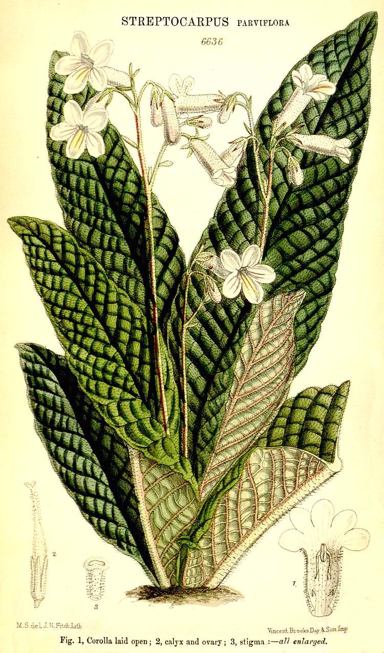 Illustrations. • Le Maout and Decaisne: Ramonda. • Le Maout and Decaisne: Gesneria, Dircaea (= Corytholoma), Moussonia (= Isoloma), "Tidaea". • Le Maout and Decaisne: Ligeria (= Sinningia), Achimenes, Pentarhaphia. • Le Maout and Decaisne: Aeschynanthus, Columnea, Nematanthus, Streptocarpus. • Le Maout and Decaisne: Alloplectus, Tapeinotes (= Sinningia), Hypocyrta. • Achimenes erecta (as A. rosea): Bot. Reg. 65, 1841. • Achimenes longiflora: Bot. Reg. 19, 1842. • Achimenes longiflora: Bot. Mag. 69 (1842). • Achimenes mexicana (as Scheeria): Bot. Mag. 79 (1853). • Achimenes skinneri (as A. hirsuta): Bot. Reg. 29, 55 (1843). • Aeschynanthus albidus (as A. purpurascens): Bot. Mag. 72 (1846). • Aeschynanthus cordifolius: Bot. Mag. 85 (1859). • Aeschynanthus fulgens: Bot. Mag. 82 (1856). • Aeschynanthus lobbianus: Bot. Mag. 72 (1846). • Aeschynanthus obconica: Bot. Mag. 120 (1894). • Aeschynanthus parasiticus (as A. grandiflorus): Bot. Reg. 49, 1841. Aeschynanthus parasiticus. 1 and 2, transverse and longitudinal sections of the ovary, showing the unusual variation on “unilocular with parietal placentation”. • Aeschynanthus pulcher (as A. javanicus): Bot. Mag. 76 (1850). • Aeschynanthus ramosissimus: as A. maculatus, Bot. Reg. 28, 1841. • Aeschynanthus speciosus: Bot. Mag. 73 (1847). • Aeschynanthus tricolor: Bot. Mag. 84 (1858). • Agalmyla elongata (as Dichrotrichum ternateum): Bot. Mag. 110 (1884). • Agalmyla parasitica (as A. staminea): Bot. Mag. 94 (1868). • Alsobia punctata (as Drymonia): Bot. Mag. 70 (1844). • Besleria lutea (as B. imray): Bot. Mag. 104 (1878). • Besleria leucostoma (as Hypocyrta): Bot. Mag. 73 (1847). • Besleria umbrosa: Martius, Nova Gen. et Spec. Pl. Brasiliensium 3 (1829). • Briggsia longipes (as Didissandra): Hook. Ic. Pl. 24 (1895). • Primulina dryas (as Chirita sinensis): Bot. Reg. 1844, 59. Primulina dryas. 1, corolla split open to show the layout of the androecium. 2, the gynoecium. 3, transverse section of the ovary, showing the patttern of placentation typical of the family. • Centrosolenia densa (as Episcia): Bot. Mag. 122 (1896). • Codonoboea crinita (as Didymocarpus): Bot. Mag. 77 (1851). • Codonoboea malayana (as Didymocarpus): Bot. Mag. 123 (1897). • Columnea microcalyx (as C. gloriosa): Bot. Mag. 137 (1911). • Columnea minor (as Trichantha): Bot. Mag. 90 (1864). • Columnea repens (as Alloplectus): Bot. Mag. 72 (1846). • Columnea sanguinea (as C. aureonitens): Bot. Mag. 73 (1847). • Columnea scandens: Bot. Mag. 85 (1859). • Columnea schiediana: Goebel. • Conandron ramondioides: Bot. Mag. 106 (1880). • Corytoplectus schlimii (as Hypocyrta pulchra): Bot. Mag. 122 (1896). • Crantzia tigrina (as Heintzia): Bot. Mag. 80 (1854). • Dorcoceras hygrometricum (as Baea): Bot. Mag. 105 (1879). • Drymonia peltata (as Alloplectus): Bot. Mag. 103 (1877). • Drymonia serratula, as D. calcarata: Martius, Nova Gen. et Spec. Pl. Brasiliensium 3 (1829). • Drymonia serratula: as D. bicolor, Bot. Reg. XXIV, 4 (1838). Drymonia serratula. 1, ovary, with oblique hypogynous disk and dorsal gland (detail of the stigma is to the right). 2, transverse section of the ovary, showing placentation. • Episcia cupreata (as Achimenes): Bot. Mag. 73 (1847). • Episcia erythropus: Bot. Mag. 102 (1876). • Episcia lilacina (as E. chontalensis): Bot. Mag. 97 (1971). • Episcia melittifolia: Bot. Mag. 79 (1853). • Episcia reptans: Martius, Nova Gen. et Spec. Pl. Brasiliensium 3 (1829). • Episcia reptans (as E. fulgida): Bot. Mag. 100 (1874). • Eucodonia verticillata (as Scheeria lanata): Bot. Mag. 83 (1857). • Fieldia australis: Bot. Mag. 84 (1858). • Gesneria cinnabarina: Bot. Mag. 84 (1858). • Gesneria faucialis: as Gesnera, Bot. Reg. 1785, 1836. • Gesneria lateritia: as Gesnera, Bot. Reg. 1950, 1837. • Gesneria pumila subsp. neglecta, as Conradia: Hook. Ic. Pl. 9 (1852). • Gloxinia erinoides (as Achimenes argyostigma): Bot. Mag. 71 (1845). • Gloxiniopsis racemosa (as Monopyle): Bot. Mag. 102 (1876). • Haberlea rhodopensis: Bot. Mag. 108 (1882). • Henckelia communis (as Chirita zeylanica): Bot. Mag. 71 (1845). • Henckelia humboldtiana (as Didymocarpus): Bot. Mag. 79 (1853). • Henckelia humboldtiana (as Didymocarpus primulaefolia): Bot. Mag. 86 (1860). • Henckelia speciosa (as Chirita trailliana): Bot. Mag. 143 (1917). • Henckelia walkerae: Bot. Mag. 73 (1847). • Isoloma longifolium: as Gesnera longifolia, Bot. Reg. 40, 1842. • Kohleria amabilis (as Tydaea): Bot. Mag. 83 (1857). • Kohleria hirsuta (as Isoloma erianthum): Bot. Mag. 129 (1903). • Kohleria inaequalis, as Tydaea warscewiczii: Lemaire, Illustr. Horticole (1854). • Kohleria inaequalis var. ocellata (as Achimenes ocellata): Bot. Mag. 74 (1848). • Kohleria spicata (as Gesneria schiediana): Bot. Mag. 71 (1845). • Kohleria warszewiczii (as Sciodacalyx): Bot. Mag. 81 (1855). • Liebigia barbata (as L. speciosa): Bot. Mag. 73 1847). • Lysionotus serratus: Bot. Mag. 107 (1881). • Microchirita rupestris (as Chirita): Bot. Mag. 136 (1910). • Nautilocalyx bicolor (as Episcia): Bot. Mag. 74 (1848). • Nautilocalyx bracreatus (as Centrosolenia bractescens): Bot. Mag. 78 (1852). • Nautilocalyx lynchii (as Alloplectus): Bot. Mag. 118 (1892). • Nematanthus crassifolius subsp. chloronema (as N. chloronema): Bot. Mag. 70 (1844). • Nematanthus hirsutus, as Hypocyrta: Martius, Nova Gen. et Spec. Pl. Brasiliensium 3 (1829). • Nematanthus lanceolatus (as Alloplectus concolor): Bot. Mag. 74 (1848). • Nematanthus sericeus (as Hypocyrta strigillosa): Bot Mag. 69 (1843). • Nematanthus strigillosus (as Hypocyrta glabra): Bot. Mag. 74 (1848). • Niphaea oblonga: Bot. Reg. 5, 1842. Niphaea oblonga. 1, corolla tube openened to show the androecium. 2 and 3, vertical and transverse sections of the ovary. • Oreocharis forrestii: Curtis Bot. Mag. 143 (1917). • Ornithoboea lacei: Bot. Mag. 141 (1915). 