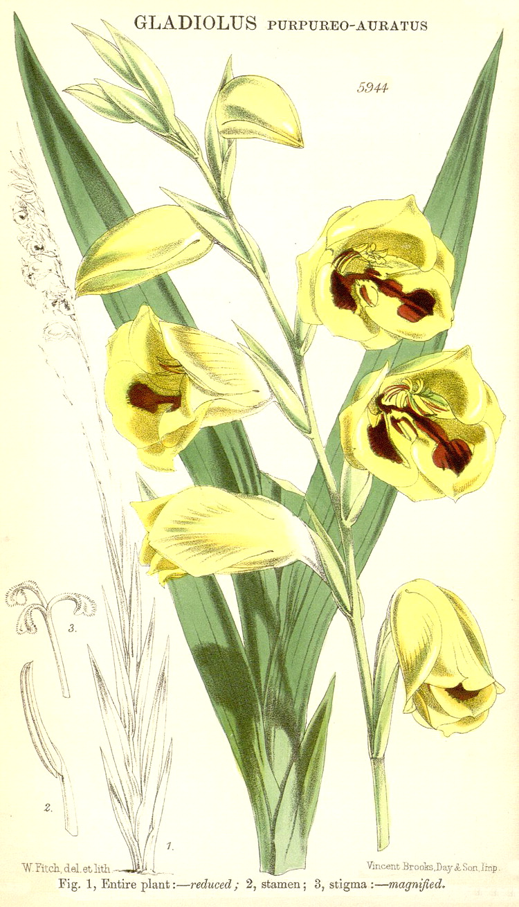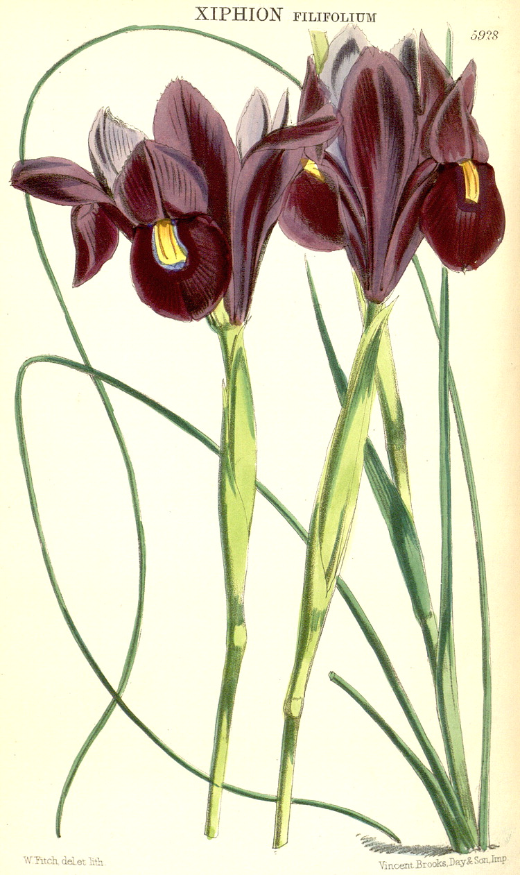 Illustrations. • Le Maout and Decaisne: Iris, Pardanthus (= Belamcanda). • Le Maout and Decaisne: Crocus vernus, Hydrotaenia (= Tigridia). • Aristea anceps: Wood and Evans, Natal Plants 6 (1912). • Babiana ringens: Bot. Mag. 109 (1883). • Babiana spathacea: Hook. Ic. Pl. 28 (1901). • Calydorea xyphioides (as Sisyrinchium speciosum): Bot. Bag. 64 (1837). • Crocosmia aurea (as Tritonia): Bot. Mag. 73 (1847). • Crocosmia fucata: as Tritonia, Bot. Reg. XXIV, 35 (1838). • Crocus chrysanthus: Bot. Mag. 101 (1875). • Crocus biflorus var. pusillus(?): as C. pusillus, Bot. Reg. 1987, 1837. • Crocus imperati: Bot. Reg. 1993, 1837. • Crocus minimus and C. fleischeri: Bot. Mag. 101 (1875). • Crocus nudiflorus: Eng. Bot. 1500 (1869). • Crocus ochroleucus: Bot. Mag. 88 (1862). • Crocus speciosus: Bot. Reg. 1839, 040. • Crocus suaveolens: Bot. Mag. 67 (1841). • Crocus tournefortii (as C. orphanidis): Bot. Mag. 95 (1869). • Crocus vernus: Bot. Mag. 2 (1788). • 'Croci autumnales' (see Notes): 5 species, Bot. Reg. 1844, 3. 'Croci Autumnales'. 1, Crocus pulchellus; 2, C. pallasianus; 3, C. cartwrightianus; 4, C. longiflorus; 5, C. odorus; 6, C. thomasianus. • Cyanixia socotrana (as Babiana): Bot. Mag. 107 (1881). • Dierama pendulum: as Sparaxis pendula, Bot. Reg. 360, 1830. • Dierama pulcherrimum (as Sparaxis): Bot. Mag. 92 (1866). • Freesia grandiflora (as Lapeyrousia): Bot. Mag. 113 (1887). • Gladiolus aequinoctalis (as Acidanthera): Bot. Mag. 121 (1895). • Gladiolus candidus, as Acidanthus: Bot. Mag. 129 (1903). • Gladiolus cruentus: Bot. Mag. 95 (1869). • Gladiolus dalenii, subsp. dalenii: Bot. Mag. 97 (1871). • Gladiolus grandiflorus (as Geissorhiza grandis): Bot. Mag. 96 (1870). • Gladiolus kotschyanus: Bot. Mag. 112 (1886). • Gladiolus papilio: Bot. Mag. 92 (1866). • Gladiolus papilio (as G. purpureo-auratus): Bot. Mag. 98 (1872). • Gladiolus saundersii: Bot. Mag. 96 (1870). • Gladiolus schweinwurthii (as Antholyza): Bot. Mag. 126 (1900). • Gladiolus sericeo-villosus: Bot. Mag. 90 (1864). • Herbertia amatorum: Bot. Mag. 134 (1908). • Hesperantha coccinea (as Schizostylis): Bot Mag. 90 (1864). • Hesperoxiphion peruvianum (as Cypella): Bot. Mag. 102 (1876). • Iris alata: Bot. Reg 1876 (1836). • Iris aphylla (as I. nudicaulis): Bot. Mag. 95 (1869). • Iris filifolia (as Xiphion): Bot. Mag. 97 (1871). • Iris foetidissima (B. Ent.). • Iris histrio (as Xiphion): Bot. Mag. 99 (1873). • Iris iberica: Bot. Mag. 96 (1870). • Iris juncea (as Xiphion junceum): Bot. Bag. 97 (1871). • Iris kolpakowskianum, as Xiphion: Bot. Mag. 106 (1880). • Iris milesii: Bot. Mag. 112 (1886). • Iris orientalis, as I. ochroleuca: Bot. Mag. 2 (1788). • Iris pallida: Köhler’s Medizinal-Pflanzen 2 (1890). • Iris paradoxa: Bot. Mag. 115 (1889). • Iris pseudacorus (B. Ent.). • Iris reichenbachii: Bot. Mag. 145 (1919). • Iris reticulata: Bot. Mag. 92 (1866). • Iris sibirica: Bot. Mag. 2 (1788). • Iris spuria: Bot. Mag. 2 (1788). • Iris unguicularis var. unguicularis (as I. stylosa): Bot. Mag. 95 (1869). • Isophysis tasmanica, as Hewardia: Hook. Ic. Pl. 9 (1852). • Isophysis tasmanica and Nivenia dispar: Ann. Miss. Bot. Gard. 77 (1990). • Lapeyrousia anceps: Bot. Reg. 1903 (1836). • Lapeyrousia fabricii: Thonner. • Libertia chilensis (as L. formosa): Bot. Mag. 61 (1834). • Libertia paniculata: Bot. Mag. 102 (1876). • Libertia pulchella (as L. lawrencei): Hooker, Fl. Tasmaniae (1860). • Moraea algoensis, M. barnardii, M. barkeri, M. debilis, M. thomasii, M. tripetala: Ann. Miss. Bot. Gard. 63 (1976). • Moraea fugax (as Vieussieuxia): Bot. Mag. 90 (1864). • Moraea gawleri (as M. sulphurea): Bot. Mag. 125 (1899). • Moraea huttonii (as Dietes): Bot. Mag. 101 (1875). • Moraea ramosissima (as M. bulbifera): Bot. Mag. 95 (1869). • Nemastylis geminiflora, as N. acuta: Bot. Mag. 109 (1883). • Neomarica brachypus (as Marica): Bot. Mag. 104 (1878). • Neomarica caerulea (as Cypella): Bot. Mag. 92 (1866). • Olsynium douglasii (as Sisyrinchium grandiflorum): Bot. Mag. 63 (1836). • Olsynium filifolium (as Sisyrinchium): Bot. Mag. 111 (1885). • Patersonia occidentalis: flower (photo). • Patersonia occidentalis: habit (photo). • Patersonia occidentalis var. occidentalis: Bot. Reg. 1839, 60. • Romulea columnae, as Trichonema: Curtis, B. Ent. t.612 (1836). • Sisyrinchium graminifolium: Bot. Reg. 1915 (1836). • Solenomelus pedunculatus (as Sisyrinchium): Bot. Mag. 57 (1830). • Syringodea pulchella: Bot. Mag. 99 (1873). • Tigridia flammea (as Rigidella): Bot. Reg. xxvi, 16 (1840). Tigridia flammea. 1, detail of the distal part of the staminal column, with the anthers enclosing the stigma. 2, detail of the stigma. 3, a ripe capsule. 4, a seed, showing the raphe and distended chalaza. • Tigridia immaculata (as Rigidella): Bot. Reg. 68, 1841. • Tigridia pavonia (as T. lutea): Bot. Mag. 103 (1877). • Tigridia pavonia (as T. pringlei): Bot. Mag. 115 (1889). • Tigridia meleagris (as Hydrotaenia): Bot. Reg. 39, 1842. Tigridia meleagris. 1, perianth member viewed from within. 2, detail of the column. 3, column with anthers removed to reveal style and stigmas. • Tigridia violacea: Bot. Mag. 120 (1894). • Trimezia gracilis (as Marica): Bot. Mag. 66 (1839). • Watsonia aletroides: Pole Evans, Fl. Pl. (S.) Africa 25 (1945). • Watsonia densiflora: Bot. Mag. 104 (1878).