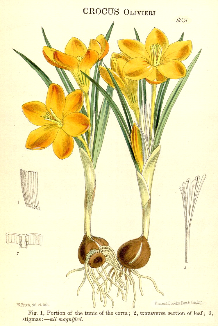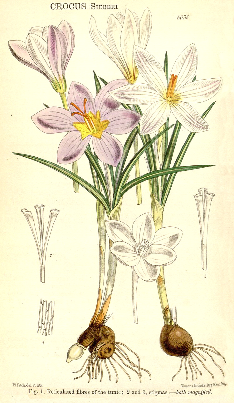 Illustrations. • Le Maout and Decaisne: Iris, Pardanthus (= Belamcanda). • Le Maout and Decaisne: Crocus vernus, Hydrotaenia (= Tigridia). • Aristea anceps: Wood and Evans, Natal Plants 6 (1912). • Babiana ringens: Bot. Mag. 109 (1883). • Babiana spathacea: Hook. Ic. Pl. 28 (1901). • Calydorea xyphioides (as Sisyrinchium speciosum): Bot. Bag. 64 (1837). • Crocosmia aurea (as Tritonia): Bot. Mag. 73 (1847). • Crocosmia fucata: as Tritonia, Bot. Reg. XXIV, 35 (1838). • Crocus chrysanthus: Bot. Mag. 101 (1875). • Crocus biflorus var. pusillus(?): as C. pusillus, Bot. Reg. 1987, 1837. • Crocus imperati: Bot. Reg. 1993, 1837. • Crocus minimus and C. fleischeri: Bot. Mag. 101 (1875). • Crocus nudiflorus: Eng. Bot. 1500 (1869). • Crocus ochroleucus: Bot. Mag. 88 (1862). • Crocus olivieri: Bot. Mag. 99 (1873). • Crocus salzmannii: Bot. Mag. 98 (1872). • Crocus sieberi: Bot. Mag. 99 (1873). • Crocus speciosus: Bot. Reg. 1839, 040. • Crocus suaveolens: Bot. Mag. 67 (1841). • Crocus tournefortii (as C. orphanidis): Bot. Mag. 95 (1869). • Crocus vernus: Bot. Mag. 2 (1788). • 'Croci autumnales' (see Notes): 5 species, Bot. Reg. 1844, 3. 'Croci Autumnales'. 1, Crocus pulchellus; 2, C. pallasianus; 3, C. cartwrightianus; 4, C. longiflorus; 5, C. odorus; 6, C. thomasianus. • Cyanixia socotrana (as Babiana): Bot. Mag. 107 (1881). • Dierama pendulum: as Sparaxis pendula, Bot. Reg. 360, 1830. • Dierama pulcherrimum (as Sparaxis): Bot. Mag. 92 (1866). • Freesia grandiflora (as Lapeyrousia): Bot. Mag. 113 (1887). • Gladiolus aequinoctalis (as Acidanthera): Bot. Mag. 121 (1895). • Gladiolus candidus, as Acidanthus: Bot. Mag. 129 (1903). • Gladiolus cruentus: Bot. Mag. 95 (1869). • Gladiolus dalenii, subsp. dalenii: Bot. Mag. 97 (1871). • Gladiolus grandiflorus (as Geissorhiza grandis): Bot. Mag. 96 (1870). • Gladiolus kotschyanus: Bot. Mag. 112 (1886). • Gladiolus papilio: Bot. Mag. 92 (1866). • Gladiolus papilio (as G. purpureo-auratus): Bot. Mag. 98 (1872). • Gladiolus saundersii: Bot. Mag. 96 (1870). • Gladiolus schweinwurthii (as Antholyza): Bot. Mag. 126 (1900). • Gladiolus sericeo-villosus: Bot. Mag. 90 (1864). • Herbertia amatorum: Bot. Mag. 134 (1908). • Hesperantha coccinea (as Schizostylis): Bot Mag. 90 (1864). • Hesperoxiphion peruvianum (as Cypella): Bot. Mag. 102 (1876). • Iris alata: Bot. Reg 1876 (1836). • Iris aphylla (as I. nudicaulis): Bot. Mag. 95 (1869). • Iris filifolia (as Xiphion): Bot. Mag. 97 (1871). • Iris filifolia (as Xiphion tingitanum): Bot. Mag. 98 (1872). • Iris foetidissima (B. Ent.). • Iris histrio (as Xiphion): Bot. Mag. 99 (1873). • Iris iberica: Bot. Mag. 96 (1870). • Iris juncea (as Xiphion junceum): Bot. Bag. 97 (1871). • Iris kolpakowskianum, as Xiphion: Bot. Mag. 106 (1880). • Iris milesii: Bot. Mag. 112 (1886). • Iris orientalis, as I. ochroleuca: Bot. Mag. 2 (1788). • Iris pallida: Köhler’s Medizinal-Pflanzen 2 (1890). • Iris paradoxa: Bot. Mag. 115 (1889). • Iris pseudacorus (B. Ent.). • Iris reichenbachii: Bot. Mag. 145 (1919). • Iris reticulata: Bot. Mag. 92 (1866). • Iris sibirica: Bot. Mag. 2 (1788). • Iris spuria: Bot. Mag. 2 (1788). • Iris unguicularis var. unguicularis (as I. stylosa): Bot. Mag. 95 (1869). • Isophysis tasmanica, as Hewardia: Hook. Ic. Pl. 9 (1852). • Isophysis tasmanica and Nivenia dispar: Ann. Miss. Bot. Gard. 77 (1990). • Lapeyrousia anceps: Bot. Reg. 1903 (1836). • Lapeyrousia fabricii: Thonner. • Libertia chilensis (as L. formosa): Bot. Mag. 61 (1834). • Libertia paniculata: Bot. Mag. 102 (1876). • Libertia pulchella (as L. lawrencei): Hooker, Fl. Tasmaniae (1860). • Moraea algoensis, M. barnardii, M. barkeri, M. debilis, M. thomasii, M. tripetala: Ann. Miss. Bot. Gard. 63 (1976). • Moraea fugax (as Vieussieuxia): Bot. Mag. 90 (1864). • Moraea gawleri (as M. sulphurea): Bot. Mag. 125 (1899). • Moraea huttonii (as Dietes): Bot. Mag. 101 (1875). • Moraea ramosissima (as M. bulbifera): Bot. Mag. 95 (1869). • Nemastylis geminiflora, as N. acuta: Bot. Mag. 109 (1883). • Neomarica brachypus (as Marica): Bot. Mag. 104 (1878). • Neomarica caerulea (as Cypella): Bot. Mag. 92 (1866). • Olsynium douglasii (as Sisyrinchium grandiflorum): Bot. Mag. 63 (1836). • Olsynium filifolium (as Sisyrinchium): Bot. Mag. 111 (1885). • Patersonia occidentalis: flower (photo). • Patersonia occidentalis: habit (photo). • Patersonia occidentalis var. occidentalis: Bot. Reg. 1839, 60. • Romulea columnae, as Trichonema: Curtis, B. Ent. t.612 (1836). • Sisyrinchium graminifolium: Bot. Reg. 1915 (1836). • Solenomelus pedunculatus (as Sisyrinchium): Bot. Mag. 57 (1830). • Syringodea pulchella: Bot. Mag. 99 (1873). • Tigridia flammea (as Rigidella): Bot. Reg. xxvi, 16 (1840). Tigridia flammea. 1, detail of the distal part of the staminal column, with the anthers enclosing the stigma. 2, detail of the stigma. 3, a ripe capsule. 4, a seed, showing the raphe and distended chalaza. • Tigridia immaculata (as Rigidella): Bot. Reg. 68, 1841. • Tigridia pavonia (as T. lutea): Bot. Mag. 103 (1877). • Tigridia pavonia (as T. pringlei): Bot. Mag. 115 (1889). • Tigridia meleagris (as Hydrotaenia): Bot. Reg. 39, 1842. Tigridia meleagris. 1, perianth member viewed from within. 2, detail of the column. 3, column with anthers removed to reveal style and stigmas. • Tigridia violacea: Bot. Mag. 120 (1894). • Trimezia gracilis (as Marica): Bot. Mag. 66 (1839). • Watsonia aletroides: Pole Evans, Fl. Pl. (S.) Africa 25 (1945). • Watsonia densiflora: Bot. Mag. 104 (1878).