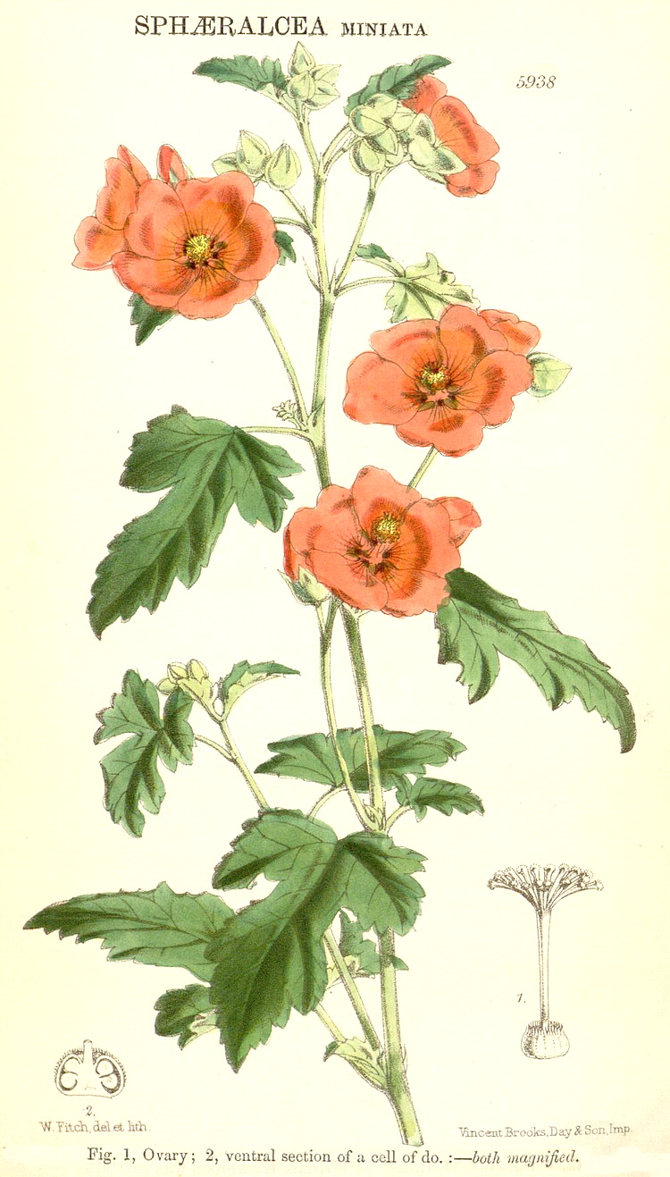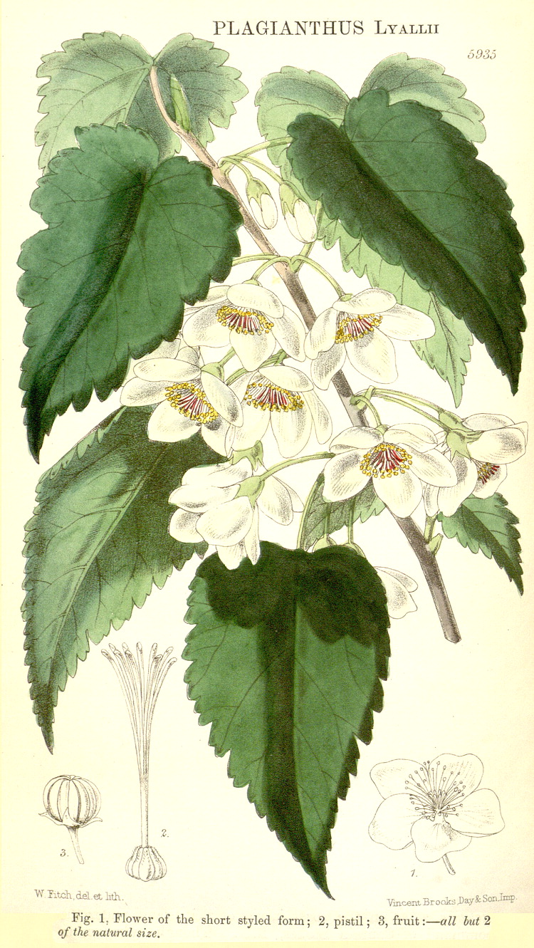 Illustrations. • Le Maout and Decaisne: Malva, Lavatera. • Le Maout and Decaisne: Althaea, Plagianthus. • Abelmoschus manihot (as Hibiscus): Bot. Mag. 127 (1901). • Abutilon (Sida) bedfordianum: Bot. Mag. 68 (1842). • Abutilon darwinii: Bot. Mag. 97 (1871). • Abutilon hirtum (as Sida graveolens): Bot. Mag. 71 (1845). • Abutilon insigne: Bot. Mag. 81 (1855). • Abutilon sinense: Hook. Ic. Pl. 18 (1887). • Abutilon, Malva: Lindley. • Abelmoschus moschatus: R. Wight, Ic. Pl. Indiae Orientalis 2 (1843). • Abutilon venosum (as Sida): Bot. Mag. 75 (1849). • Althaea hirsuta and Althaea officinalis: Eng. Bot. 277–278, 1864. • Alcea rosea, as Althaea: Köhler’s Medizinal Pflanzen 1 (1887). • Alcea rosea subsp ficifolia (as Althaea): Bot. Mag. 118 (1892). • Alyogyne cuneiformis (as Fugosia): Bot. Mag. 89 (1863). • Alyogyne hakeifolia: as Hibiscus lilacinus, Bot. Reg. 2009, 1837. • Alyogyne hakeifolia: Bot. Mag. 72 (1846). • Alyogyne huegelii: as Hibiscus wragae, Bot. Reg. xxvi, 69 (1840). • Alyogyne huegelii (as Hibiscus grossularifolius): Bot. Mag. 73 (1847). • Asterotrichion discolor (as Plagianthus sidoides): Bot Mag. 62 (1835). • Boschia mansonii: Hook. Ic. Pl 31 (1915). • Callianthe megapotamica (as Abutilon vexillarium): Bot. Mag. 94 (1868). • Callianthe picta (as Sida): Bot. Mag. 67 (1840). • Callirhoe incolucrata (as Malva): Bot. Mag. 78 (1852). • Cienfuegosia heterophylla (as Fugosia): Bot. Mag. 72 1846). • Cola natalensis: Hook. Ic. Pl. 14 (1880–82). • Corynabutilon vitifolium (as Sida): Bot. Mag. 72 (1846). • Corynabutilon vitifolium (as Abutilon): Bot. Mag. 119 (1893). • Gossypium barbadense (Sea Island/Long-stapled cotton): R. Wight (1840). • Gossypium barbadense (Upland Georgian/Short-stapled cotton; cf. G. hirsutum): R. Wight (1840). • Hibiscus aponeurus: Bot. Mag. 134 (1908). • Hibiscus cameronii: Bot. Mag. 68 (1842). • Hibiscus elatus (as Paritium elatum): Bot. Mag. 87 (1861). • Hibiscus genevii: Bot. Mag. 59 (1832). • Hibiscus indicus (as H. venustus): Bot. Mag. 117 (1891). • Hibiscus marmoratus: Bot. Mag. 94 (1868). • Hibiscus hybrid, 'cameroni-fulgens': Bot. Reg. 1844, 28. • Hibiscus rosasinensis: Bot. Reg. 1826, 1836. • Hibiscus schizopetalus: Bot. Mag. 106 (1880). • Hibiscus scotti: Bot. Mag. 128 (1902). • Hibiscus splendens: Bot. Mag. 57 (1830). • Hibiscus watsoni: Hook. Ic. Pl. 30 (1911). • Hoheria lyallii: Hooker, Fl. Novae-Zelandiae (1853). • Hoheria lyallii (as Plagianthus): Bot. Mag. 97 (1871). • Hoheria sexstylosa (as H. populnea var. lanceolata): Bot. Mag. 146 (1920). • Iliamna rivularis (as Sphaeralcea acerifolia): Bot. Mag. 89 (1863). • Malope malacoides: Bot. Mag. 96 (1870). • Malva arborea (as Lavatera): Eng. Bot. 279, 1864. • Malva moschata and Malva sylvestris: Eng. Bot. 280–281, 1864. • Malva canariensis (as Lavatera acerifolia): Bot. Mag. 128 (1902). • Malva moschata: B. Ent.. • Malva sylvestris: Köhler's Medizinal Pflanzen 1 (1887). • Malva sylvestris: B. Ent.. • Modiolastrum lateritum (as Malva lateritia): Bot. Mag. 67 (1841). • Palaua flexuosa: Bot. Mag. 95 (1869). • Palaua rhombifolia: as Palavia, Bot. Reg. 1375, 1830. • Palaua rhombifolia (as Palavia): Bot. Mag. 58 (1831). • Pavonia mackoyana (as Goethea): Bot. Mag. 105 (1879). • Pavonia malacophylla (as Lopimia): Bot. Mag. 74 (1848). • Pavonia multiflora: Bot. Mag. 104 (1878). • Pavonia schrankii: Bot. Mag. 65 (1838). • Pavonia strictiflora (as Goethea): Bot. Mag. 78 (1852). • Sidastrum quinquenervium (as Sida): Hook. Ic. Pl. 23 (1894). • Sida acuta, S. cordifolia, S. micrantha, S. parvifolia, S. rhombifolia, S. spinosa: Humbert, Flore de Madagascar et des Comores 129 (1955). • Sphaeralcea miniata: Bot. Mag. 97 (1871). • Sphaeralcea purpurata (as Malva): Bot. Mag. 67 (1840). • Thespesia danis: Hook. Ic. Pl. 14 (1881). • Urena lobata: Bot. Mag. 58 (1831). • Wercklea ferox (as Hibiscus): Bot. Mag. 74 (1848). • Leaf hairs of Althaea, Malachra and Malvastrum, with Durio (Bombacaceae): Solereder, 1908).