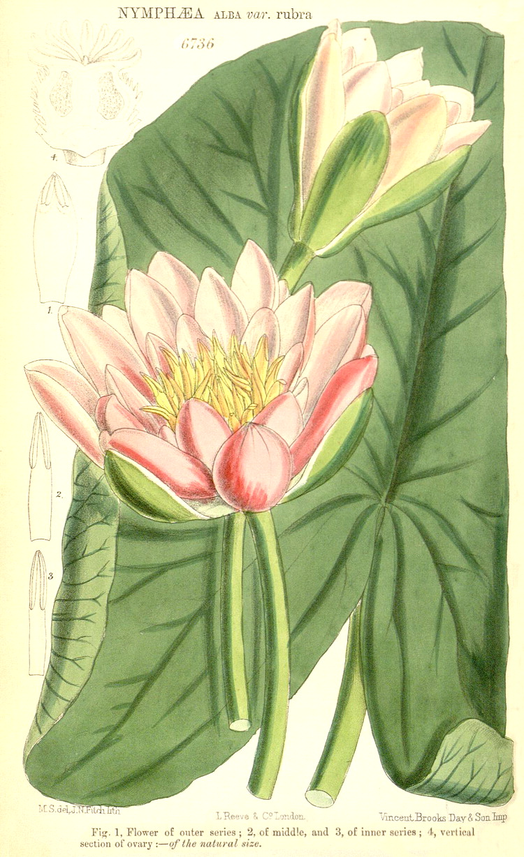 Illustrations. • Nymphaea: Lindley. • Le Maout and Decaisne: Nuphar, Nymphaea. • Nymphaea alba (B. Ent.). • Nymphaea alba: Eng. Bot. 53, 1863. • Nymphaea elegans: Bot. Mag. 77 (1851). • Nymphaea gigantea: Bot. Mag. 78 (1852). • Nymphaea lotus var. lotus (as N. dentata): Bot. Mag. 72 (1846). • Nymphaea mexicana (as N. flava): Bot. Mag. 113 (1887). • Nuphar lutea and N. pumila: Eng. Bot. 54 and 56, 1863. • Nymphaea alba subsp. alba (as var. rubra): Bot. Mag. 110 (1884). • Nymphaea ampla: Bot. Mag. 75 (1849). • Nymphaea micrantha: Bot. Mag. 76 (1850). • Nymphaea odorata subsp. minor: Bot. Mag. 109 (1883). • Nymphaea tuberosa and N. odorata: Bot. Mag. 107 (1881). • Nuphar lutea (B. Ent.). • Nuphar polysepala: Bot. Mag. 146 (1920). • Nymphaea pubescens (as N. devoniensis): Bot. Mag. 78 (1852). • Nymphaea marliacis: TS leaf showing spicular idioblasts, with anatomical details of Nelumbo (Nelumbonaceae) and Brasenia (Cabombaceae). Solereder, 1908. • Foliar clothing and mucilage hairs of Nuphar luteum and Nymphaea alba, with mucilage hairs of Cabomba and Brasenia (Cabombaceae). Solereder, 1908.