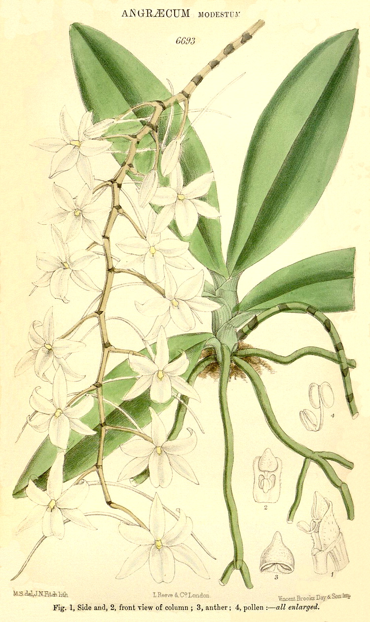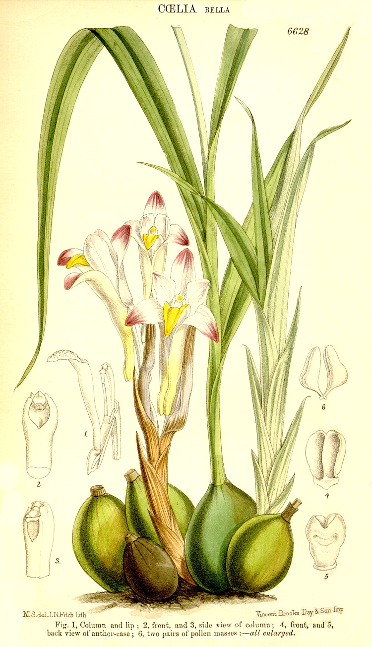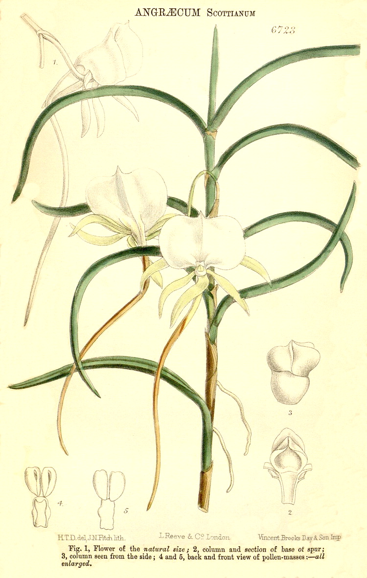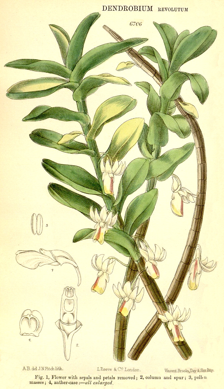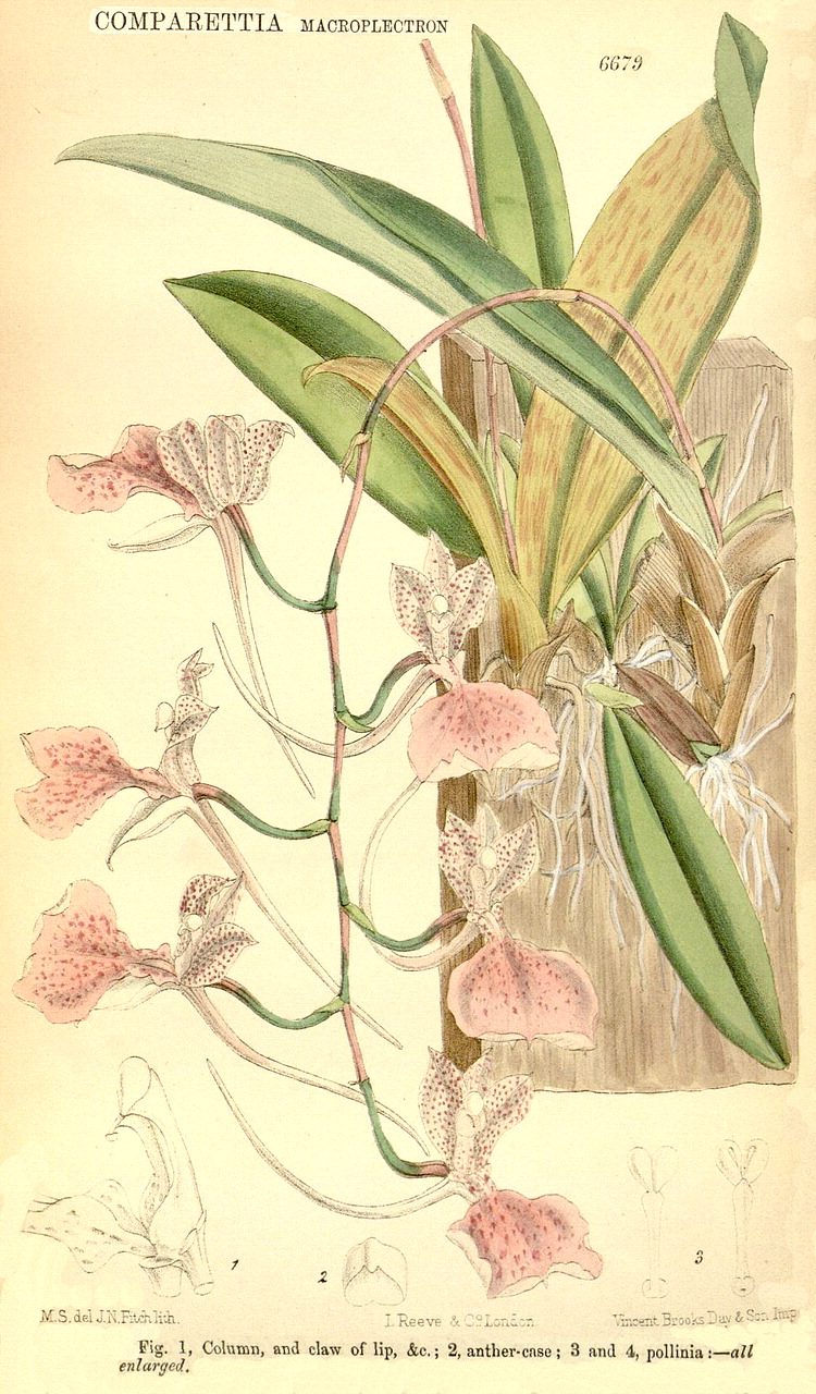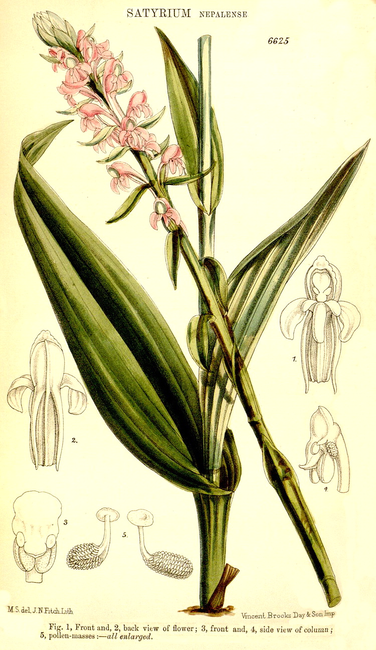 Illustrations. • Le Maout and Decaisne: Aceras, Epidendrum, Orchis. • Le Maout and Decaisne: Bulbophyllum, Lepanthes, Malaxis, Neottia, Oncidium, Phalaenopsis. • Le Maout and Decaisne: Angraecum, Epidendrum, Fernandezia, Phaius, Pleurothallis, Vanilla. • Le Maout and Decaisne: Chysis, Leptotes, Miltonia. • Dactylorhiza maculata, morphological details: Goebel. • Adenochilus gracilis and Caladenia minor: Hooker, Fl. Novae-Zelandiae (1853). • British: Orchis and Dactylorhiza (B. Ent. compilation). • British: Dactyorhiza incarnata (B. Ent.). • British: Cephalanthera damosonium (B. Ent.). • British: Corallorhiza trifida (B. Ent.). • British: Gymnadenia, Listera, Platanthera (B. Ent. compilation). • British: Listera cordata: B. Ent. 634. • British: Ophrys, Aceras, Spiranthes (B. Ent. compilation). • British: Coeloglossum, Neottia, Herminium, Epipactis, Anacamptis (B. Ent. compilation). • Australian: Caladenia spp. (photos). Caladenia flava (left) and C. reptans. Cranbrook, Western Australia, August 2005. Photos by Giles Watson. • Australian: Prasophyllum and Pterostylis (photos). Pterostylis recurva, Cranbrook, Western Australia; Prasophyllum cf. fimbria, Albany, Western Australia (note the adaxial labellum). Giles Watson, August 2005. • Australian: Diuris longifolia (photo). • Acanthephippium javanicum (as Acanthophippium): Bot. Mag. 76 (1850). • Acianthera bicarinata (as Pleurothallis): Bot. Mag. 71 (1845). • Acianthera prolifera (as Pleurothallis): Bot. Reg. 1298. • Aerangis citrata (as Angraecum): Bot. Mag. 93 (1867). • Aerangis modesta (as Angraecum): Bot. Mag. 109 (1883). • Aeranthes arachnites (as Acranthus arachnitis): Bot. Mag. 99 (1873). • Aerides cylindricum: Bot. Mag. 83 (1857). • Aerides emericii: Bot. Mag. 109 (1883). • Aerides mitrata (as A. mitratum): Bot. Mag. 94 (1868). • Aerides multiflora (as A. affine): Bot. Mag. 70 (1844). • Ancistrochilus thomsonianus (as Pachystoma): Bot. Mag. 106 (1880). • Ania viridifusca: Bot. Mag. 78 (1852). • Ansellia africana: Bot. Mag. 83 (1857). • Angraecum distichum: Bot. Mag. 71 (1845). • Angraecum scottianum: Bot. Mag. 109 (1883). • Angraecum sesquipedale: Bot. Mag. 85 (1859). • Anguloa uniflora: Bot. Mag. 80 (1854). • Anguloa hohenlowii x A. clowesii (as A. ruckeri): Bot. Mag. 89 (1863). • Anoectochilus regalis: as A. setaceus, Bot. Reg. 2010, 1837. • cf. Anoectochilus setaceus: Bot. Mag. 70 (1844). • Arachnis cathcartii (as Vanda): Bot. Mag. 96 (1870). • Arethusa bulbosa: Bot. Mag. 48 (1822). • Arpophyllum spicatum: Bot. Mag. 99 (1873). • Arundina graminifolia (as A. deusa): Bot. Reg. 37, 1842. Arundina graminifolia. 1, the lip excised and spread open. 2, the column. 3, the pollinia. • Arundina graminifolia, as A. bambusifolia: Bot. Mag. 119 (1893). • Aspasia epidendroides: Bot. Mag. 68 (1842). • Aspasia variegata: Bot. Reg. 1907 (1836). Aspasia variegata. 1, details of the column (centre) and of the pollinia (left). • Aspasia variegata: Bot. Mag. 65 (1838). • Barkeria lindleyana: Bot. Mag. 100 (1874). • Barkeria spectabilis: Bot. Mag. 70 (1844). • Barkeria uniflora (as B. elegans): Bot. Mag. 80 (1854). • Bartholina burmanniana (as B. pectinata): Bot. Reg. 1653, 1835. Bartholina burmanniana. a, whole plant; b, flower from in front; c, flower from behind; d, flower in half profile, the lip cut away (l = spur); e, front view of "petals" (1 = spur) and anther (2). • Brachystele bracteosa (as Spiranthes): Bot. Reg. 1934, 1837. Brachystele bracteosa. 1, entire flower. 2, detail with perianth removed, showing the back of the column and the lip. • Batemannia colleyi: Bot. Mag. 67 (1840). • Bletia purpurata (as Crybe rosea): Bot. Reg. 1872 (1836). • Bletia catenulata (as B. sherrattiana): Bot. Mag. 93 (1867). • Brachycorythis macrantha (as Eulophia helleborina): Bot. Mag. 966 (1870). • Brassavola acaulis (as B. lineata): Bot. Mag. 79 (1853). • Brassavola nodosa var. nodosa (as B. venosa): Bot. Mag. 69 (1843). • Brassia arcuigera (as B. lawrenciana var. longissima): Bot. Mag. 95 (1869). • Brassia aurantiaca (as Ada): Bot. Mag. 90 (1864). • Brassia maculata (as B. wrayae): Bot. Mag. 69 (1843). • Bromheadia finlaysoniana (as B. palustris): Bot. Reg. 1844, 18. Bromheadia finlaysoniana. 1, front view of the column. 2, adaxial view of the lip. 3, the gland and pollinia. • Bromheadia finlaysoniana (as B. palustris): Bot. Mag. 69 (1843). • Broughtonia sanguinea: Bot. Mag. 58 (1831). • Bulbophyllum barbigerum: as Bolbophyllum, Bot. Reg. 1942, 1837. • Bulbophyllum barbigerum (as Bolbophyllum): Bot. Mag. 87 (1861). • Bulbophyllum beccarii (as Bolbophyllum): Bot. Mag 107 (1881). • Bulbophyllum chinense (as Cirrhopetalum): Bot. Reg. 29 (49), 1843. • Bulbophyllum chinense (as Cirrhopetalum): Bot. Reg. 29 (49), 1843. • Bulbophyllum cirrhatum (as Ione paleacea): Bot. Mag. 104 (1878). • Bulbophyllum dayanum (as Bolbophyllum): Bot. Mag. 100 (1874). • Bulbophyllum drymoda (as Drymoda picta): Bot. Mag. 97 (1871). • Bulbophyllum fimbriatum (as Cirrhopetalum): Bot. Mag. 74 (1848). • Bulbophyllum grandiflorum: Bot. Mag. 127 (1901). • Bulbophyllum helenae (as Cirrhopetalum cornutum): Bot. Mag. 79 (1853). • Bulbophyllum lemniscatum (as Bolbophyllum): Bot. Mag. 98 (1872). • Bulbophyllum longiflorum (as Cirrhopetalum thouarsii): Bot. Mag. 72 (1846). • Bulbophyllum longiflorum (as Cirrhopetalum thouarsii): Bot. Mag. 118 (1892). • Bulbophyllum longiflorum (as Cirrhopetalum thouarsii): Bot. Reg. XXIV, 11 (1838). • Bulbophyllum macraei (as Cirrhopetalum): Bot. Mag. 75 (1849). • Bulbophyllum malachadenia (as Malachadenia clavata): Bot. Mag. 73 (1847). • Bulbophyllum maximum (as Megaclinium): Bot. Mag. 69 (1843). • Bulbophyllum maximum (as Megaclinium purpuratum): Bot. Mag. 97 (1871). • Bulbophyllum medusae (as Cirrhopetalum): Bot. Reg. 12, 1842. Bulbophyllum medusae. 1, column, petals and labellum. 2, the labellum sepa