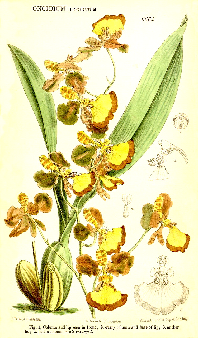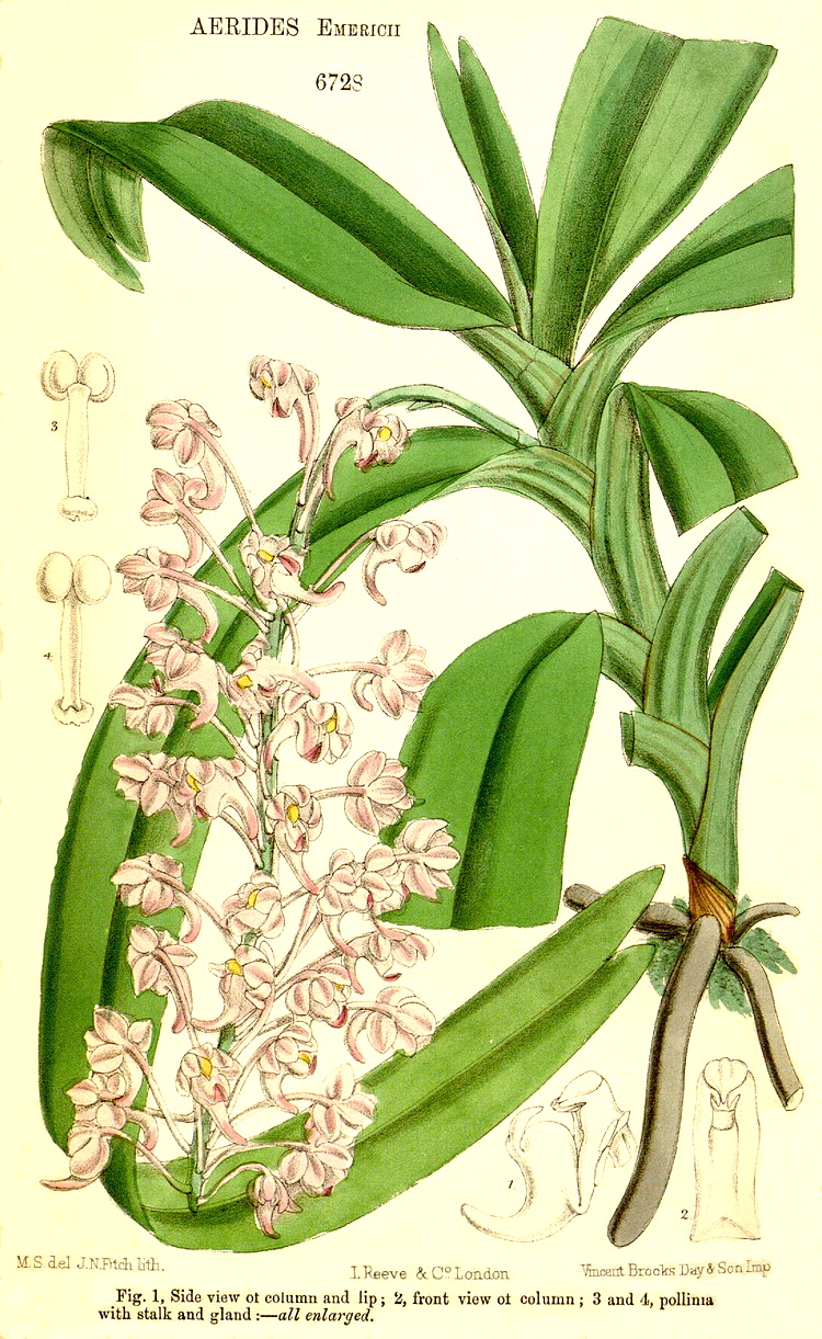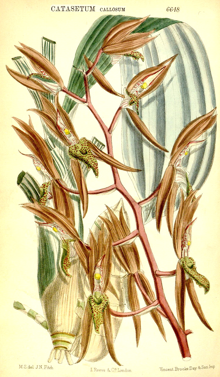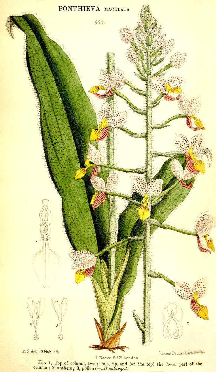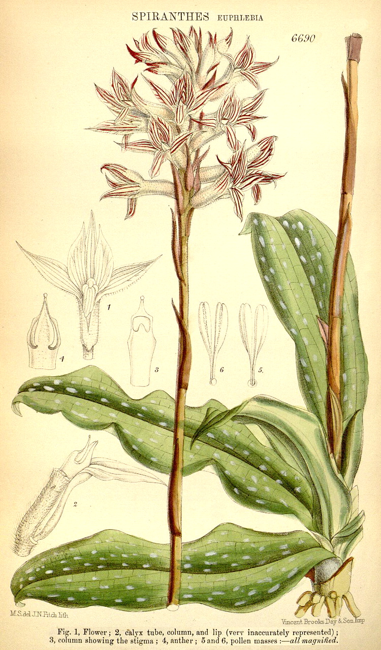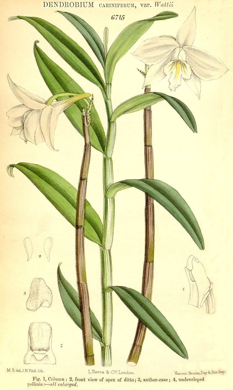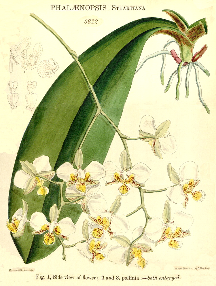 Illustrations. • Le Maout and Decaisne: Aceras, Epidendrum, Orchis. • Le Maout and Decaisne: Bulbophyllum, Lepanthes, Malaxis, Neottia, Oncidium, Phalaenopsis. • Le Maout and Decaisne: Angraecum, Epidendrum, Fernandezia, Phaius, Pleurothallis, Vanilla. • Le Maout and Decaisne: Chysis, Leptotes, Miltonia. • Dactylorhiza maculata, morphological details: Goebel. • Adenochilus gracilis and Caladenia minor: Hooker, Fl. Novae-Zelandiae (1853). • British: Orchis and Dactylorhiza (B. Ent. compilation). • British: Dactyorhiza incarnata (B. Ent.). • British: Cephalanthera damosonium (B. Ent.). • British: Corallorhiza trifida (B. Ent.). • British: Gymnadenia, Listera, Platanthera (B. Ent. compilation). • British: Listera cordata: B. Ent. 634. • British: Ophrys, Aceras, Spiranthes (B. Ent. compilation). • British: Coeloglossum, Neottia, Herminium, Epipactis, Anacamptis (B. Ent. compilation). • Australian: Caladenia spp. (photos). Caladenia flava (left) and C. reptans. Cranbrook, Western Australia, August 2005. Photos by Giles Watson. • Australian: Prasophyllum and Pterostylis (photos). Pterostylis recurva, Cranbrook, Western Australia; Prasophyllum cf. fimbria, Albany, Western Australia (note the adaxial labellum). Giles Watson, August 2005. • Australian: Diuris longifolia (photo). • Acanthephippium javanicum (as Acanthophippium): Bot. Mag. 76 (1850). • Acianthera bicarinata (as Pleurothallis): Bot. Mag. 71 (1845). • Acianthera prolifera (as Pleurothallis): Bot. Reg. 1298. • Aerangis citrata (as Angraecum): Bot. Mag. 93 (1867). • Aerangis modesta (as Angraecum): Bot. Mag. 109 (1883). • Aeranthes arachnites (as Acranthus arachnitis): Bot. Mag. 99 (1873). • Aerides cylindricum: Bot. Mag. 83 (1857). • Aerides emericii: Bot. Mag. 109 (1883). • Aerides mitrata (as A. mitratum): Bot. Mag. 94 (1868). • Aerides multiflora (as A. affine): Bot. Mag. 70 (1844). • Ancistrochilus thomsonianus (as Pachystoma): Bot. Mag. 106 (1880). • Ania viridifusca: Bot. Mag. 78 (1852). • Ansellia africana: Bot. Mag. 83 (1857). • Angraecum distichum: Bot. Mag. 71 (1845). • Angraecum scottianum: Bot. Mag. 109 (1883). • Angraecum sesquipedale: Bot. Mag. 85 (1859). • Anguloa uniflora: Bot. Mag. 80 (1854). • Anguloa hohenlowii x A. clowesii (as A. ruckeri): Bot. Mag. 89 (1863). • Anoectochilus regalis: as A. setaceus, Bot. Reg. 2010, 1837. • cf. Anoectochilus setaceus: Bot. Mag. 70 (1844). • Arachnis cathcartii (as Vanda): Bot. Mag. 96 (1870). • Arethusa bulbosa: Bot. Mag. 48 (1822). • Arpophyllum spicatum: Bot. Mag. 99 (1873). • Arundina graminifolia (as A. deusa): Bot. Reg. 37, 1842. Arundina graminifolia. 1, the lip excised and spread open. 2, the column. 3, the pollinia. • Arundina graminifolia, as A. bambusifolia: Bot. Mag. 119 (1893). • Aspasia epidendroides: Bot. Mag. 68 (1842). • Aspasia variegata: Bot. Reg. 1907 (1836). Aspasia variegata. 1, details of the column (centre) and of the pollinia (left). • Aspasia variegata: Bot. Mag. 65 (1838). • Barkeria lindleyana: Bot. Mag. 100 (1874). • Barkeria spectabilis: Bot. Mag. 70 (1844). • Barkeria uniflora (as B. elegans): Bot. Mag. 80 (1854). • Bartholina burmanniana (as B. pectinata): Bot. Reg. 1653, 1835. Bartholina burmanniana. a, whole plant; b, flower from in front; c, flower from behind; d, flower in half profile, the lip cut away (l = spur); e, front view of "petals" (1 = spur) and anther (2). • Brachystele bracteosa (as Spiranthes): Bot. Reg. 1934, 1837. Brachystele bracteosa. 1, entire flower. 2, detail with perianth removed, showing the back of the column and the lip. • Batemannia colleyi: Bot. Mag. 67 (1840). • Bletia purpurata (as Crybe rosea): Bot. Reg. 1872 (1836). • Bletia catenulata (as B. sherrattiana): Bot. Mag. 93 (1867). • Brachycorythis macrantha (as Eulophia helleborina): Bot. Mag. 966 (1870). • Brassavola acaulis (as B. lineata): Bot. Mag. 79 (1853). • Brassavola nodosa var. nodosa (as B. venosa): Bot. Mag. 69 (1843). • Brassia arcuigera (as B. lawrenciana var. longissima): Bot. Mag. 95 (1869). • Brassia aurantiaca (as Ada): Bot. Mag. 90 (1864). • Brassia maculata (as B. wrayae): Bot. Mag. 69 (1843). • Bromheadia finlaysoniana (as B. palustris): Bot. Reg. 1844, 18. Bromheadia finlaysoniana. 1, front view of the column. 2, adaxial view of the lip. 3, the gland and pollinia. • Bromheadia finlaysoniana (as B. palustris): Bot. Mag. 69 (1843). • Broughtonia sanguinea: Bot. Mag. 58 (1831). • Bulbophyllum barbigerum: as Bolbophyllum, Bot. Reg. 1942, 1837. • Bulbophyllum barbigerum (as Bolbophyllum): Bot. Mag. 87 (1861). • Bulbophyllum beccarii (as Bolbophyllum): Bot. Mag 107 (1881). • Bulbophyllum chinense (as Cirrhopetalum): Bot. Reg. 29 (49), 1843. • Bulbophyllum chinense (as Cirrhopetalum): Bot. Reg. 29 (49), 1843. • Bulbophyllum cirrhatum (as Ione paleacea): Bot. Mag. 104 (1878). • Bulbophyllum dayanum (as Bolbophyllum): Bot. Mag. 100 (1874). • Bulbophyllum drymoda (as Drymoda picta): Bot. Mag. 97 (1871). • Bulbophyllum fimbriatum (as Cirrhopetalum): Bot. Mag. 74 (1848). • Bulbophyllum grandiflorum: Bot. Mag. 127 (1901). • Bulbophyllum helenae (as Cirrhopetalum cornutum): Bot. Mag. 79 (1853). • Bulbophyllum lemniscatum (as Bolbophyllum): Bot. Mag. 98 (1872). • Bulbophyllum longiflorum (as Cirrhopetalum thouarsii): Bot. Mag. 72 (1846). • Bulbophyllum longiflorum (as Cirrhopetalum thouarsii): Bot. Mag. 118 (1892). • Bulbophyllum longiflorum (as Cirrhopetalum thouarsii): Bot. Reg. XXIV, 11 (1838). • Bulbophyllum macraei (as Cirrhopetalum): Bot. Mag. 75 (1849). • Bulbophyllum malachadenia (as Malachadenia clavata): Bot. Mag. 73 (1847). • Bulbophyllum maximum (as Megaclinium): Bot. Mag. 69 (1843). • Bulbophyllum maximum (as Megaclinium purpuratum): Bot. Mag. 97 (1871). • Bulbophyllum medusae (as Cirrhopetalum): Bot. Reg. 12, 1842. Bulbophyllum medusae. 1, column, petals and labellum. 2, the labellum sepa