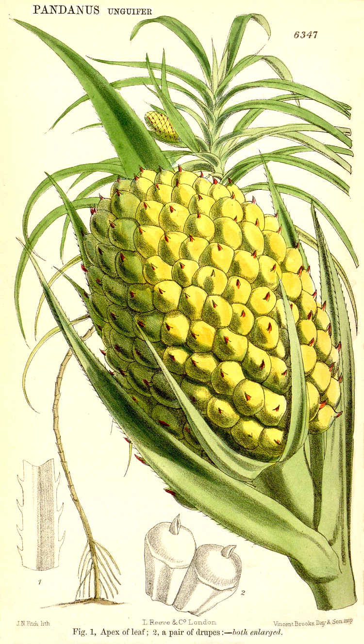 Illustrations. • Le Maout and Decaisne: Pandanus, Freycinetia. • Pandanus candelabrum: Thonner. • Pandanus candelabrum: Bot. Mag. 83 (1857). • Pandanus conoideus (as P. cominsii): Hook. Ic. Pl. 27 (1900). • Pandanus furcatus: Bot. Mag. 142 (1916). • Pandanus houlletii, male: Bot. Mag. 134 (1908). • Pandanus labyrinthicus: Bot. Mag. 115 (1889). • Pandanus pygmaeus: Bot. Mag. 79 (1853). • Pandanus unguifer: Bot. Mag. 104 (1878). • Freycinetia banksii: Hooker, Fl. Novae-Zelandiae (1853). • Freycinetia banksii: Bot. Mag. 99 (1873). • Sararanga sinuosa: Hook. Ic. Pl. 26 (1899).
