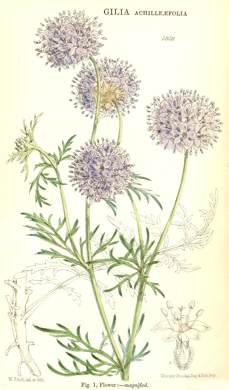 Illustrations. • Le Maout and Decaisne: Polemonium. • Cantua bicolor: Bot. Mag. 79 (1853). • Cantua buxifolia: Bot. Mag. 77 (1851). • Cantua pyrifolia: Bot. Mag. 74 (1848). • Collomia biflora (as C. cavanellesii): Bot. Mag. 63 (1836). • Eriastrum densifolium (as Leptosiphon densiflorus): Bot. Mag. 64 (1837). • Gilia achilleifolia: as G. achilleaefolia, Bot. Reg. 1682, 1835. • Gilia achilleifolia: Bot. Mag. 62 (1835). • Gilia achilleifolia: Bot. Mag. 97 (1871). • Gilia androsacea: as Leptosiphon androsaceus, Bot. Reg. 1710, 1835. • Gilia brandegeei: Bot. Mag. 104 (1878). • Gilia tricolor: Bot. Mag. 63 (1836). • Ipomopsis congesta (as Gilia): Icones Plantarum 3 (1840). • Leptosiphon androsaceus: Bot. Mag. 63 (1836). • Leptosiphon liniflorus (as Gilia liniflora): Bot. Mag. 97 (1871). • Leptosiphon parviflorus (as Gilia lutea): Bot. Mag. 79 (1853). • Leptosiphon rosaceus (as L. parviflorus var. rosaceus): Bot. Mag. 96 (1870). • Linanthus californicus (as Leptodactylon): Bot. Mag. 81 (1855). • Linanthus californicus (as Gilia): Das Pflanzenreich IV, 250 (1907). • Linanthus dianthiflorus (as Gilia dianthoides): Bot. Mag. 81 (1855). • Loeselia cordifolia: Hook. Ic. Pl. 26 (1898). • Navarretia californica (as Leptodactylon): Bot. Mag. 81 (1955). • Navarretia pungens (as Gilia): Bot. Mag. 57 (1830). • Phlox drummondii: Bot. Reg. 1949, 1837. Phlox drummondii. 1, corolla, opened to show insertion of the stamens. 2, transverse section of ovary, seated in the nectariferous disk. 3, flower with petals removed and calyx opened, showing the disk and gynoecium. 4, detail of a calyx hair. • Phlox drummondii: Bot. Mag. 62 (1835). • Polemonium caeruleum: Eng. Bot. 922 (1866). • Polemonium caeruleum var. piliferum: Bot. Reg. 1303, 1829. • Polemonium flavum: Bot. Mag. 113 (1887). • Polemonium lanatum, var.: Bot. Reg. 1304, 1829. • Polemonium pulcherrimum: Bot. Mag. 57 (1830).