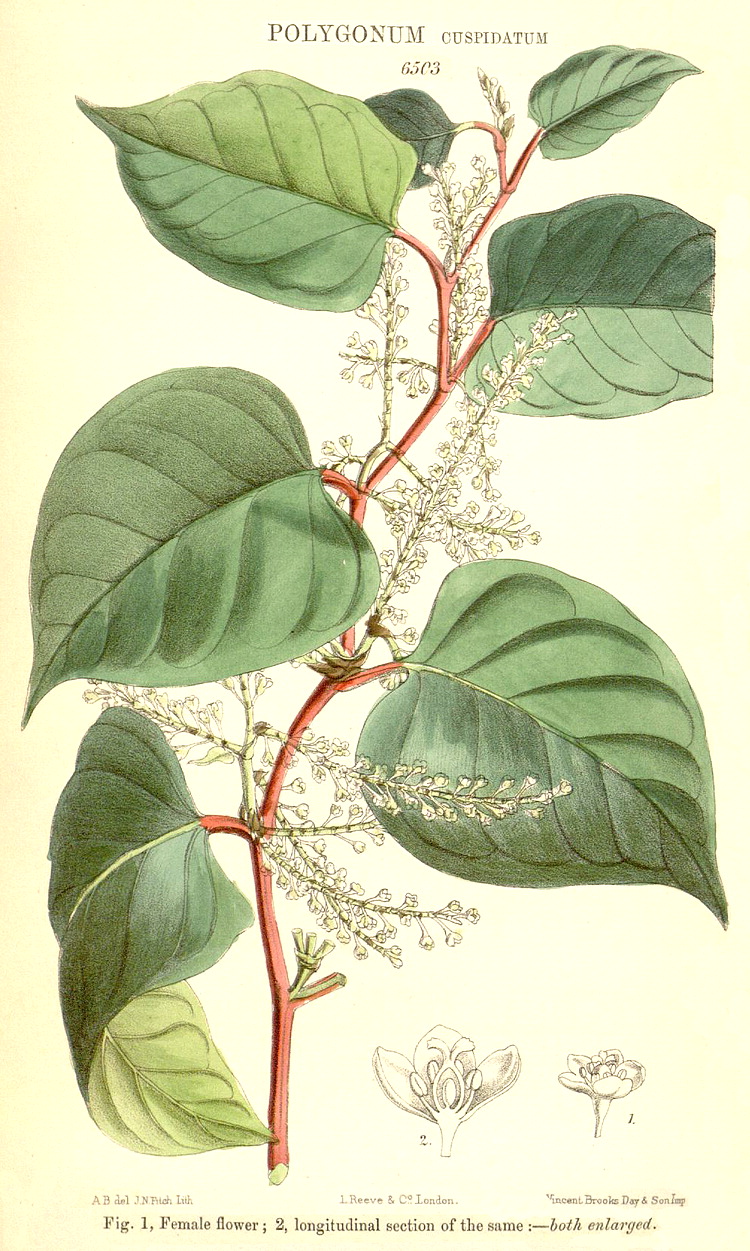 Illustrations. • Le Maout and Decaisne: Rumex, Rheum. • Le Maout and Decaisne: Eriogonum, Fagopyrum, Koenigera, Muhlenbeckia. • Afrobrunnichia africana (as Brunnichia): Hook. Ic. Pl. 14 (1881). • Antigonon leptopus: Bot. Mag. 96 (1870). • Atraphaxis billardieri: Bot. Mag. 145 (1919). • Atraphaxis muschketowii: Bot. Mag. 121 (1895). • Atraphaxis spinosa and Calligonum caput-medusae: Nat. Pflanzzenfam. 3 (1887). • Coccoloba cf. coronata: as C. virens, Bot. Reg. 1816, 1836. • Coccoloba platyclada:: Bot. Mag. 89 (1863). • Coccoloba rugosa (as C. macrophylla): Bot. Mag. 76 (1850). • Eriogonum compositum: Bot. Reg. 1774, 1836. Eriogonum compositum. 1, a complete flower. 2, showing how the stamens are inserted in threes on the inner perianth segments. 3, ovary with its three recurved styles. 4, a fruit, enveloped in the persistent perianth. 5, a ripe fruit. 6, a seed. 7, transverse section of a seed, showing embryo surronded by albumen. • Eriogonum compositum: Bot. Mag. 79 (1853). • Eriogonum multiflorum: Hook. Ic. Pl. 3 (1840). • Fagopyrum esculentum (as Polygonum fagopyrum): Eng. Bot. 1226, 1868. • Fallopia baldschuanica (as Polygonum): Bot. Mag. 123 (1897). • Fallopia dumetorum (as Polygonum dumetorum): Eng. Bot. 1228, 1868. • Gymnopodium floribundum: Hook. Ic. Pl. 27 (1900). • Leptogonum domingense: Hook. Ic. Pl. 14 (1880–82). • Muehlenbeckia complexa: Bot. Mag. 138 (1912). • Oxygonum alatum: Hook. Ic. Pl. 14 (1880). • Oxygonum pachybasis: Hook. Ic. Pl. 33 (1935). • Oxygonum sinuatum: Thonner. • Oxygonum tenerum: Hook. Ic. Pl. 33 (1935). • Oxyria digyna, as O. elatior: Hook. Ic. Pl. 5–6 (1842–3). • Oxyria digyna (as O. reniformis): Eng. Bot. 1225, 1868. • Persicaria hydropiper, P. mite and P. maculosa (all as Polygonum): Eng. Bot. 1234, 1236 and 1237 (1868). • Persicaria amplexicaulis (as Polygonum): Bot. Mag. 106 (1880). • Persicaria amplexicaulis (as Polygonum): Bot. Reg. 1839, 46. • Persicaria lapathifolia, P. bistorta, P. vivipara (all as Polygonum): Eng. Bot. 1239, 1243, 1244 (1868). • Persicaria amphibia (as Polygonum, terrestrial and aquatic forms): Eng. Bot. 1241 and 1242, 1868. • Polygonum affine: Bot. Mag. 106 (1880). • Polygonum chinense (foliis pictis): Bot. Mag. 87 (1861). • Polygonum tibeticum: Hook. Ic. Pl. 25 (1896). • P. rurivagum and Polygonum aviculare: Eng. Bot. 1229 and 1231, 1868. • Polygonum icaricum: Hook. Ic. Pl. 33 (1935). • Polygonum injucundum: Bot. Reg. 1250, 1829. • Polygonum macrophyllum (as P. sphaerostachyum): Bot. Mag. 111 (1885). • Polygonum maritimum: Eng. Bot. 1233, 1868. • Polygonum vacciniifolium: Bot. Mag. 77 (1851). • Polygonum spp. (B. Ent. compilation). • Reynoutria japonica (as R. compactum): Bot. Mag. 106 (1880). • Reynoutria japonica (as Polygonum cuspidatum): Bot. Mag. 106 (1880). • Reynoutria sachalinensis (as Polygonum): Bot. Mag. 107 (1881). • Rheum acuminatum: Bot. Mag. 81 (1855). • Rheum emodi: Bot. Mag. 63 (1836). • Rheum nobile: Hooker’s Illustrations of Himalayan plants (1855). • Rheum officinale: Bot. Mag. 100 (1874). • Rheum ribes: Bot. Mag. 124 (1898). • Rumex acetosa and Rumex acetosella: Eng. Bot. 1223 and 1224, 1868. • Rumex conglomeratus, R. maritimus and R. sanguineus: Eng. Bot. 1210–1212, 1868. • Rumex crispus and Rumex hydrolappathum: Eng. Bot. 1218 and 1220, 1868. • Rumex hymenosepalus: Bot. Mag. 121 (1895). • Rumex sanguinus and Rumex maritimus: Eng. Bot. 1211 and 1212, 1868. • Rumex pulcher, R. obtusifolius and R. aff. conglomeratus (as R. pratensis): Eng. Bot. 1214–1216, 1868. • Rumex obtusifolius and R. aff. conglomeratus (as R. pratensis): Eng. Bot. 1214–1216, 1868. • Rumex spp. and Fagopyrum: B. Ent. compilation. • Rumex crispus: TS stem, with medullary vascular bundles (Solereder). • Symmeria paniculata: Flora Brasiliensis 5 (1835). • Calligonum comosum: TS stem, with cortical vascular bundles (Solereder, 1908).