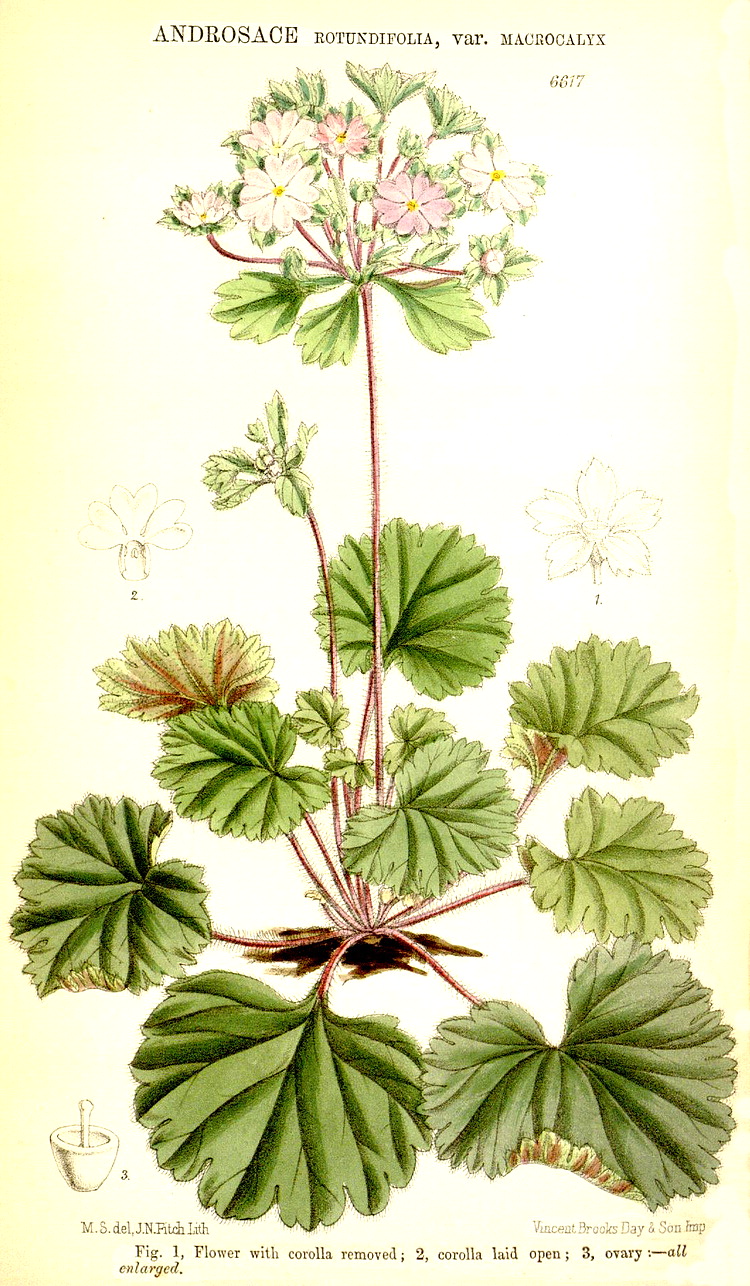 Illustrations. • Le Maout and Decaisne: Cyclamen, Primula. • Le Maout and Decaisne: Anagallis, Samolus. • Ardisiandra sibthorpioides: Thonner. • Anagallis arvensis (2 forms) and Anagallis minumus (as Centunculus): Eng. Bot. 1146, 1147 and 1149, 1867. • Anagallis tenella: Eng. Bot. 1148, 1867. • Androsace bulleyana (as A. coccinea): Bot. Mag. 142 (1916). • Androsace carnea var. eximia: Bot. Mag. 97 (1871). • Androsace foliosa: Bot. Mag. 108 (1882). • Androsace henryi: Hook. Ic. Pl. 20 (1891). • Androsace nivalis, as Douglasia: Bot. Reg. 1886 (1836). • Androsace laevigata (as Douglasia): Bot. Mag. 114 (1888). • Androsace lanuginosa: Bot. Mag. 69 (1843). • Androsace nivalis, as Douglasia: Hook. Ic. Pl. 2 (1837). • Androsace pubescens: Bot. Mag. 95 (1869). • Androsace rotundifolia (as var. macrocalyx): Bot. Mag. 108 (1882). • Androsace sarmentosa: Bot. Mag. 102 (1876). • Carolinella cordifolia: Hook. Ic. Pl. 28 (1903). • Cyclamen africanum: Bot. Mag. 95 (1869). • Cyclamen hederifolium: Eng. Bot. 1136 and 1138, 1867. • Cyclamen neapolitanum: Bot. Reg. XXIV, 49 (1838). • Cyclamen persicum: Bot. Mag. 2 (1788). • Evotrochis simensis (as Primula verticillata var. simensis): Bot. Mag. 99 (1873). • Glaux maritima: Eng. Bot. 1150, 1867. • Hottonia palustris: Eng. Bot. 1128, 1867. • Lysimachia crispidens: Bot. Mag. 129 (1903). • Lysimachia hemsleyana: Hook. Ic. Pl. 20 (1891). • Lysimachia nutans: Bot. Mag. 82 (1856). • Lysimachia rubiginosa: Hook. Ic. Pl. 20 (1891). • Lysimachia thyrsiflora, L. vulgaris, L. ciliata, L. nummularia and L. nemorum: Eng. Bot. 1140–1145, 1867. • Primula chionantha: Bot. Mag. 145 (1919). • Primula denticulata: Bot. Reg. 47, 1842. • Primula denticulata: Bot. Mag. 68 (1842). • Primula duclauxii: Hook. Ic. Pl. 32 (1930). • Primula filipes (as P. forbesii): Bot. Mag. 118 (1892). • Primula frigida (as Dodecatheon meadia var. frigidum): Bot. Mag. 96 (1870). • Primula japonica: Bot. Mag. 97 (1871). • Primula mistassinica: Bot. Mag. 57 (1830). • Primula meadia (as Dodecatheon integrifolium): Bot. Mag. 64 (1837). • Primula mollis: Bot. Mag. 80 (1854). • Primula nutans (as P. sibirica var. kashmiriana): Bot. Mag. 106 (1880). • Primula obconica subsp. obconica (as P. poculiformis): Bot. Mag. 107 (1881). • Primula parryi: Bot. Mag. 101 (1875). • Primula pedemontana: Bot. Mag. 95 (1869). • Primula poissoni: Bot. Mag. 118 (1892). • Primula prolifera (as P. imperialis): Bot. Mag. 118 (1892). • Primula rosea: Bot. Mag. 105 (1879). • Primula sieboldii (as P. cortusoides var. amoena): Bot. Mag. 91 (1865). • Primula sikkimensis: Bot. Mag. 77 (1851). • Primula stuartii: Bot. Mag. 74 (1848). • Primula tangutica: Bot. Mag. 131 (1905). • Primula vulgaris (Primrose), P. elatior (Oxlip) and P. veris (Cowslip, as P. officinalis): Eng. Bot. 1129–1130, 1867. • Primula veris x P. vulgaris (Common Oxlip) and P. veris x P. elatior: Eng. Bot. 1132 and 1133, 1867. • Primula farinosa and P. scotica: Eng. Bot. 1134 and 1135, 1867. • Primula x venusta: as P. venusta, Bot. Reg. 1983, 1837. • British Primula (B. Ent. compilation). • Samolus repens: flowers (photo). • Samolus repens: habitat (photo). • Samolus valerandi: Eng. Bot. 1151, 1867. • Soldanella alpina: Bot. Mag. 2 (1788). • Lysimachia, Glaux (B. Ent. compilation). • Hottonia, Anagallis, Trientalis, Samolus: B. Ent. compilation). • Leaf hairs of Androsace (3 spp.), Cyclamen and Lysimachia: Solereder, 1908.