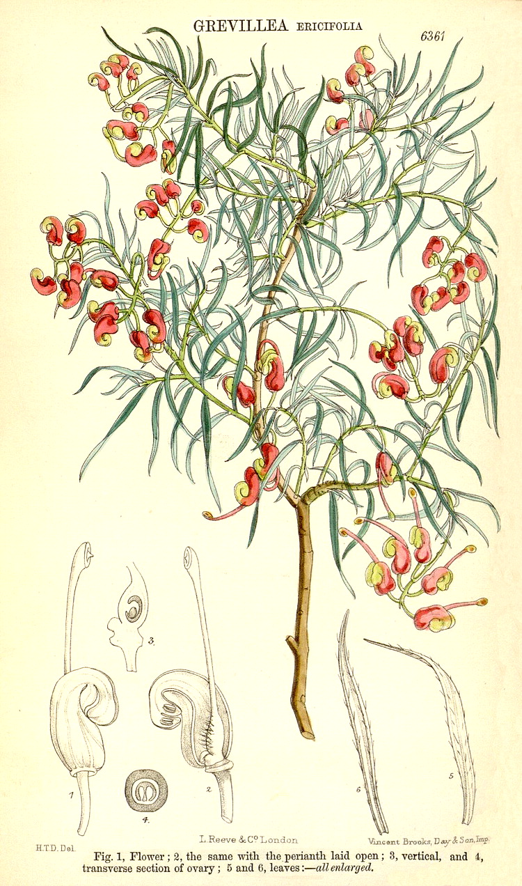 Illustrations. • Le Maout and Decaisne: Banksia. • Bellendena montana, Persoonia spp., Symphionema montanum: Engler, Nat. Pflanzenfam. 3 (1887). • Le Maout and Decaisne: Grevillea, Stenocarpus. • Banksia aemula: Bot. Reg. 688, 1822. • Banksia coccinea: F. Bauer (1813). • Banksia coccinea: inflorescences (photo). • Banksia coccinea: habitat (photo). • Banksia grandis: inflorescences (photo). • Banksia grandis: young fruiting inflorescence (photo). • Banksia littoralis: Bot Mag. 58 (1831). • Banksia marginata: Bot. Reg. 787, 1824. • Banksia media: Bot. Mag. 58 (1831). • Banksia occidentalis: Bot. Mag. 63 (1836). • Banksia paludosa: Bot. Reg. 697, 1823. • Banksia quercifolia: Bot. Reg. 1430, 1831. • Banksia speciosa: Bot. Mag. 58 (1831). • Banksia speciosa (immature inflorescence): Bot. Reg. 1728, 1835. • Banksia victoriae: Bot. Mag. 82 (1856). • Banksia alliacea (series Dryandra, as Dryandra nervosa): Bot. Mag. 58 (1831). • Banksia arctotidis (series Dryandra): Bot. Mag. 4035 (1843). • Banksia armata (series Dryandra): Bot. Mag. 60 (1833). • Banksia tenuis (as Dryandra tenuifolia): Bot. Mag. 63 (1836). • Banksia calophylla (series Dryandra): Bot. Mag. 125 (1899). • Banksia falcata (series Dryandra): as Hemiclidia baxteri, Bot. Reg. 1455 (1831). • Banksia formosa (series Dryandra): Bot. Mag. 70 (1844). • Banksia formosa (series Dryandra): inflorescence (photo). • Banksia formosa (series Dryandra): habitat (photo). • Banksia nobilis (series Dryandra): Bot. Mag. 78 (1852). • Banksia pteridifolia (series Dryandra): Bot. Mag. 63 (1836). • Banksia squarrosa (series Dryandra, as Dryandra carduacea var. angustifolia): Bot. Mag. 73 (1847). • Cardwellia sublimis: Hook. Ic. Pl. 13 (1877–79). • Conospermum ericifolium: Bot. Mag. 55 (1828). • Embothrium coccineum: Bot. Mag. 81 (1855). • Grevillea alpina (as G. alpestris): Bot. Mag. 83 (1857). • Grevillea annulifera: Bot. Mag. 109 (1883). • Grevillea aspleniifolia: Bot. Mag. 115 (1889). • Grevillea banksii: F. Bauer (1813). • Grevillea banksii: Bot. Mag. 96 (1870). • Grevillea bipinnatifida: Bot. Mag. 139 (1913). • Grevillea buxifolia: Bot. Reg. 443, 1820. • Grevillea concinna: Bot. Reg. 1383, 1830. • Grevillea fasciculata: Bot. Mag. 100 (1874). • Grevillea hilliana: Bot. Mag. 123 (1897). • Grevillea hookeriana: Bot. Mag. 112 (1886). • Grevillea intricata: Bot. Mag. 97 (1871). • Grevillea lanigera (as G. ericifolia): Bot. Mag. 104 (1878). • Grevillea manglesii, as Anadenia: Hook. Ic. Pl. 4 (1841). • Grevillea manglesii subsp. ornithopoda: Bot. Mag. 126 (1900). • Grevillea preissei: Bot. Mag. 96 (1870). • Grevillea pulchella: Bot. Mag. 98 (1872). • Grevillea punicea: Bot. Mag. 109 (1883). • Grevillea punicea: Bot. Reg. 1319, 1830. • Grevillea rosmarinifolia: Bot. Mag. 98 (1872). • Grevillea speciosa (as G. dubia): Bot. Mag. 67 (1840). • Grevillea tripartita subsp. macrostylis (as G. macrostylis): Bot. Mag. 97 (1871). • Hakea cucullata: Bot. Mag. 76 (1850). • Hakea dactyloides: Bot. Mag. 66 (1840). • Hakea ferruginea: Bot Mag. 62 (1835). • Hakea microcarpa: Bot. Reg. 475, 1820. • Hakea myrtoides: Bot. Mag. 78 (1852). • Hakea scoparia: Bot. Mag. 78 (1852). • Helicia grandis: Hook. Ic. Pl. 27 (1900). • Helicia ceylonica: Trimen, Fl. Hndbk. of Ceylon (1893). • Isopogon attenuatus: Bot. Mag. 74 (1848). • Isopogon baxteri: Bot. Mag. 63 (1836). • Isopogon buxifolius var. linearis (as I. spathulatus var. linearis: Bot. Mag. 62 (1835). • Isopogon cuneatus (as I. loudoni): Bot. Mag. 62 (1835). • Isopogon formosus: Bot. Reg. 1288, 1829. • Isopogon longifolius: Bot. Reg. 900, 1825. • Isopogon scaber: Bot. Mag. 69 (1843). • Isopogon sphaerocephalus: Bot. Mag. 73 (1847). • Turrillia vitiensis (as Kermadecia): Hook. Ic. Pl. 31 (1915). • Lambertia inermis (photo). • Lambertia inermis var. drummondii (photo). • Lambertia formosa: Bot. Reg. 528, 1821. • Leucospermum conoclongifolia, = L. arpum: Thonner. • Lomatia ferruginea: Bot. Mag. 133 (1907). • Lomatia ilicifolia: Bot. Mag. 69 (1843). • Lomatia longifolia: Bot. Mag. 126 (1900). • Lomatia longifolia: Bot. Reg. 442, 1820. • Lomatia tinctoria: Bot. Mag. 70 (1844). • Orothamnus zeyheri: Bot. Mag. 74 (1848). • Petrophile acicularis: Bot. Mag. 63 (1836). • Protea caffra (as P. rhodantha): Bot. Mag. 119 (1893). • Protea longifolia:Bot. Mag. 145 (1919). • Protea mundii (as P. penicillata): Bot. Mag. 107 (1881). • Protea nana: Bot. Mag. 116 (1890). • Protea repens (as P. mellifera: Bot. Mag 9 (1796). • Roupala montana var. paraensis (as Rhopala pohlii): Bot. Mag. 100 (1874). • Serruria florida: Hook. Ic. Pl. 31 (1915). • Spatalla squamata: Hook. Ic. Pl 31 (1915). • Stenocarpus cunninghamii: Bot. Mag. 72 (1846). • Stenocarpus salignus: Bot. Reg. 441, 1820. • Telopea oreades: Bot. Mag. 142 (1916). • TS leaves of Franklandia, Hakea and Isopogon, and foliar hairs of Grevillea and Lambertia: Solereder, 1908.