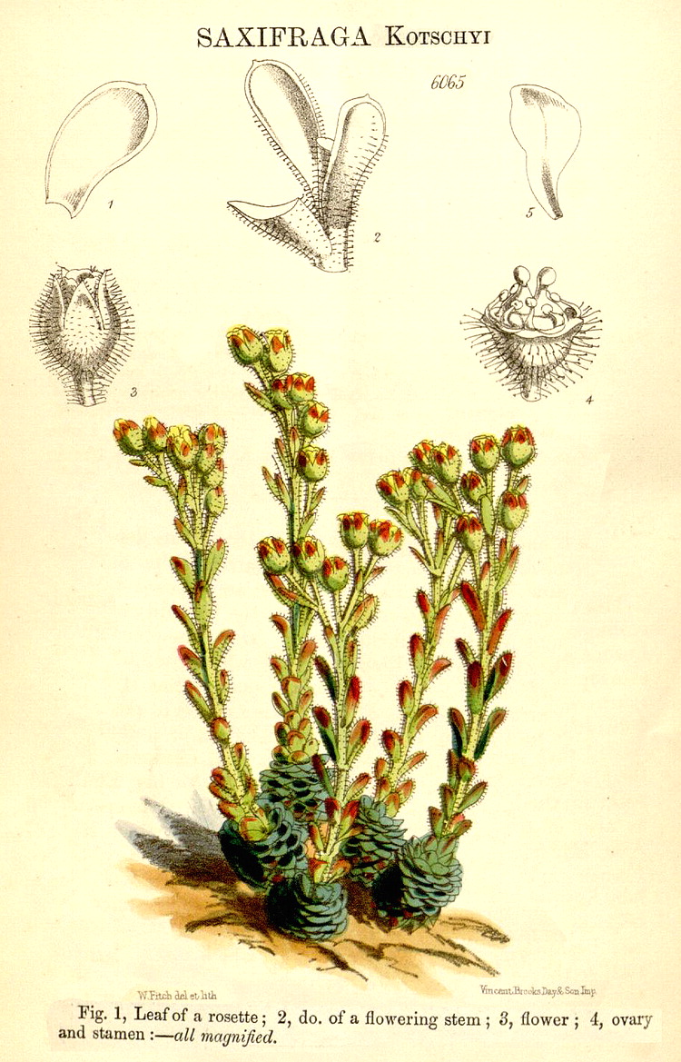 Illustrations. • Le Maout and Decaisne: Saxifraga. • Astilbe japonica (as Hoteia barbata): Bot. Mag. 67 (1840). • Astilbe rivularis: as Spiraea barbata, Bot. Reg. 2011, 1837. • Astilbe rubra: Bot. Mag. 83 (1857). • Astilbe rubra (as A. davidii): Bot. Mag. 129 (1903). • Bergenia ciliata: Bot. Reg. 29 (65), 1843. • Bergenia ciliata (as Saxifraga): Bot. Mag. 82 (1856). • Bergenia pacumbis (as Saxifraga ligulata): Bot. Mag. 62 (1835). • Bergenia purpurascens (as Saxifraga): Bot. Mag. 84 (1858). • Bergenia stracheyi (as Saxifraga): Bot. Mag. 98 (1872). • Darmera peltata (as Saxifraga): Bot. Mag. 100 (1874). • Heuchera cylindrica: as H. cylindracea, Bot. Reg. 1924, 1837. • Heuchera sanguinea: Bot. Mag. 113 (1887). • Quintinia serrata: Hook. Ic. Pl. 5–6 (1842). • Quintinia serrata, with Itea ilicifolia, I. macrophylla and Cyrilla racemiflora (as Itea virginica): Nat. Pflanzenfam. III. • Rodgersia podophylla: Bot. Mag. 109 (1883). • Saxifraga aretioides: Bot. Mag. 96 (1870). • Saxifraga camposii: Bot. Mag. 108 (1882). • Saxifraga species (B. Ent. compilation). • Saxifraga species, Chrysosplenium (B. Ent. compilation). • Saxifraga fortunei: Mag. 89 (1863). • Saxifraga granulata: Eng. Bot. 555 (1865). • Saxifraga hirsuta: as S. geum, Eng. Bot. 455 (1865). • Saxifraga kotschyi: Bot. Mag. 99 (1873). • Saxifraga latepetiolata: Bot. Mag. 115 (1889). • Saxiftaga leucanthemifolia: Bot. Mag. 57 (1830). • Saxifraga longifolia: Bot. Mag. 97 (1871). • Saxifraga media: Bot. Mag. 119 (1893). • Saxifraga serotina (as S. cortusifolia): Bot. Mag. 109 (1883). • Saxifraga stellaris: Eng. Bot. 542 (1865). • Saxifraga umbrosa: Eng. Bot. 547 (1865). • Tanakaea radicans: Bot. Mag. 130 1904). • Tiarella polyphylla: Hook. Ic. Pl. 16 (1887).