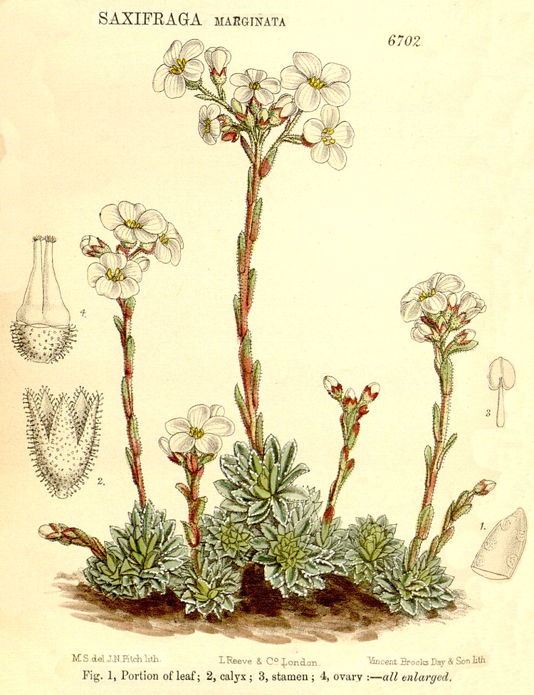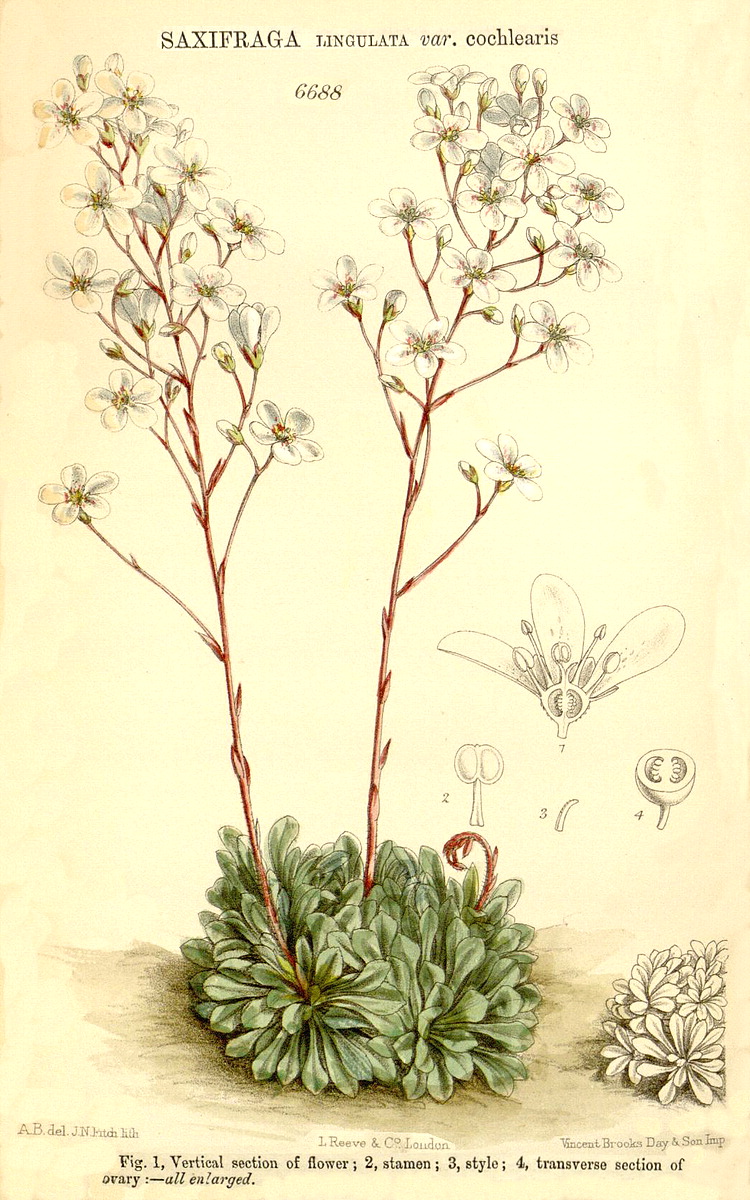 Illustrations. • Le Maout and Decaisne: Saxifraga. • Astilbe japonica (as Hoteia barbata): Bot. Mag. 67 (1840). • Astilbe rivularis: as Spiraea barbata, Bot. Reg. 2011, 1837. • Astilbe rubra: Bot. Mag. 83 (1857). • Astilbe rubra (as A. davidii): Bot. Mag. 129 (1903). • Bergenia ciliata: Bot. Reg. 29 (65), 1843. • Bergenia ciliata (as Saxifraga): Bot. Mag. 82 (1856). • Bergenia pacumbis (as Saxifraga ligulata): Bot. Mag. 62 (1835). • Bergenia purpurascens (as Saxifraga): Bot. Mag. 84 (1858). • Bergenia stracheyi (as Saxifraga): Bot. Mag. 98 (1872). • Darmera peltata (as Saxifraga): Bot. Mag. 100 (1874). • Heuchera cylindrica: as H. cylindracea, Bot. Reg. 1924, 1837. • Heuchera sanguinea: Bot. Mag. 113 (1887). • Quintinia serrata: Hook. Ic. Pl. 5–6 (1842). • Quintinia serrata, with Itea ilicifolia, I. macrophylla and Cyrilla racemiflora (as Itea virginica): Nat. Pflanzenfam. III. • Rodgersia podophylla: Bot. Mag. 109 (1883). • Saxifraga aretioides: Bot. Mag. 96 (1870). • Saxifraga camposii: Bot. Mag. 108 (1882). • Saxifraga cochlearis (as S. lingulata var. cochlearis): Bot. Mag. 109 (1883). • Saxifraga diversifolia: Bot. Mag. 108 (1882). • Saxifraga species (B. Ent. compilation). • Saxifraga species, Chrysosplenium (B. Ent. compilation). • Saxifraga florentula: Bot. Mag. 100 (1874). • Saxifraga fortunei: Mag. 89 (1863). • Saxifraga granulata: Eng. Bot. 555 (1865). • Saxifraga hirsuta: as S. geum, Eng. Bot. 455 (1865). • Saxifraga kotschyi: Bot. Mag. 99 (1873). • Saxifraga latepetiolata: Bot. Mag. 115 (1889). • Saxiftaga leucanthemifolia: Bot. Mag. 57 (1830). • Saxifraga longifolia: Bot. Mag. 97 (1871). • Saxifraga marginata: Bot. Mag. 109 (1883). • Saxifraga maweana: Bot. Mag. 104 (1878). • Saxifraga media: Bot. Mag. 119 (1893). • Saxifraga serotina (as S. cortusifolia): Bot. Mag. 109 (1883). • Saxifraga stellaris: Eng. Bot. 542 (1865). • Saxifraga umbrosa: Eng. Bot. 547 (1865). • Tanakaea radicans: Bot. Mag. 130 1904). • Tiarella polyphylla: Hook. Ic. Pl. 16 (1887).