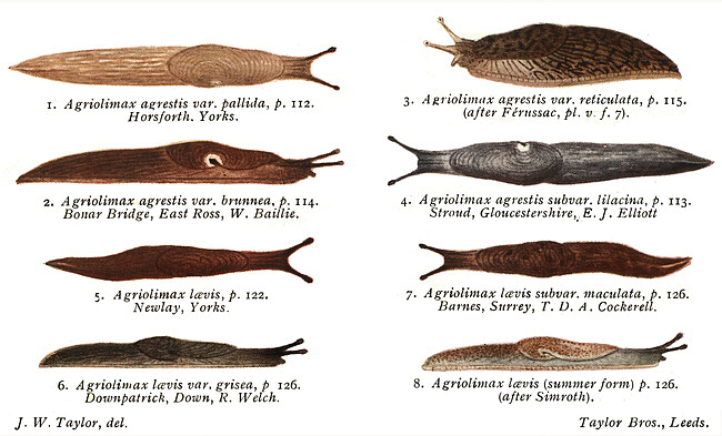Illustrations. • Deroceras laeve and Deroceras reticulatum: assorted varieties (Taylor). AGRIOLIMACIDAE. 1–4, Deroceras reticulatum (Müller), "Field or Milky Slug", animals 35–50 mm long when extended. 5–8, Deroceras laeve (Müller), "Marsh Slug", 15–25 mm. From Taylor (1906). • Deroceras reticulatum and D. laeve, with Limacidae (Ellis). AGRIOLIMACIDAE: 6, Deroceras reticulatum (Muller), 35–50 mm.; 7, Deroceras laeve (Müller), "Marsh Slug", 15–25 mm. LIMACIDAE. 1, Limax maximus; 2, Limax cinereoniger Wolf, "Ash-black Slug", 100–200 mm.; 3, Limax flavus L., "Yellow Slug", 80–130 mm.; 4, Lehmannia marginata (Müller), "Tree Slug", 70–80 mm.; 5, Malacolimax tenellus (Müller), "Slender Slug" or "Tender Slug", 35–50 mm. From Ellis (1926). • Deroceras reticulatum and Deroceras laeve, with Arionidae, Limacidae and Milacidae (Adams). ARIONIDAE. 1, Arion ater (Linn.), "Large Black Slug"; 2, Arion intermedius Normand, "Hedgehog Slug"; 3, Arion hortensis agg., "Garden Slug"; 5, Geomalacus maculosus Allman, "Kerry Slug". LIMACIDAE. 6, Limax maximus Linn., "Great Grey Slug"; 7, Limax flavus Linn., "Yellow Slug"; 8, Lehmannia marginata (Müller), "Tree Slug". AGRIOLIMACIDAE: 4, Deroceras laeve (Müller), "Marsh Slug"; 9, Deroceras reticulatum (Müller), "Field or Milky Slug". MILACIDAE: 10, probably Tandonia sowerbyi (Férussac), "Sowerby's Keeled Slug". From Adams (1896). • Deroceras reticulatum (Reeve). AGRIOLIMACIDAE. Deroceras reticulatum (Müller): "Field Slug", "Milky Slug". From Reeve (1863), with 1cm scale added.