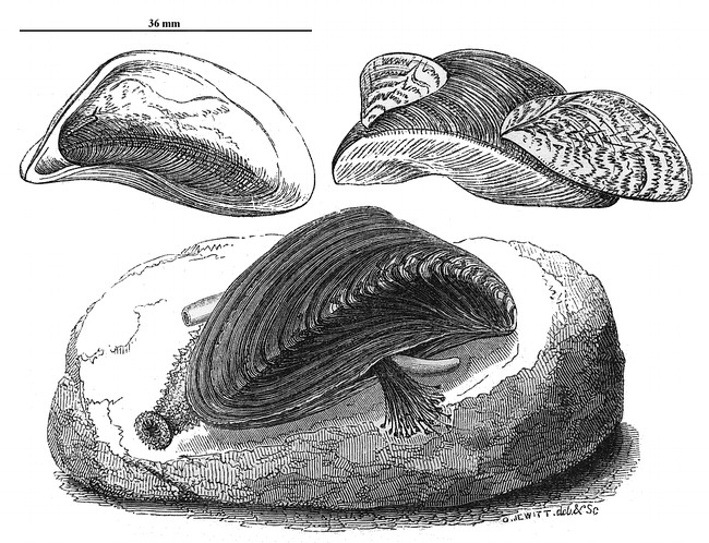 Illustrations. • Dreissena polymorpha (Reeve). DREISSENIDAE. Dreissena polymorpha (Pallas), "Zebra Mussel". From Reeve (1863), with scale added. • Dreissena polymorpha, with Anodonta spp. (Adams). UNIONIDAE. 1, Anodonta cygnea (Linn.), "Swan Mussel"; 2, Anodonta anatina (Linn.), "Duck Mussel". DREISSENIDAE. 3, Dreissena polymorpha (Pallas), "Zebra Mussel". From Adams (1896).