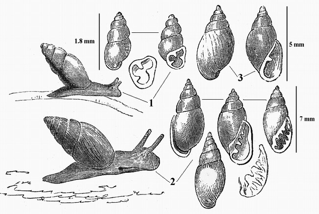 Illustrations. • Carychium minimum, Leucophytia bidentata, Ovatella myosotis (Reeve). ELLOBIIDAE. 1, Carychium minimum Müller, "Least Herald Snail". 2, Ovatella myosotis (Draparnaud), "Mouse-eared Snail". 3, Leucophytia bidentata (Montagu). From Reeve (1863, with scales added). • Carychium minimum, with Aciculidae, Clausiliidae, Cochlicopidae, Ferussaciidae (Adams). ELLOBIIDAE. 9, Carychium minimum Müller, "Least Herald Snail, Sedge Snail". CLAUSILIIDAE. 1a and 1b, Clausilia bidentata (Strom), "Common Door Snail, Two-toothed Snail". 2a and 2b, Macrogastra rolphii (Turton), "Rolph’s Door Snail". 3a and 3b, Cochlodina laminata (Montagu), "Plaited Door Snail", with detail of an oral lamina. 4a and 4b, Balea biplicata (Montagu), "Thames Door Snail". 5, Balea perversa (Linn.), "Tree Snail". COCHLICOPIDAE. 6, Cochlicopa lubrica (Müller), "Slippery Moss Snail". 7a and 7b, Azeca goodalli (Férussac), "Three-toothed Moss Snail". FERUSSACIIDAE. 8, Cecilioides acicula (Müller), "Blind Snail, Agate Snail". ACICULIDAE. 11a, Acicula fusca (Montagu), "Point Snail", with (11a) detail of the operculum. TO BE IDENTIFIED. 12, Stenogyra goodallii Miller, name not located in recent lists, and identity not established. From Adams (1890).