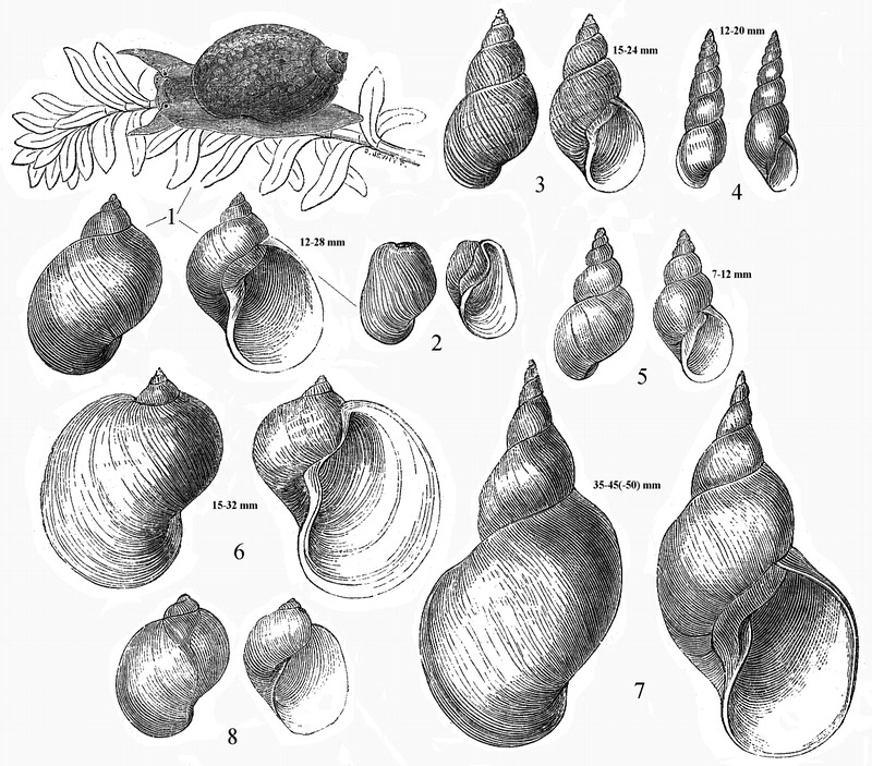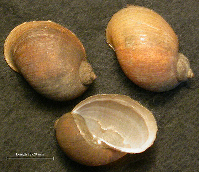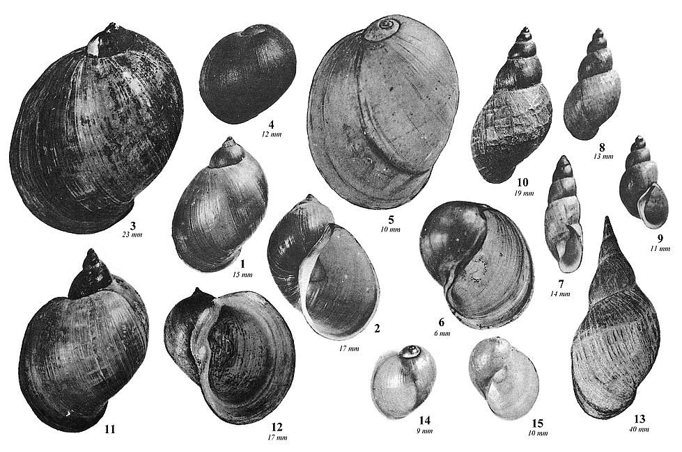 Illustrations. • Lymnaea auricularia, L. glabra, L. palustris, L. peregra, L. stagnalis, L. truncatula, Myxas glutinosa (Reeve). LYMNAEIDAE. 1, Lymnaea peregra (Müller), "Common Pond Snail", "Wandering Pond Snail". 2, Lymnaea involuta Thomson (confined to Co. Cork and Co. Kerry, probably a form of L. peregra). 3, Lymnaea palustris (Müller), "Marsh Pond Snail". 4, Lymnaea glabra (Müller), "Mud Pond Snail". 5, Lymnaea truncatula (Müller), "Dwarf Pond Snail". 6, Lymnaea auricularia (L.), "Ear Pond Snail". 7, Lymnaea stagnalis (L.), "Great Pond Snail". 8, From Reeve (1863), with shell lengths added. • Lymnaea auricularia, L. glabra, L. palustris, L. peregra, L. stagnalis, L. truncatula, Myxas glutinosa (Ellis). LYMNAEIDAE. 1–2, Lymnaea peregra (Müller), "Common Pond Snail", "Wandering Pond Snail". 3–6, varieties of L. peregra: 3, var. ovata; 4, var. burnetti; 5, var. praetenuis; 6, var. involuta. 7, Lymnaea glabra (Müller), "Mud Pond Snail". 8–9, Lymnaea truncatula (Müller), "Dwarf Pond Snail". 10, Lymnaea palustris (Müller), "Marsh Pond Snail". 11 and 12, Lymnaea auricularia (L.), "Ear Pond Snail". 13, Lymnaea stagnalis (L.), "Great Pond Snail". 14 and 15, Myxas glutinosa (Müller), "Mucilaginous Snail". From Ellis (1926), with approximate shell lengths added. • Lymnaea species and Myxas glutinosa, with Ancylidae (Adams). LYMNAEIDAE. 1, Myxas glutinosa (Müller), "Glutinous Snail". 2, Lymnaea involuta Thomson, probably a form of L. peregra. 3b, Lymnaea peregra (Müller), "Common Pond Snail, Wandering Pond Snail". 3a and 3e, Lymnaea ovata (Draparnaud), probably also a form of L. peregra. 4, Lymnaea auricularia (Linn.), "Ear Pond Snail". 5, Lymnaea stagnalis (Linn.), "Great Pond Snail". 6, Lymnaea palustris (Müller), "Marsh Pond Snail". 7, Lymnaea truncatula (Müller), "Dwarf Pond Snail". 8, Lymnaea glabra (Müller), "Mud Pond Snail". ANCYLIDAE. 9, Ancylus fluviatilis Müller, "River Limpet". 10, Acroloxus lacustris (Linn.), "Lake Limpet". From Adams (1896). • Lymnaea peregra (L.W.). Limnaea peregra. Canal, Leek, Staffs. November 1949.