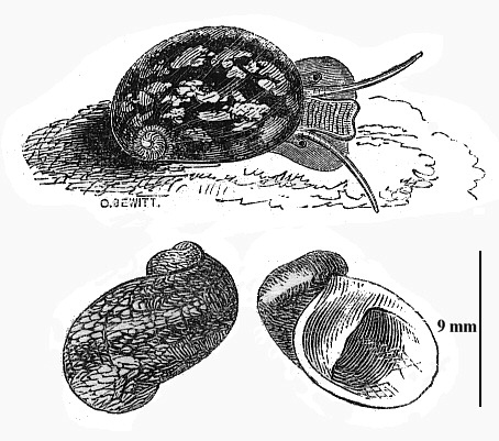 Illustrations. • Theodoxus fluviatilis (Reeve). NERITIDAE. Theodoxus fluviatilis (L.), "River Nerite". From Reeve (1863), with approximate scale added. • Theodoxus fluviatilis, with other Gastropoda-Prosobranchia (Adams). NERITIDAE. 4, Theodoxus fluviatilis (Linn.), "River Nerite". VIVIPARIDAE. 5, Viviparus contectus (Millet), "Lister's River Snail"; 6, Viviparus viviparus (Linn.), "Common River Snail". BITHYNIIDAE. 7, Bithynia tentaculata (Linn.), "Common Bithynia"; 8, Bithynia leachii (Sheppard), "Leach's Bithynia". VALVATIDAE. 9, Valvata piscinalis (Müller), "Common Valve Snail"; 10, Valvata cristata Müller, "Flat Valve Snail". HYDROBIIDAE. 11, Mercuria confusa (Frauenfeld), "Swollen Spire Snail". 12, Hydrobia ventrosa (Montagu), "Spire Snail". 13, Potamopyrgus antipodarum (Gray), "Jenkins's Spire Snail". POMATIASIDAE. 14, Pomatias elegans (Müller), "Round-mouthed Snail". ACICULIDAE. 15, Acicula fusca (Montagu), "Point Snail", with detail of the operculum. From Adams (1896).