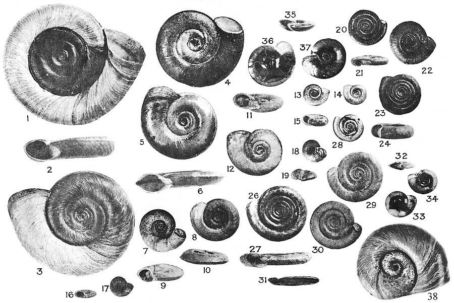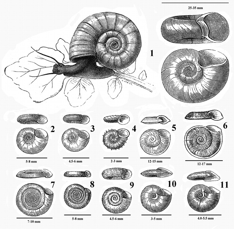 Illustrations. • Anisus, Bathyomphalus, Gyraulus, Menetus, Planorbarius, Planorbis and Segmentina (with Physidae: Adams). PLANORBIDAE. 1, Segmentina nitida (Müller), "Shiny Ram's-horn". 2, Hippeutis complanatus (Linn.), "Flat Ram's-horn". 3, Gyraulus crista (Linn.), "Nautilus Ram's-horn". 4, Gyraulus albus (Müller), "White Ram's-horn". 5, cf. Gyraulus laevis (Alder), "Smooth Ram's-horn" (referred by Adams to Planorbis parvus Say.). 6, Anisus leucostoma (Millet), "Button Ram's-horn, White-lipped Ram's-horn". 7, Anisus vortex (Linn.), "Whirlpool Ram's-horn". 8, Planorbis carinatus Müller, "Keeled Ram's-horn". 9, Planorbis planorbis (Linn.), "Margined Ram's-horn". 10, Planorbarius corneus (Linn.), "Giant Ram's-horn". 11, Bathyomphalus contortus (Linn.), "Twisted Ram's-horn". 12, Menetus dilatatus (Gould), "Trumpet Ram's-horn". PHYSIDAE. 13, Aplexa hypnorum (Linn.), "Moss Bladder Snail"; 14, Physa fontinalis (Linn.), "Common Bladder Snail". From Adams (1896). • Anisus, Bathyomphalus, Gyraulus, Hippeutis, Planorbarius, Planorbis, Segmentina (Reeve). PLANORBIDAE. 1, Planorbarius corneus (L.), "Giant Ram's-horn". 2, Gyraulus albus (Müller), "White Ram's-horn". 3, Gyraulus laevis (Alder), "Smooth Ram's-horn". 4, Gyraulus crista (L.), "Nautilus Ram's-horn". 5, Planorbis carinatus Müller, "Keeled Ram's-horn". 6, Planorbis planorbis (L.), "Margined Ram's-horn". 7, Anisus vortex (L.), "Whirlpool Ram's-horn". 8, Anisus leucostoma (Millet), "Button Ram's-horn" or "White-lipped Ram's-horn". 9, Bathyomphalus contortus (L.), "Twisted Ram's-horn". 10, Hippeutis complanatus (L.), "Flat Ram's-horn". 11, Segmentina nitida (Müller), "Shiny Ram's-horn". From Reeve (1863, with scales added). • Anisus, Bathyomphalus, Gyraulus, Hippeutis, Menetus, Planorbarius, Planorbis, Segmentina (Ellis). PLANORBIDAE. 1–3, Planorbis planorbis (Linn.), "Margined Ram's-horn" (12–17 mm). 4–6, Planorbis carinatus Müller, "Keeled Ram's-horn" (12–15 mm). 7–10, Gyraulus acronicus (Férussac), "Thames Ram's-horn" (6–10 mm). 11 and 12, Gyraulus albus (Müller), "White Ram's-horn" (5–8 mm). 13–15, Gyraulus laevis (Alder), "Smooth Ram's-horn" (4.5–6 mm). 16 and 17, Gyraulus crista (Linn.), "Nautilus Ram's-horn" (2–3 mm). 18 and 19, Menetus dilatatus (Gould), "Trumpet Ram's-horn" (3–4 mm). 20 and 21, Anisus leucostoma (Millet), "Button Ram's-horn, White-lipped Ram's-horn" (5–8 mm). 22–24, iBathyomphalus contortus (Linn.), "Twisted Ram's-horn" (4.5–6 mm). 25–27, Anisus vortex (Linn.), "Whirlpool Ram's-horn" (7–10 mm). 28–31, Anisus vorticulus (Troschel) 3.5–6 mm. 32–34, Hippeutis complanatus (Linn.), "Flat Ram's-horn" (3–5 mm). 35–37, Segmentina nitida (Müller), "Shiny Ram's-horn" (4–5.5 mm). 38, Planorbarius corneus (Linn.), "Giant Ram's-horn" (25–35 mm). From Ellis (1926). • Planorbis corneus (J.A.). Planorbis corneus. Droylsden Canal, Manchester, J. Armitage. November 1950.