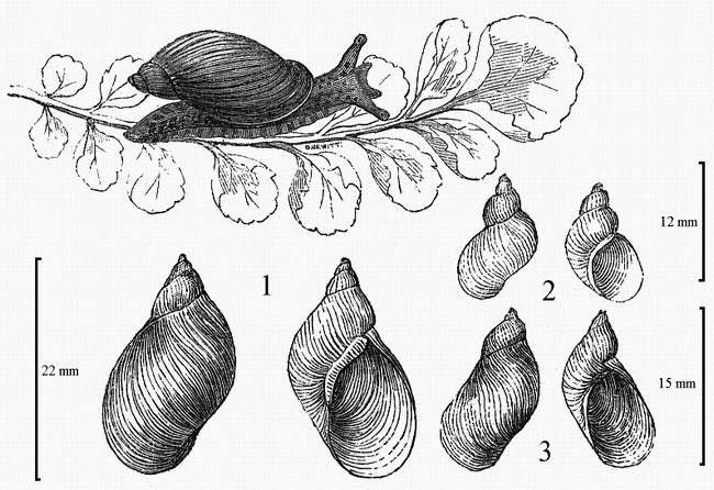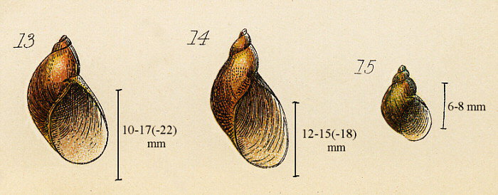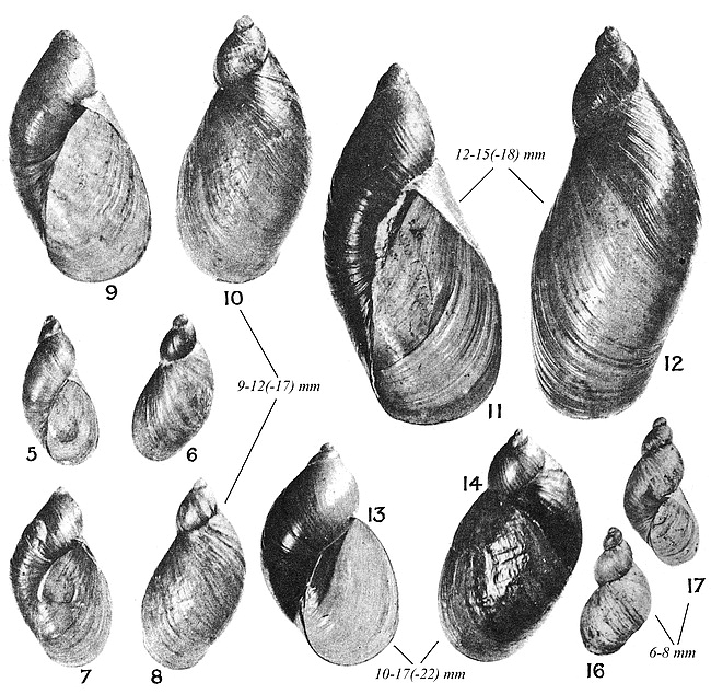 Illustrations. • Oxyloma pfeifferi, O. sarsi, Succinea oblonga, S. putris (Ellis). SUCCINEIDAE. 5–10, Oxyloma pfeifferi (Rossmässler), "Pfeiffer's Amber Snail". 11 and 12, Oxyloma sarsi (Esmark), "Slender Amber Snail". 13 and 14, Succinea putris (Linn.), "Large Amber Snail". 16 and 17, Succinea oblonga Draparnaud, "Small Amber Snail" (var. agonostoma). From Ellis (1926, with dimensions added). • Oxyloma, Succinea (Adams). SUCCINEIDAE. 13, Succinea putris (Linn.), "Large Amber Snail". 14, Oxyloma sarsi (Esmark)?; referred by Adams to Succinea elegans Risso, the shell shape compares well with that of O. sarsi, but see also the closely similar Succinea pfeifferi (Rossmässler). 15, Succinea oblonga Draparnaud, "Small Amber Snail". From Adams (1896). • Oxyloma pfeifferi, Succinea oblonga, Succinea putris (Reeve). SUCCINEIDAE. 1, Succinea putris (L.), "Large Amber Snail"; 2, Succinea oblonga Draparnaud, "Small Amber Snail". 3, Oxyloma pfeifferi (Rossmässler) or O. sarsi (Esmark)? From Reeve (1863, with approximate scales added).