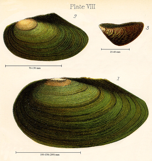 Illustrations. • Bivalvia: Margaritifera, Musculium, Pisidium, Sphaerium, Unio (Adams). SPHAERIIDAE. 1, Sphaerium corneum (Linn.), "Horny Orb Mussel"; 2, Sphaerium rivicola (Lamarck), "Nut Orb Mussel, River Orb Mussel". 3, Musculium transversum (Say), "Oblong Orb Mussel"; 4, Musculium lacustre (Müller), "Lake Orb Mussel, Capped Orb Mussel". 5, Pisidium amnicum (Müller), "River Pea Shell, Giant Pea Shell"; 6, Pisidium pulchellum Jenyns; 7, Pisidium obtusale (Lamarck); 8, Pisidium nitidum Jenyns; 9, Pisidium milium Held, "Rosy Pea Shell". UNIONIDAE. 10, Unio tumidus Philipsson, "Swollen River Mussel:; 11, Unio pictorum (Linn.), "Painter's Mussel". MARGARITIFERIDAE. 12, Margaritifera margaritifera (Linn.), "Freshwater Pearl Mussel, Scottish Pearl Mussel". From Adams (1896). • Bivalvia: Anodonta and Dreissena (Adams). UNIONIDAE. 1, Anodonta cygnea (Linn.), "Swan Mussel"; 2, Anodonta anatina (Linn.), "Duck Mussel". DREISSENIDAE. 3, Dreissena polymorpha (Pallas), "Zebra Mussel". From Adams (1896).