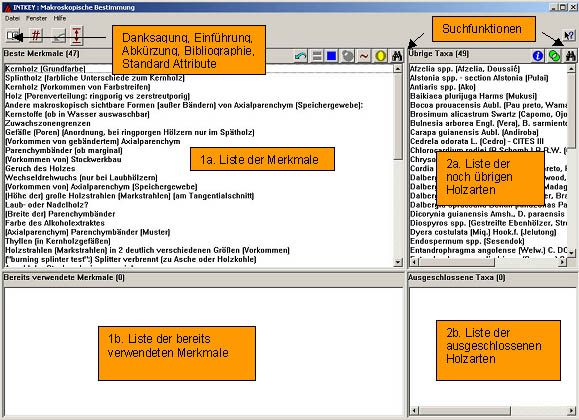 Der Intkey Bildschirm ist in vier Felder unterteilt (1a; 1b; 2a; 2b der Abbildung oben), die dem Nutzer erlaubt, die einzelnen Schritte des Verlaufes einer Identifikation zu verfolgen.