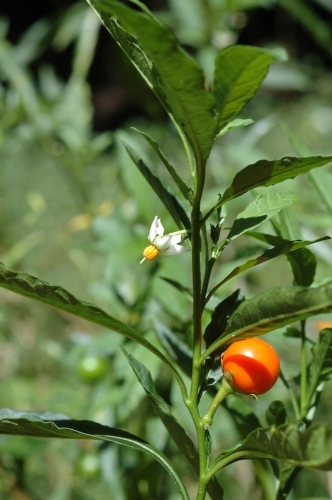 Fruits. Fruiting calyx lobes less than half length of mature fruit, prickles absent. Mature fruits 1–2 per inflorescence, globular, 10–15 mm diameter, red or orange, pedicels 8–15 mm long, pedicels 0.5–1 mm thick at mid-point. Seeds white or pale yellow, 3–4 mm long.